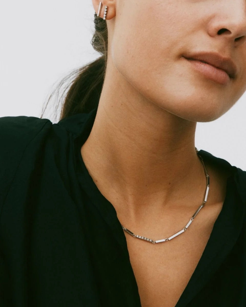 Twiggy Necklace Multi Steel fra Edblad. Twiggy-serien er et moderne uttrykk for Quiet Luxury – selvsikker, nedtonet og perfekt til både hverdag og fest. Dette multihalskjedet er en tolkning av et collier-halskjede, der arkitektoniske barer i to ulike størrelser kombineres med seks glitrende kubiske zirkoner som beveger seg vakkert mot huden. Kjedet er laget i blankt rustfritt stål, er nikkeltrygt og vannbestandig.