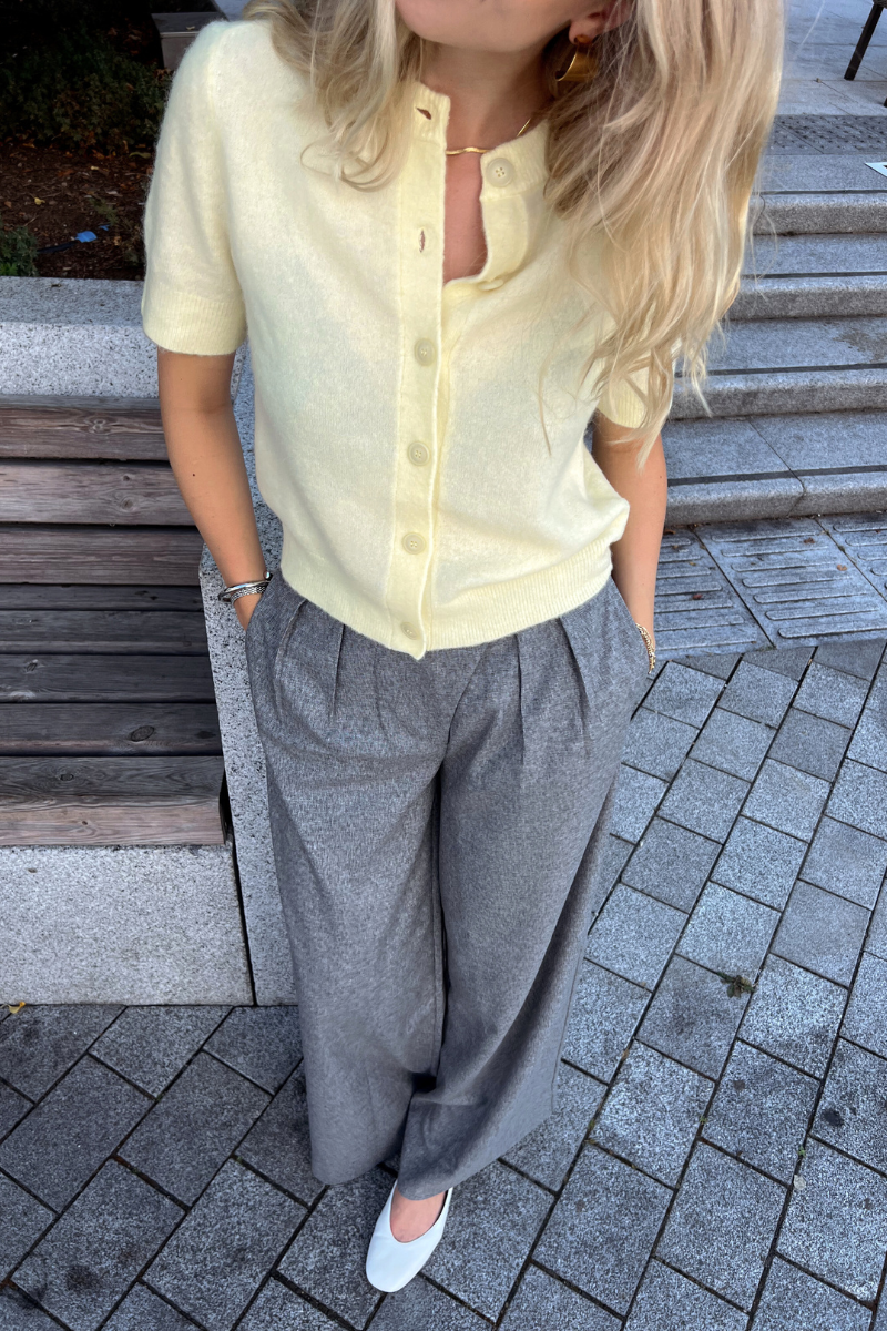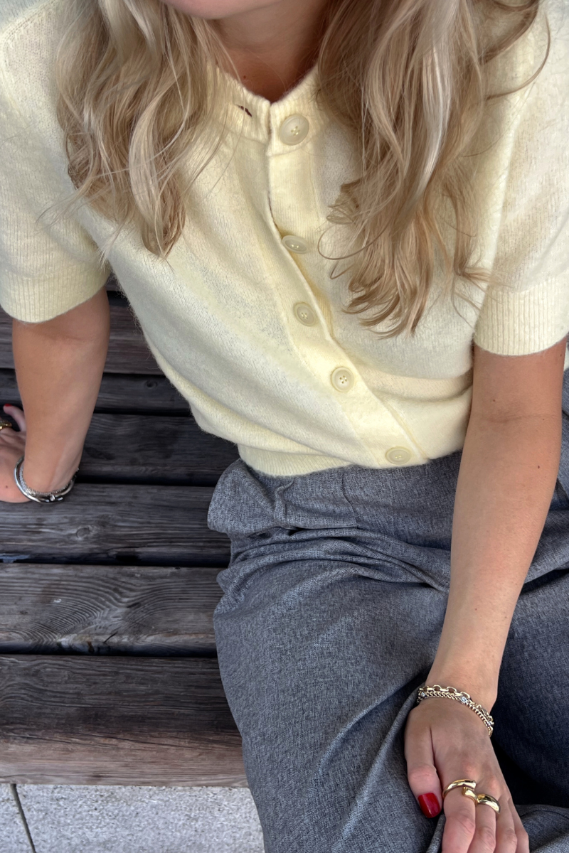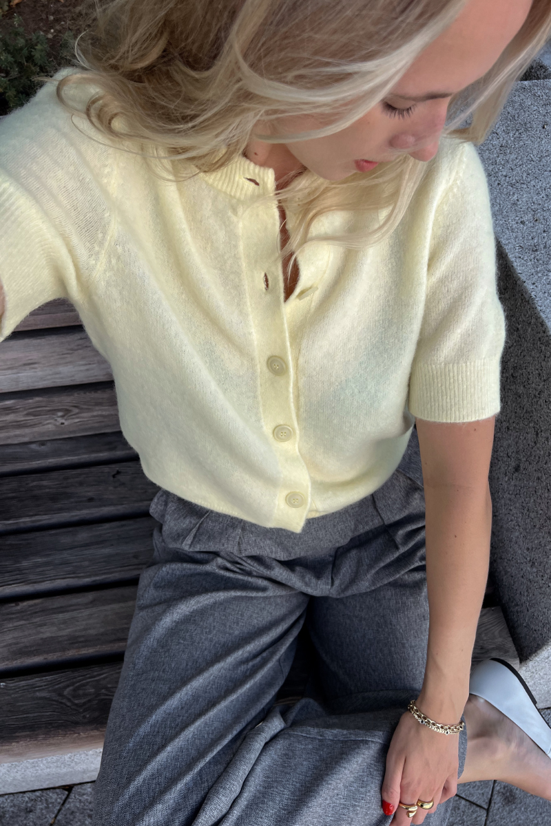 Sanoura SS Cardigan 15556 fra Samsøe & Samsøe. Søt kortermet cardigan med normal passform og rund hals. Lukkes med knapper foran og har ribbestrikket krage, mansjetter og kant. Normal i størrelsen.