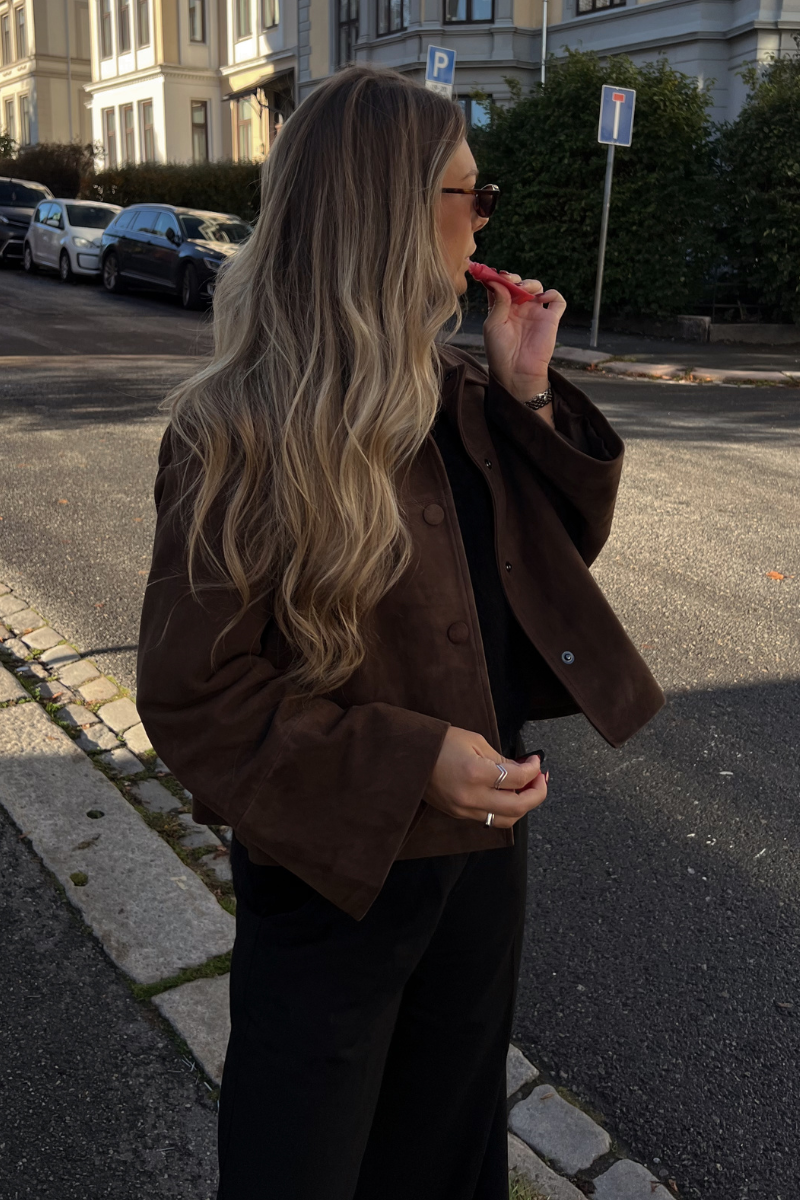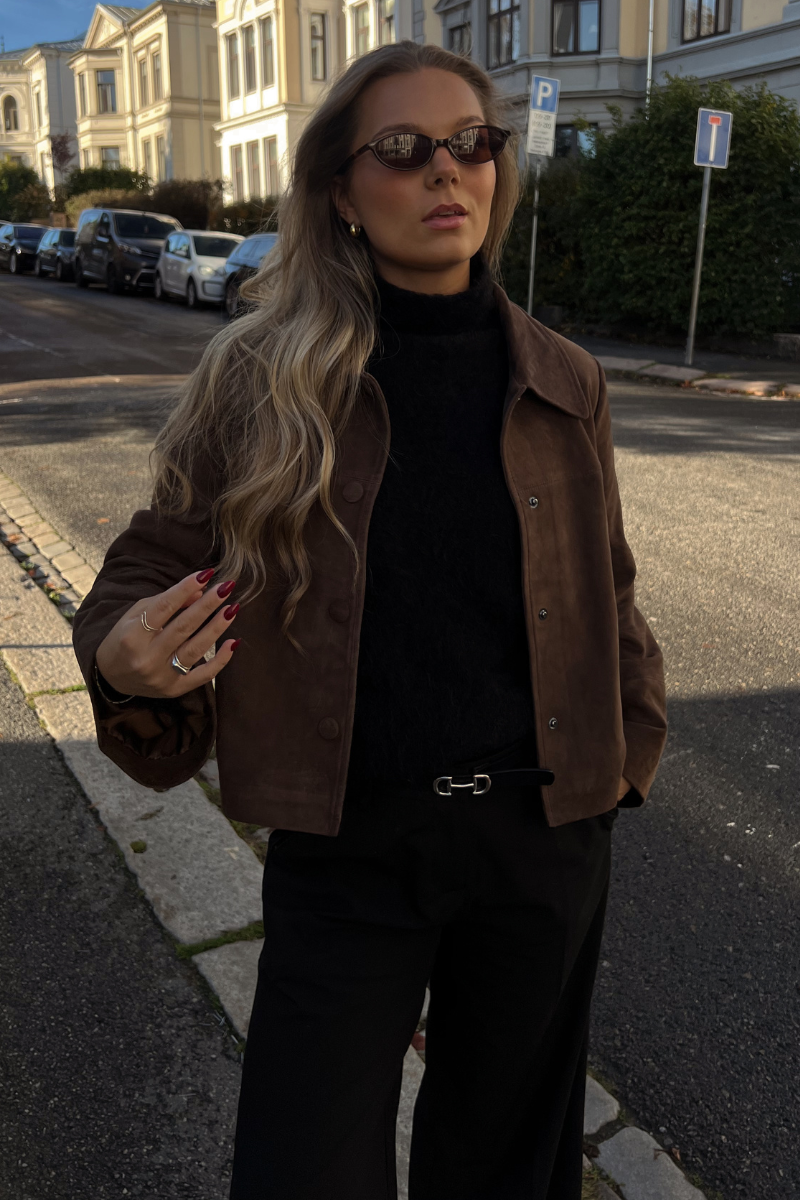 Gustava Suede Jacket fra Urban Pioneers Atelier. Gustava Suede Jacket er en tidløs og elegant jakke laget av 100% geiteskinn. Den klassiske silhuetten og knappelukkingen i front gir et sofistikert uttrykk, mens den myke skinnkvaliteten tilfører et luksuriøst preg. Perfekt til både lag-på-lag-styling og som et statement-plagg i hverdagen. Jakken er normal i størrelsen. Avtagbart belte følger med.