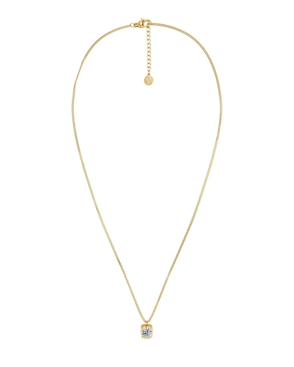 Gemma Necklace Gold fra Edblad. Gemma Necklace kombinerer rebelsk glamour med et elegant uttrykk. Den glitrende, runde steinen er innfattet i en geometrisk form som gir et moderne preg, festet til en lett avrundet firkant som henger fra et delikat kjede i 14K gullbelegg. Perfekt alene eller kombinert med hoops, studs, armbånd eller ring fra samme serie.