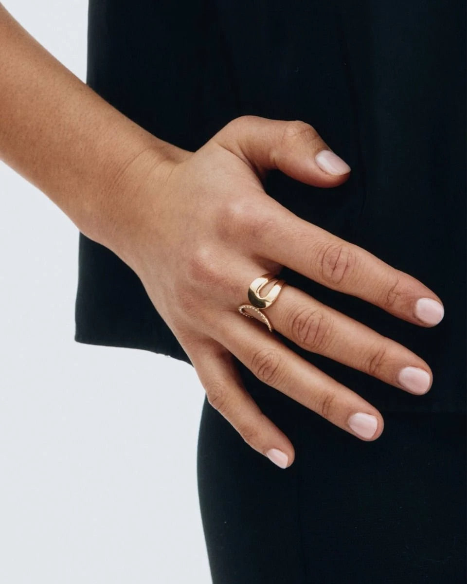 Plié Ring Gold fra Edblad. Plié-serien fokuserer på ørene, men inkluderer også en ring som utfyller øredobbenes delikate og uttrykksfulle former – inspirert av den klassiske ballettposisjonen. Ringen i blankt 14K gullbelegg på rustfritt stål har to buede skinner: en tynnere besatt med glitrende kubiske zirkoner, og en bredere med glatt overflate. Resultatet er et feminint og balansert uttrykk som passer like fint alene som sammen med andre smykker i serien. Onesize.