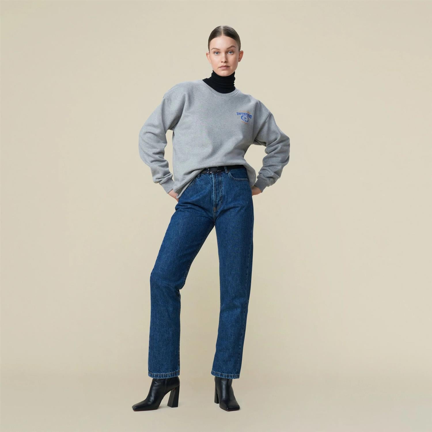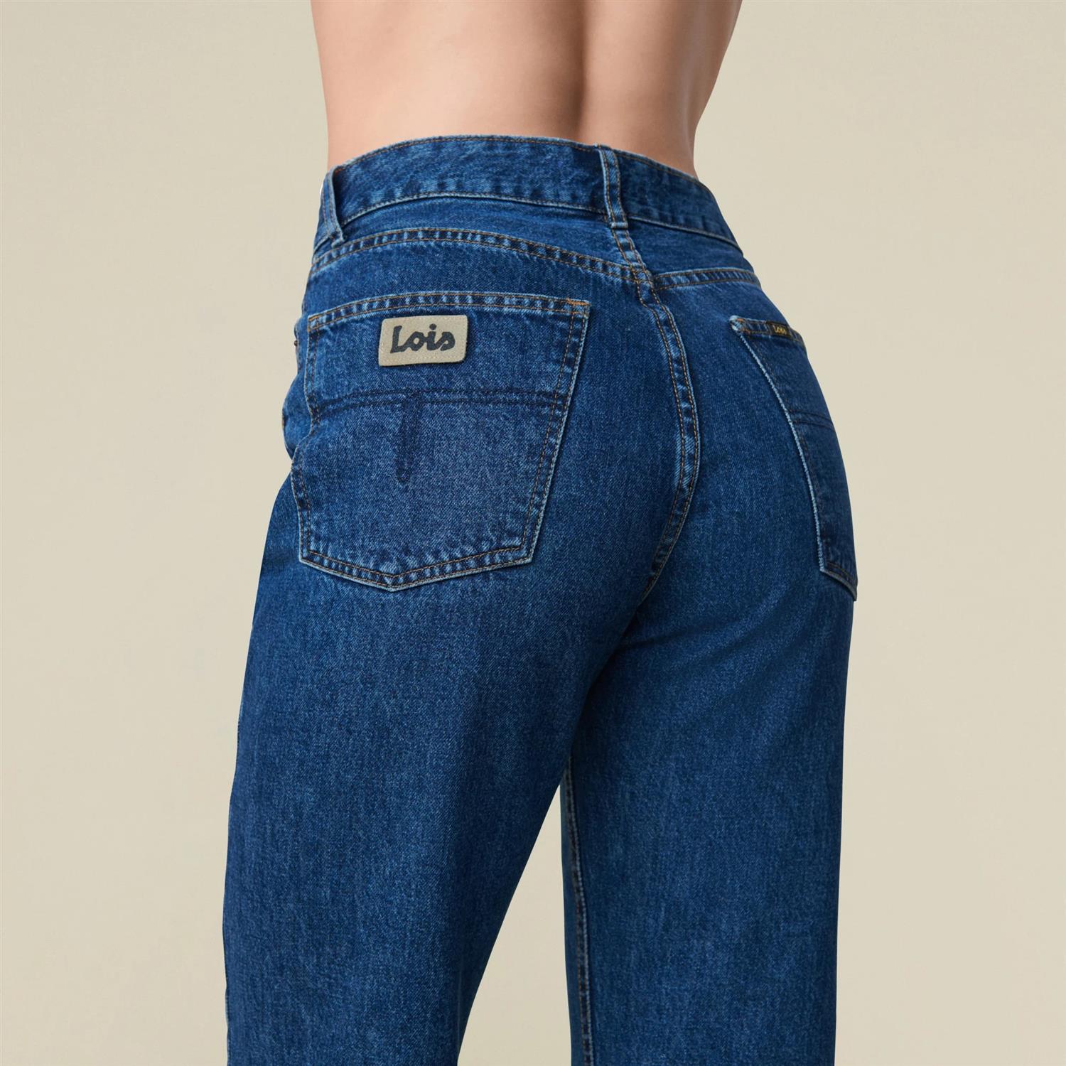 Dana Jackson Dark Pierda fra Lois. Dana er Lois sin versjon av pappabuksen med løs passform og rette ben. Den har middels liv, knappesmekk og et avslappet antifit-design med kort lengde og ødelagt-effekter. Buksen er laget i stivt denim uten stretch. Normal i størrelsen.