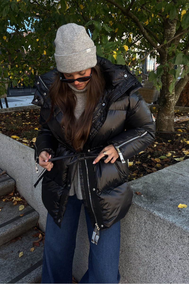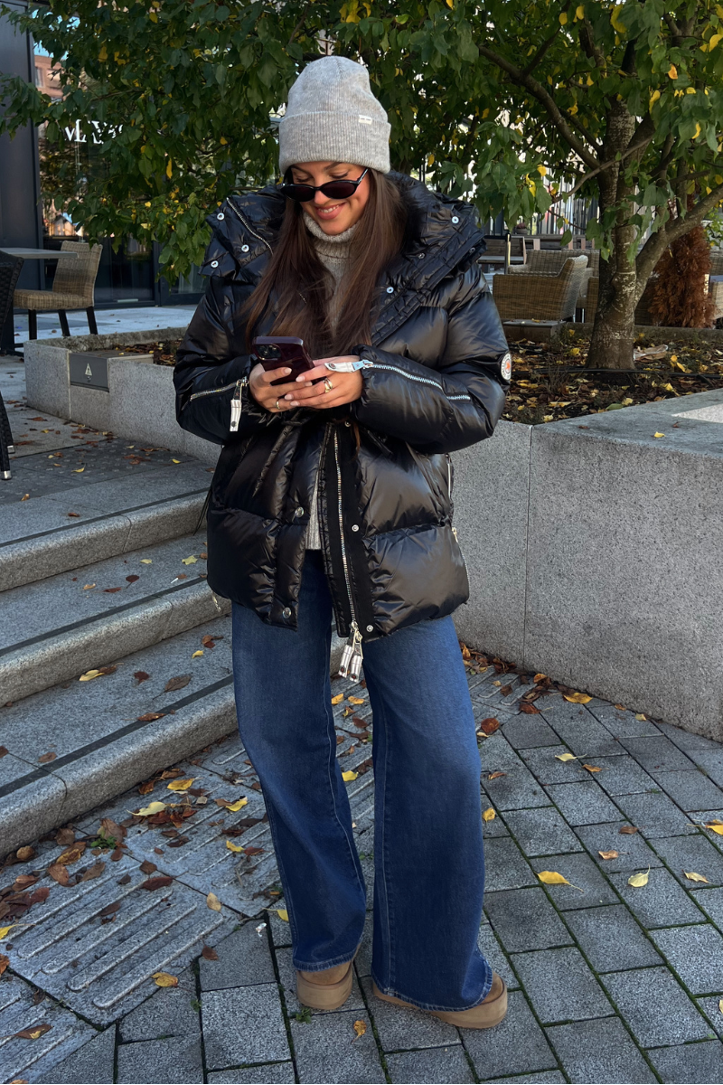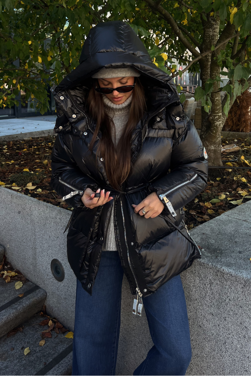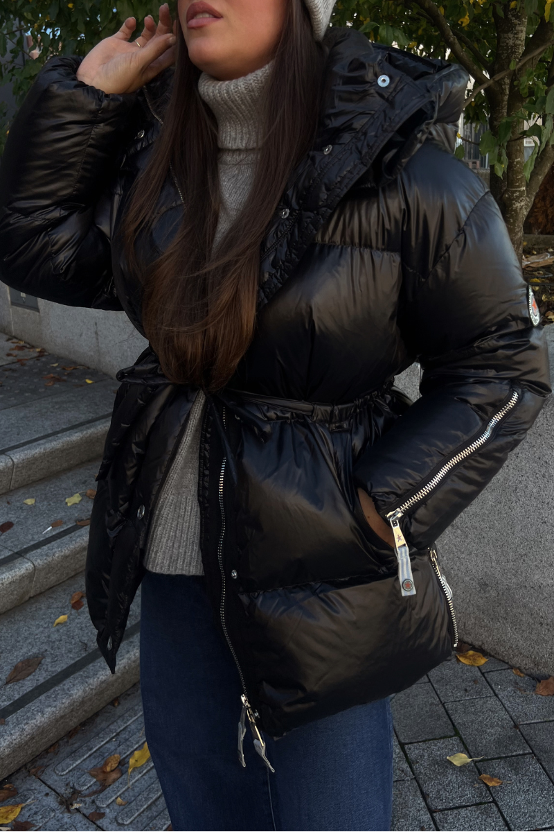 Jackie Black fra CAYA. Jackie er en bestselger fra det norske C.A.Y.A – en feminin og funksjonell jakke som kombinerer varme, komfort og stil. Den har en flatterende passform med justerbar snøring i midjen. Myk fleece i lommene for ekstra komfort, mens praktiske detaljer som to-veis glidelås, trykknapper og glidelåser i sider og ermer gjør den både allsidig og brukervennlig. En lett, men varm dunjakke som passer like godt i byen som på fjellet. Normal i størrelsen.