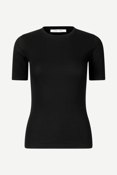 Saalexo T-Shirt 7542 fra Samsøe & Samsøe. Saalexo T-Shirt 7542 er en slim fit t-skjorte med korte ermer og rund hals, perfekt for en moderne og stilren garderobe. Laget i ribbestrikket jersey av økologisk bomull og elastan, gir den både komfort, stretch og bevegelsesfrihet. Normal i størrelsen.
