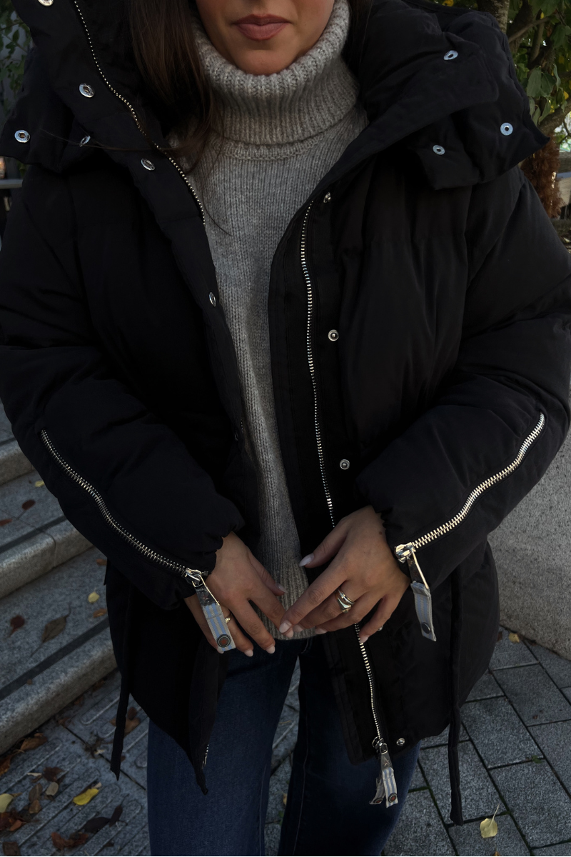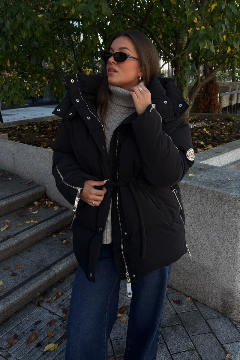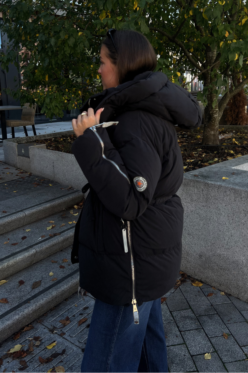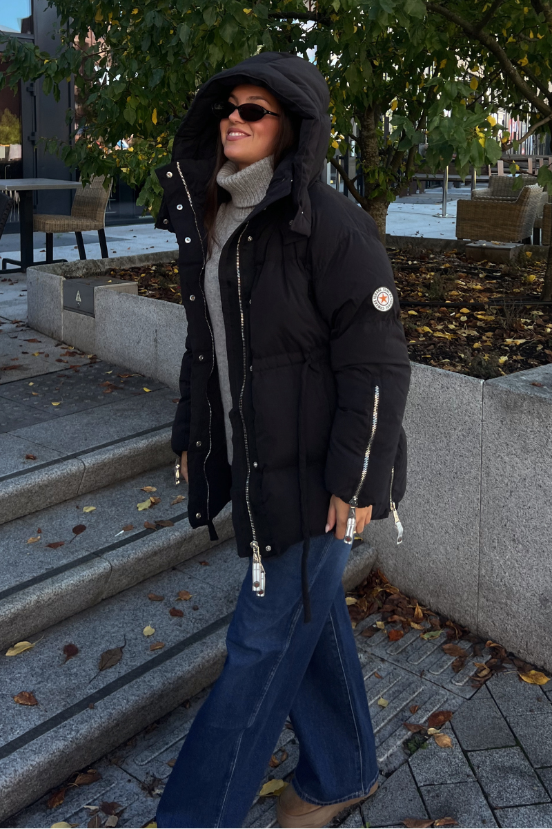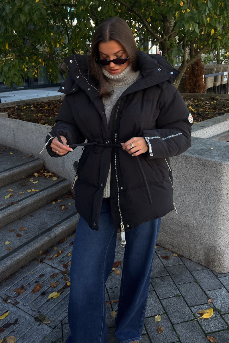 Jackie Matt Black fra CAYA. Jackie er en bestselger fra det norske C.A.Y.A – en feminin og funksjonell jakke som kombinerer varme, komfort og stil. Den har en flatterende passform med justerbar snøring i midjen. Myk fleece i lommene for ekstra komfort, mens praktiske detaljer som to-veis glidelås, trykknapper og glidelåser i sider og ermer gjør den både allsidig og brukervennlig. En lett, men varm dunjakke som passer like godt i byen som på fjellet. Normal i størrelsen.