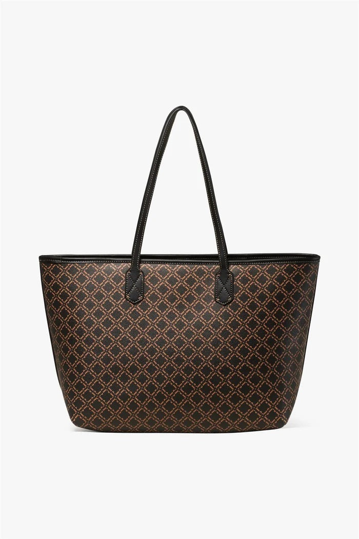 Ultimate Monogram Tote fra Arnie Says. Ultimate Monogram Tote er en mellomstor skulderveske i imitert skinn med et stilrent og funksjonelt design. Vesken har et romslig hovedrom med klips-lukking, samt en liten innvendig sidelomme med glidelås for trygg oppbevaring av verdisaker. Praktiske håndtak gjør den enkel å bære, enten til hverdags eller på farten.