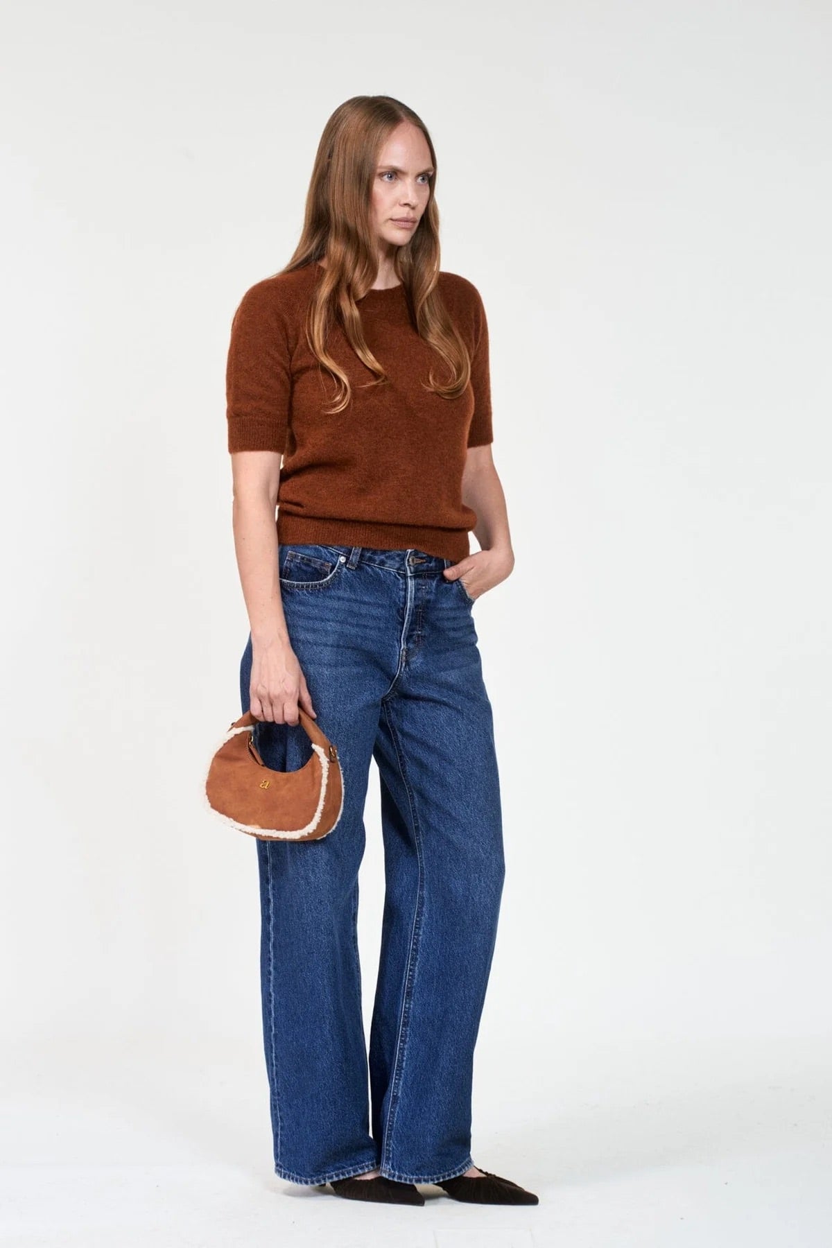 Noella Shearling fra Arnie Says. Noella Shearling er en liten statement-veske i myk imitert semsket skinn med dekorative teddykanter som gir et lunt og eksklusivt uttrykk. Den avrundede silhuetten og solide hanken gjør vesken både sjarmerende og funksjonell – perfekt til sesongens strikk og yttertøy. Gullfarget logo i front tilfører et elegant preg.