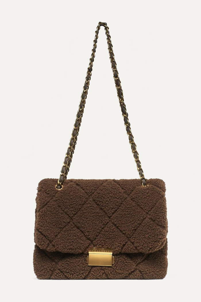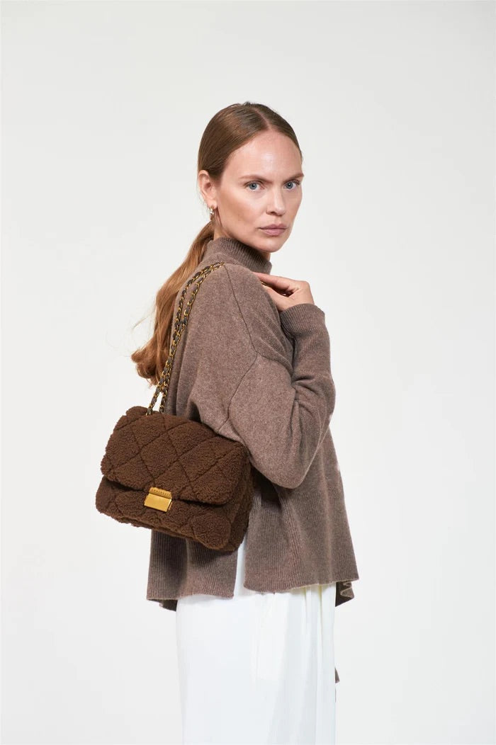 Charlie Teddy fra Arnie Says. Charlie Teddy er en enkel og elegant veske i myk teddykvalitet med metallisk lukking. Den har tre romslige hovedrom og en praktisk glidelåslomme for små eiendeler. Med sitt stilrene design og fleksible bæremuligheter kan vesken bæres både over skulderen og som crossbody.