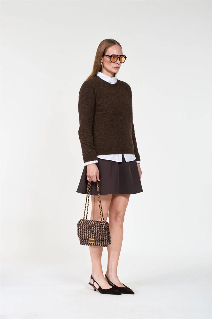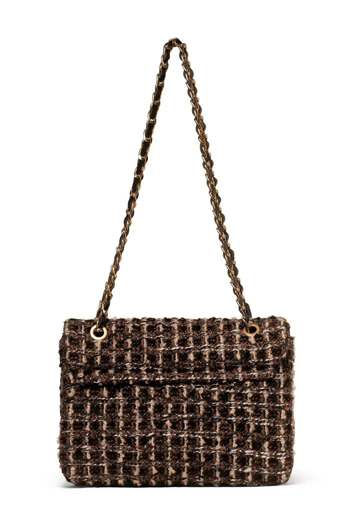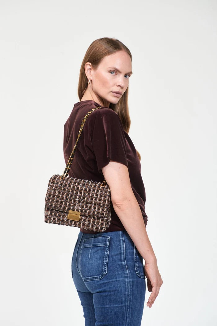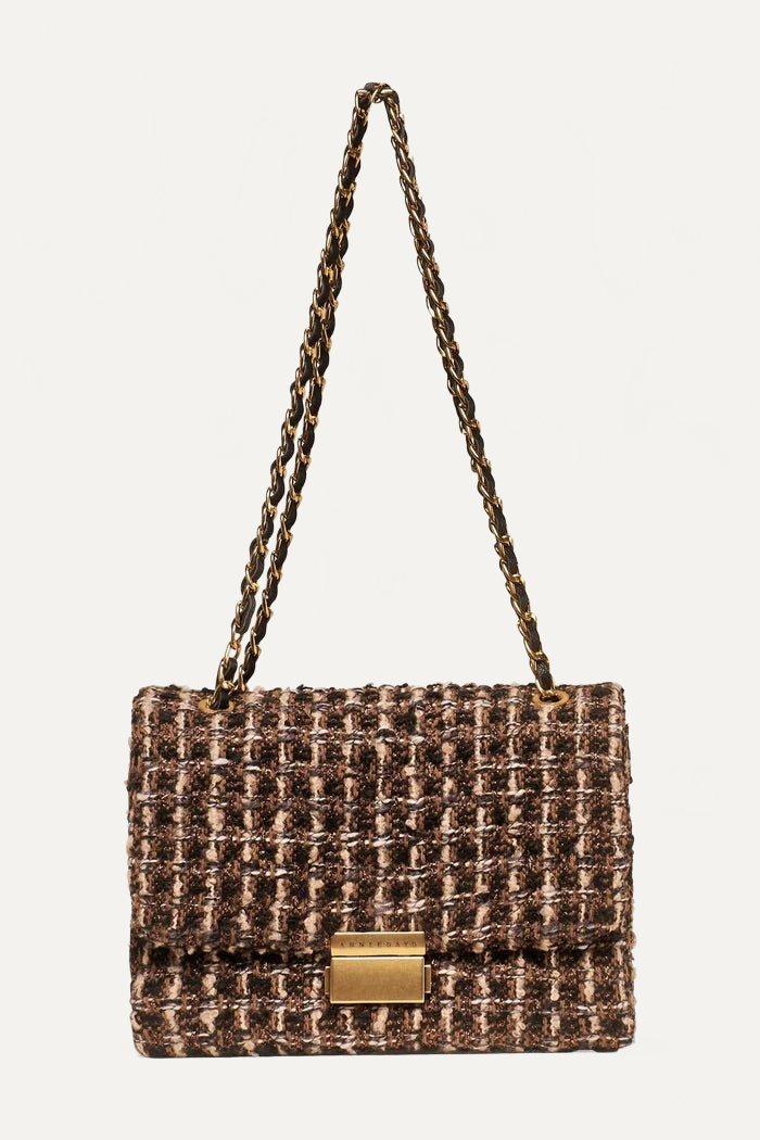 Charlie Tweed fra Arnie Says. Charlie Tweed er en tidløs veske i klassisk tweed med elegant metallisk lukking. Den har tre romslige hovedrom og en praktisk glidelåslomme for små eiendeler. Med sitt sofistikerte uttrykk og fleksible bæremuligheter kan vesken bæres både over skulderen og som crossbody.