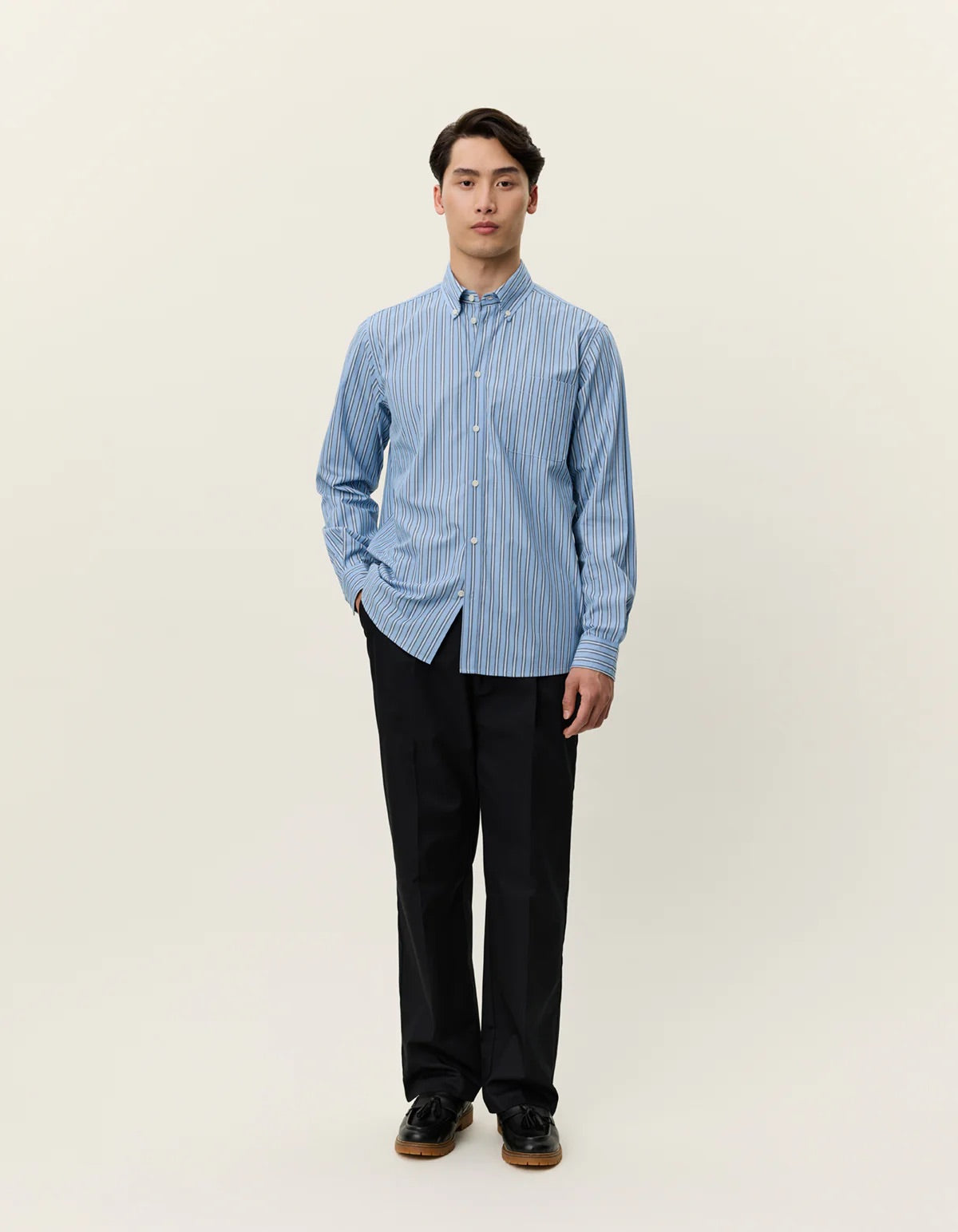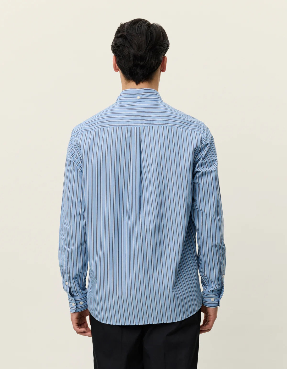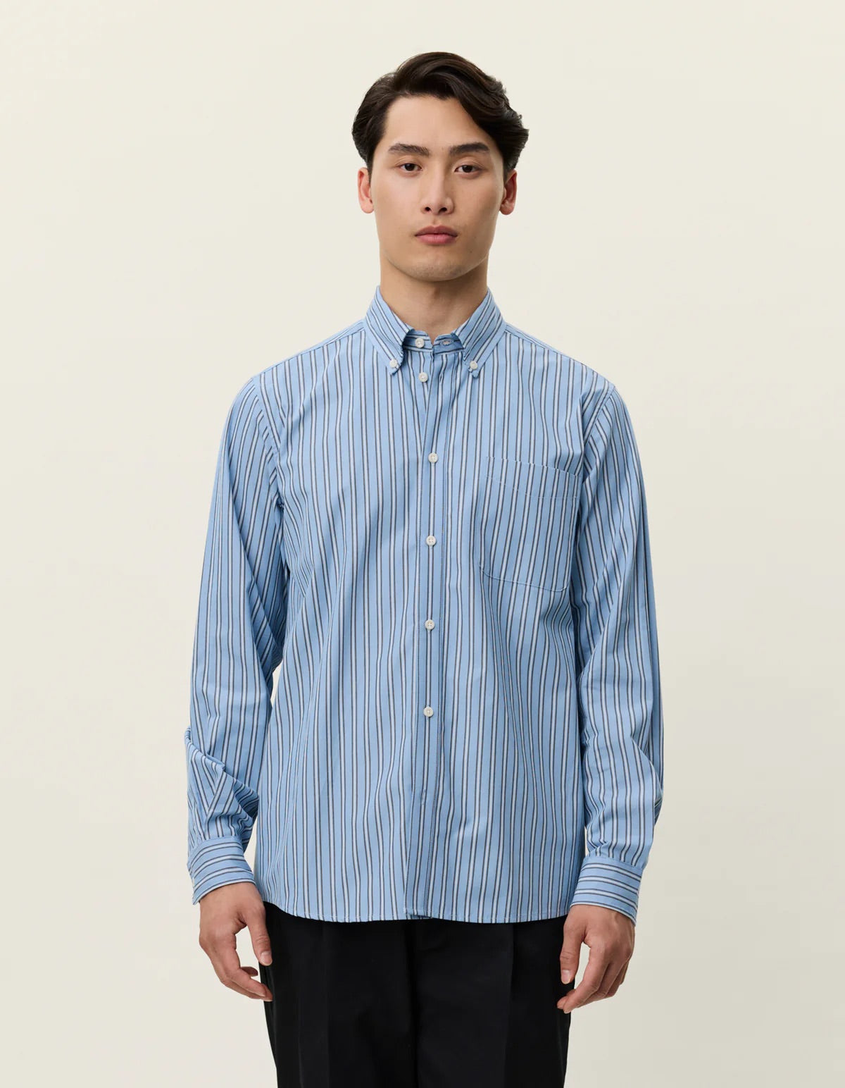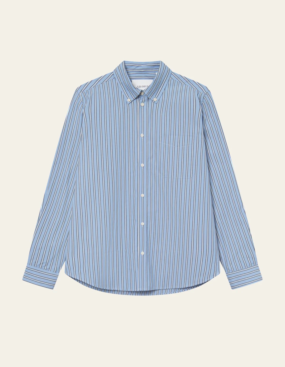 Kent Stripe Poplin Shirt fra Les Deux. Denne løstsittende skjorten er laget av mykvasket, økologisk bomullspoplin med et tidløst stripemønster. Den har en klassisk button-down-krage, brystlomme og box-plissering med hempe bak som gir ekstra bevegelsesfrihet. Skjorten er ferdigstilt med knappelukking foran og justerbare mansjetter – et allsidig plagg som kombinerer komfort, kvalitet og klassisk stil. Normal i størrelsen.