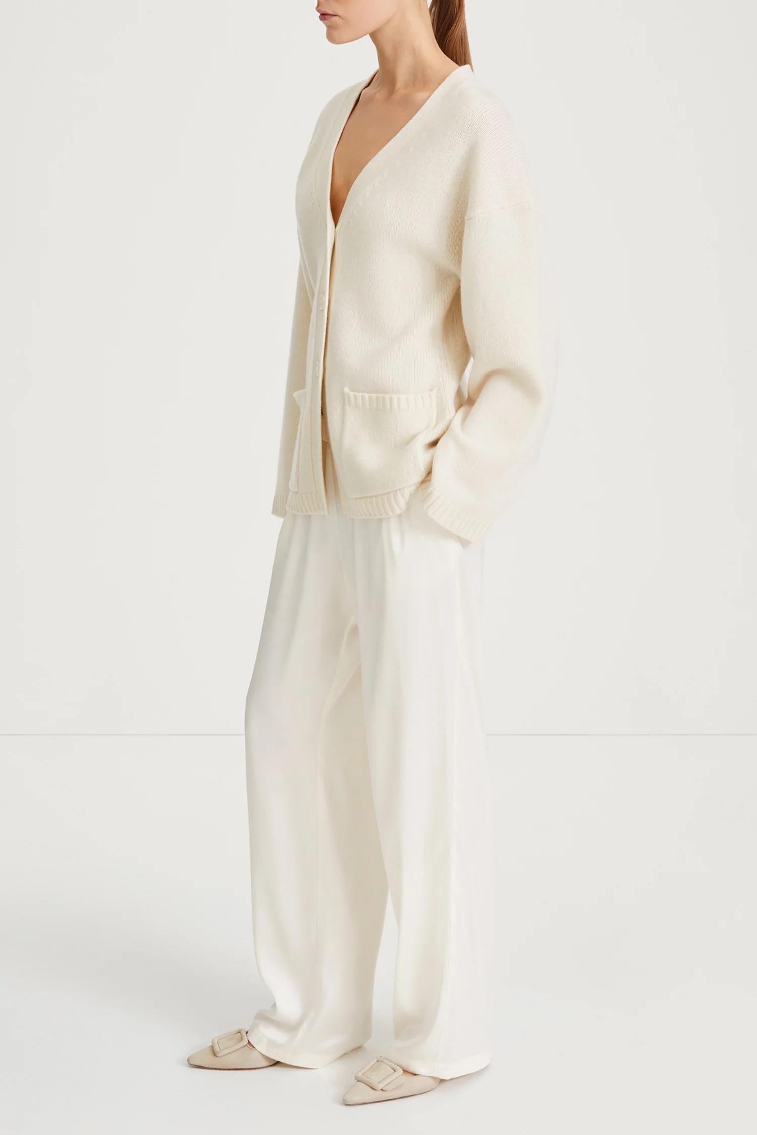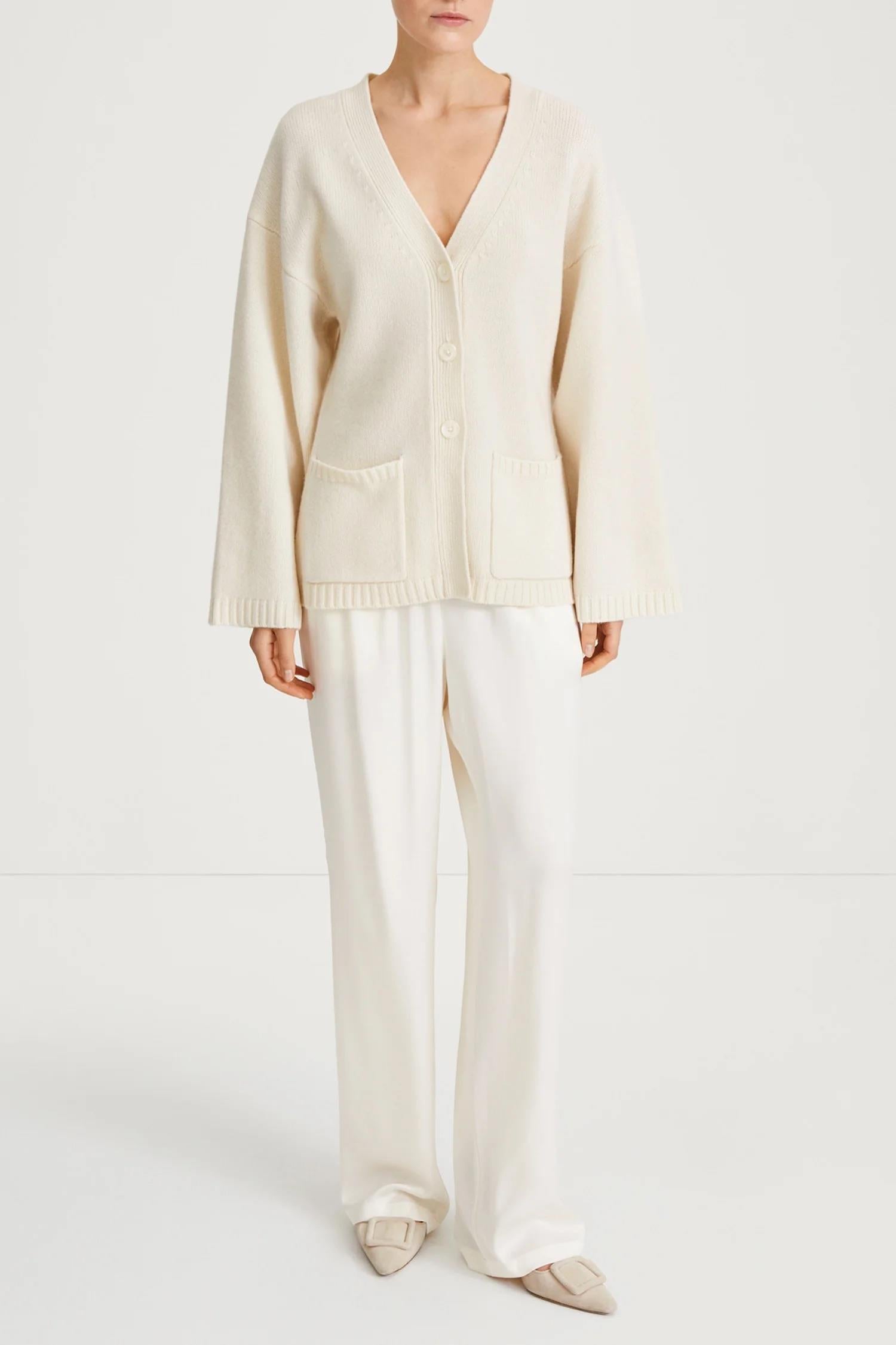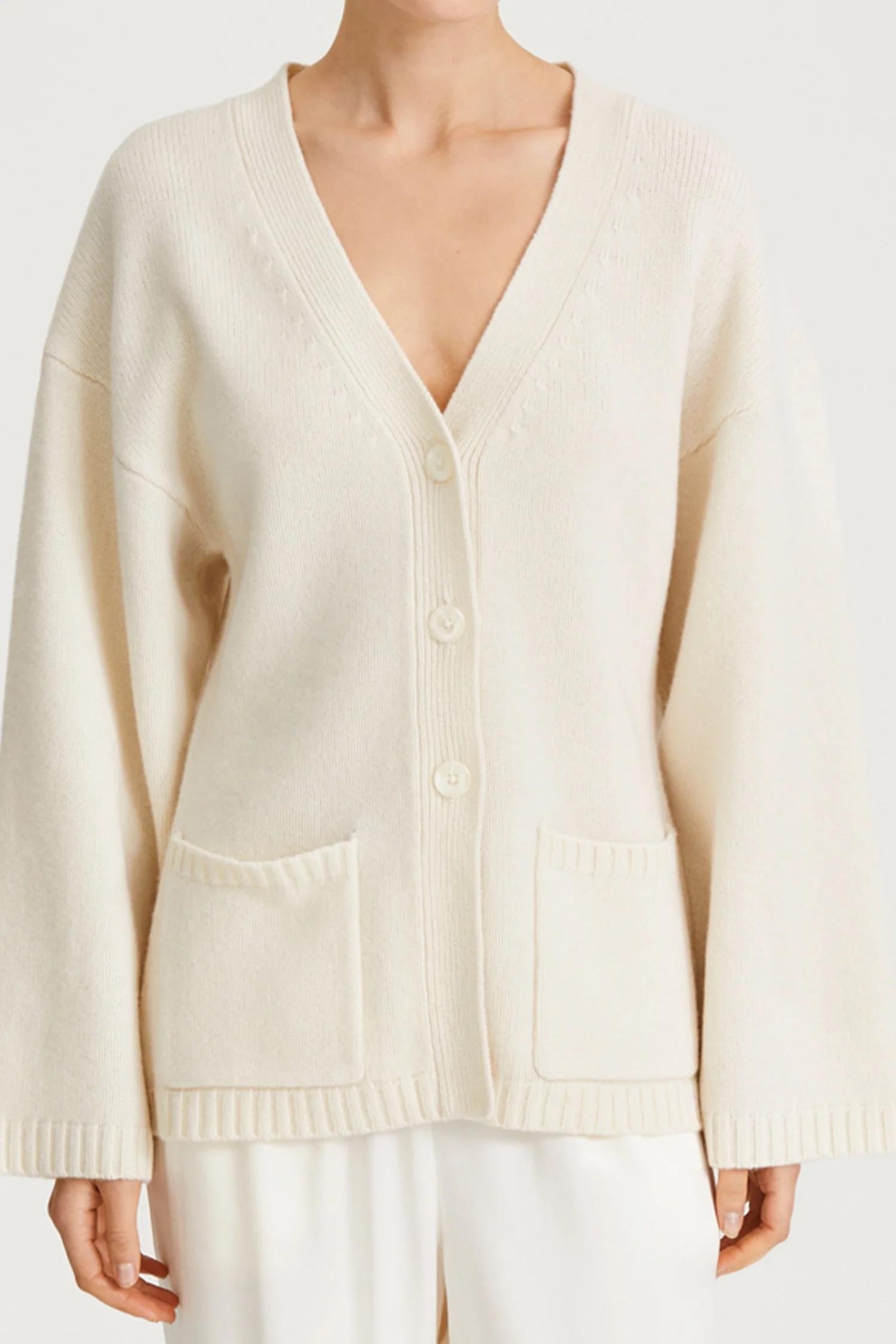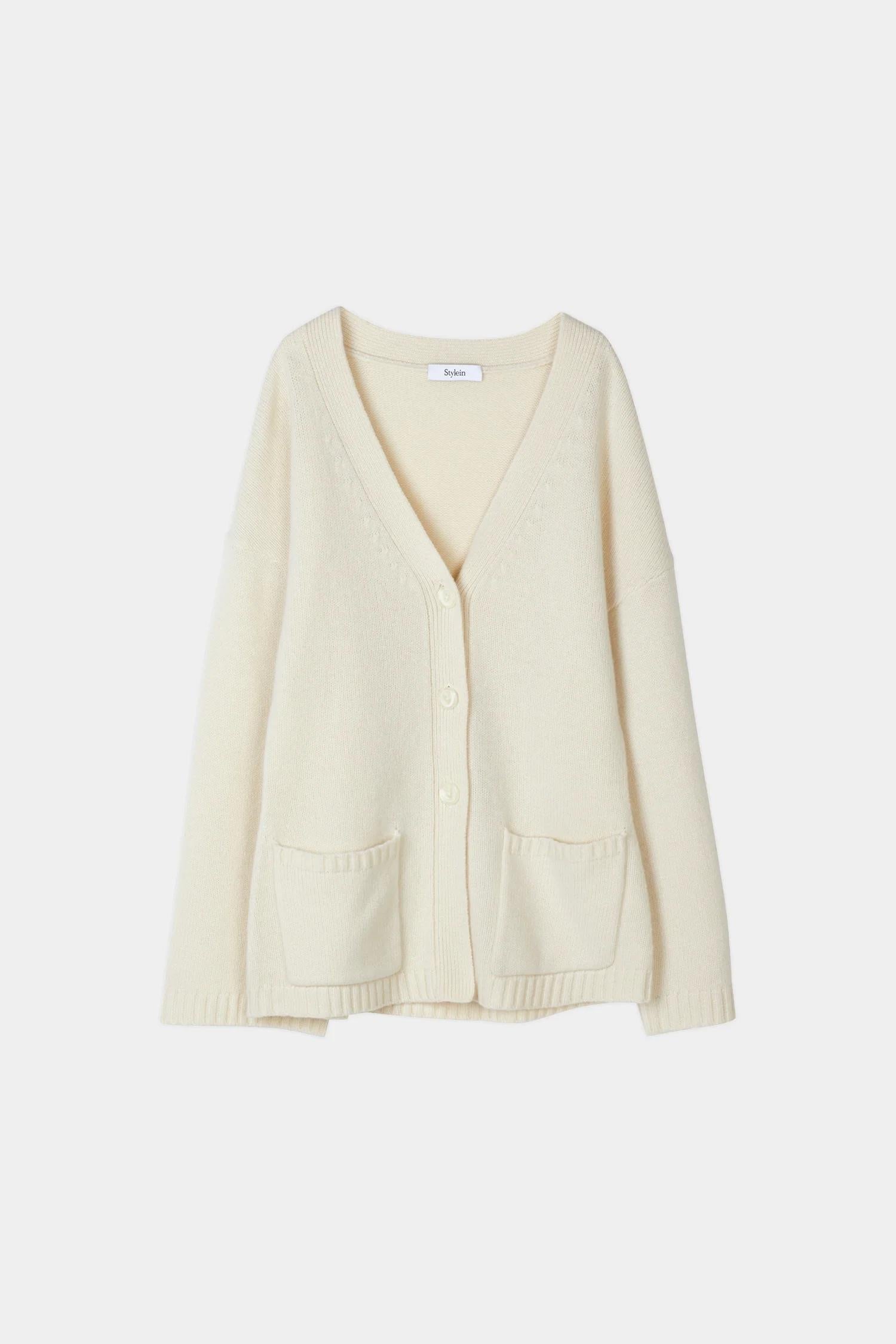 Helia Cardigan fra Stylein. Helia Cardigan er en elegant og tidløs cardigan laget i 100% merinoull. Den har en dyp V-utringning med overlapp og lukkes med tre knapper foran. De vide ermene og de to kvadratiske frontlommene med ribbede kanter gir plagget et moderne og sofistikert uttrykk. Et luksuriøst basisplagg som kombinerer komfort, kvalitet og stil. Normal i størrelsen.