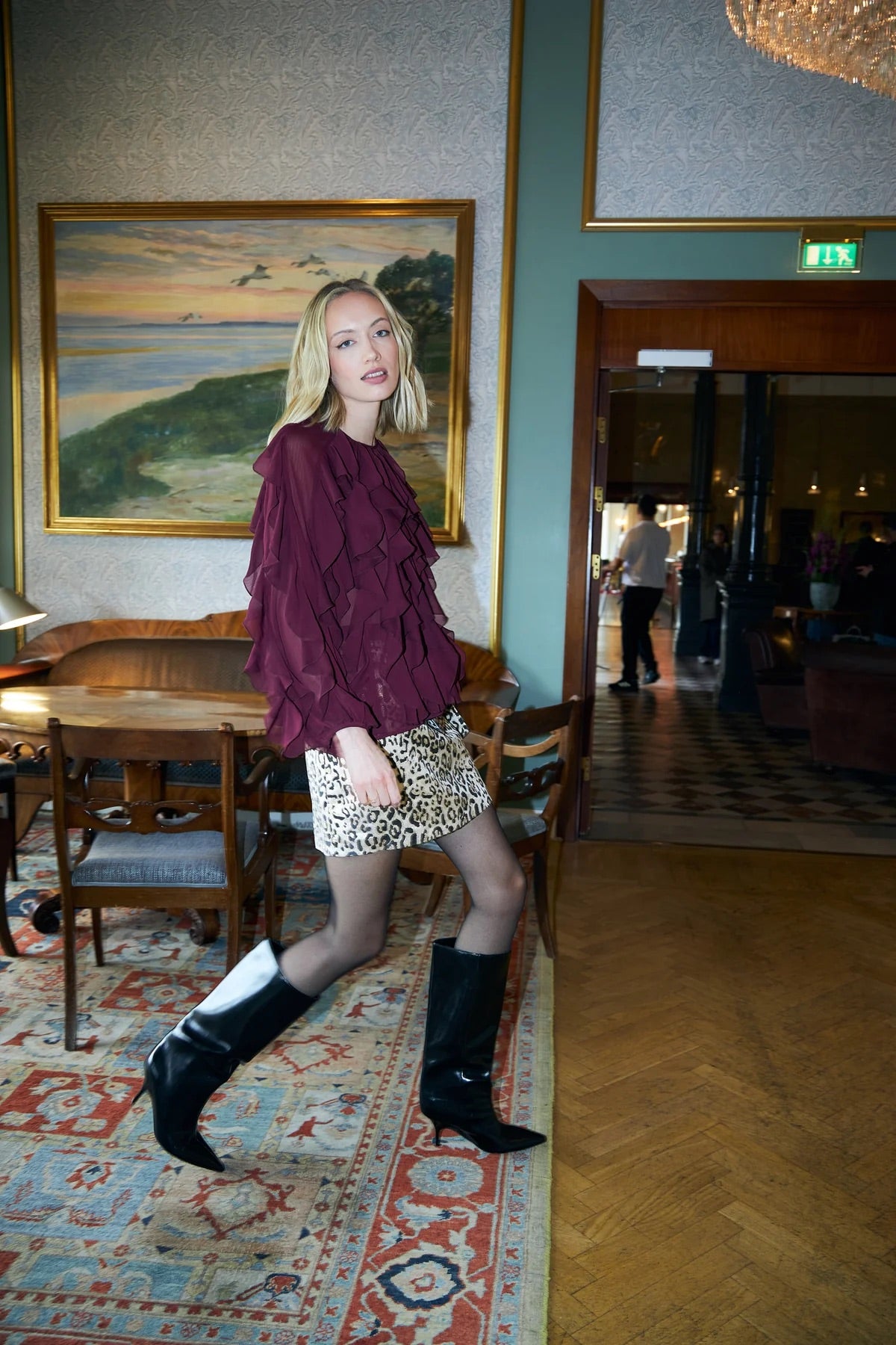 Rya Blouse fra Cras. Rya Blouse er en romantisk bluse med moderne femininitet, laget i et lett og transparent materiale. Den er dekorert med vakre volangdetaljer, stofftrukne knapper og lange ballongermer som samles elegant ved mansjettene. En tidløs og anvendelig bluse som passer like godt til hverdags som til fest. Normal i størrelsen.