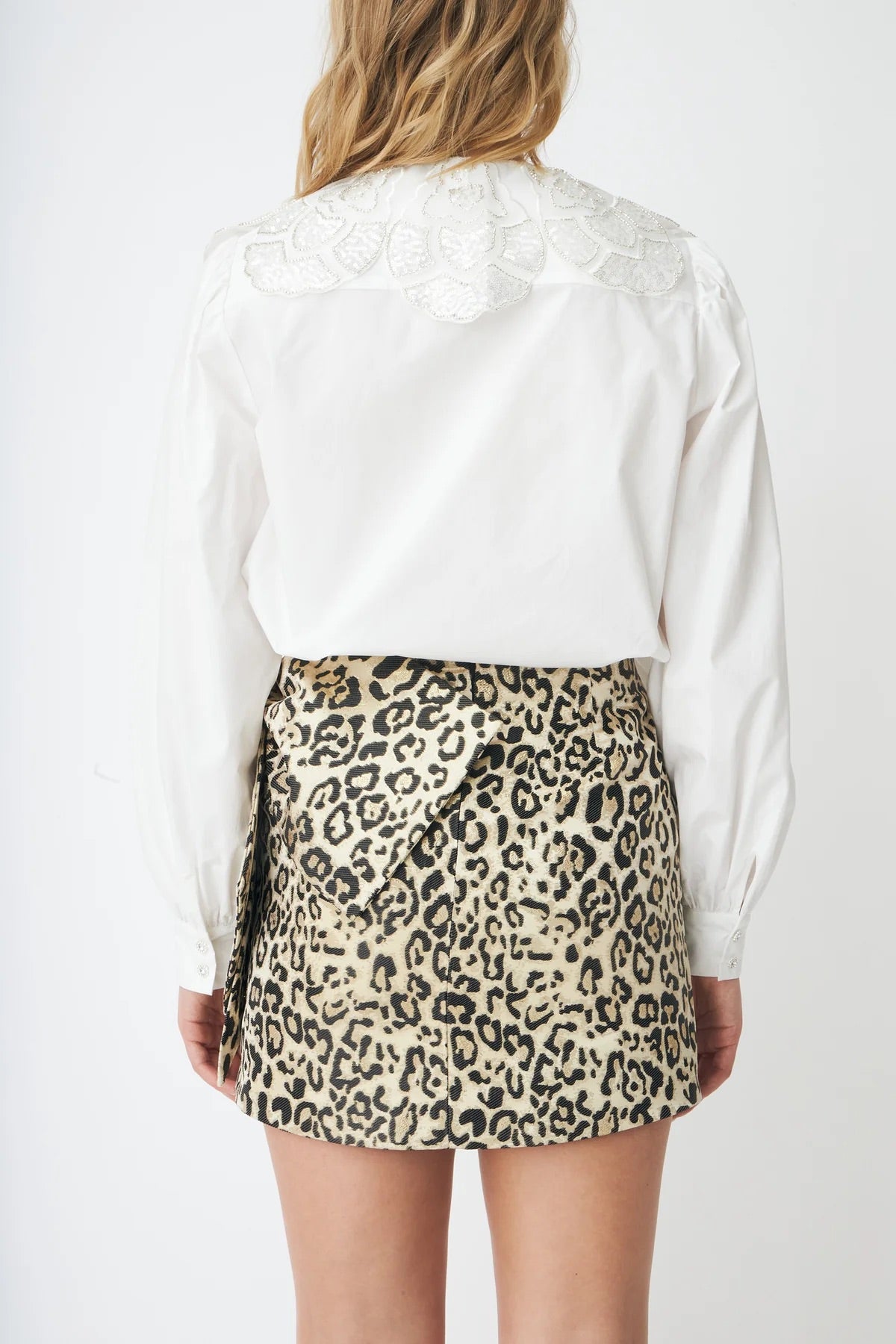 Desandra Shirt fra Cras. Desandra Shirt er en feminin og elegant skjorte som løfter hverdagsgarderoben. Den har en oversized krage med nydelige broderte detaljer og glitrende rhinestone-knapper. Den løse passformen og de voluminøse ermene skaper en moderne silhuett som passer like godt til jeans som til skjørt. Normal i størrelsen.