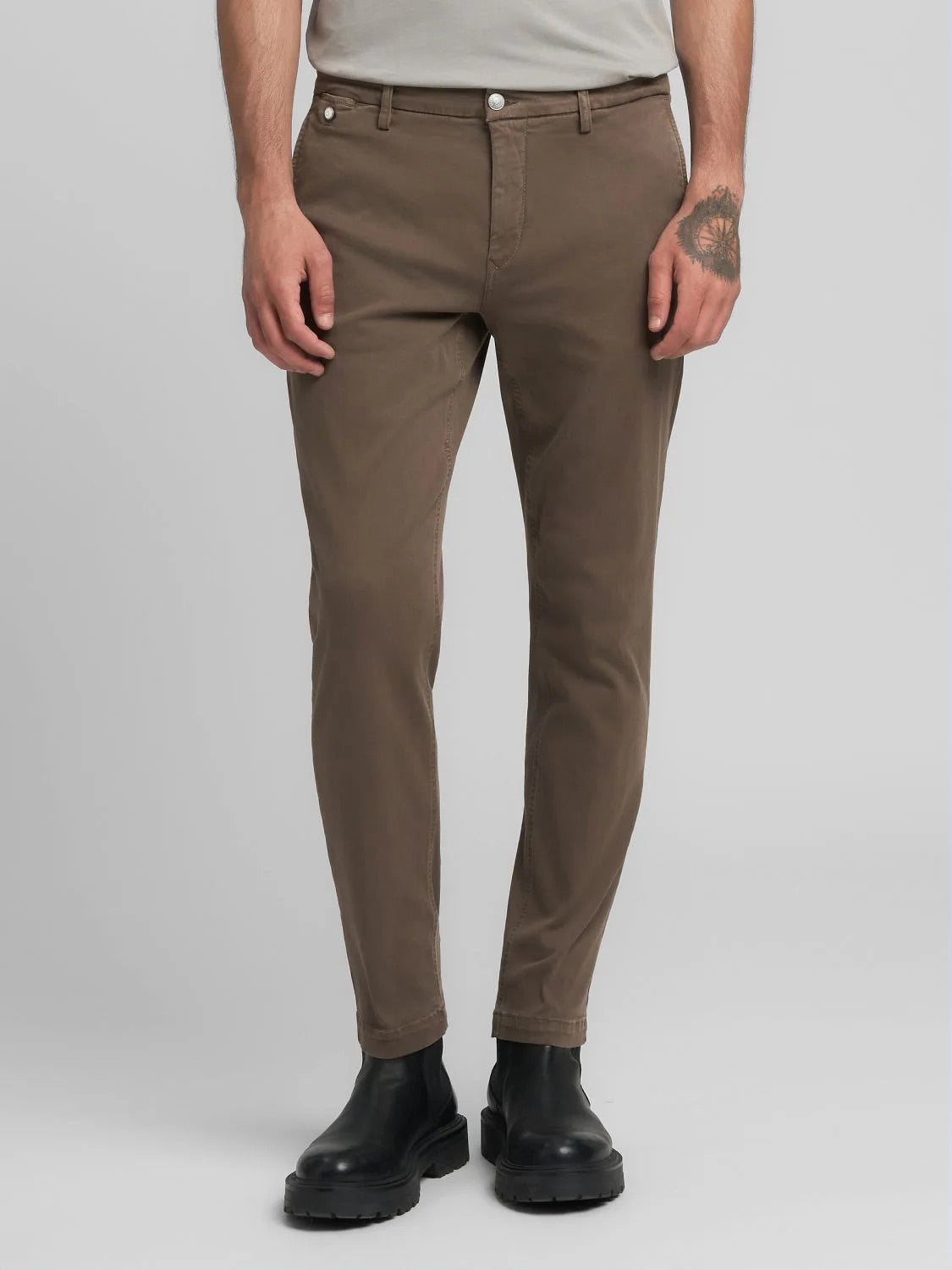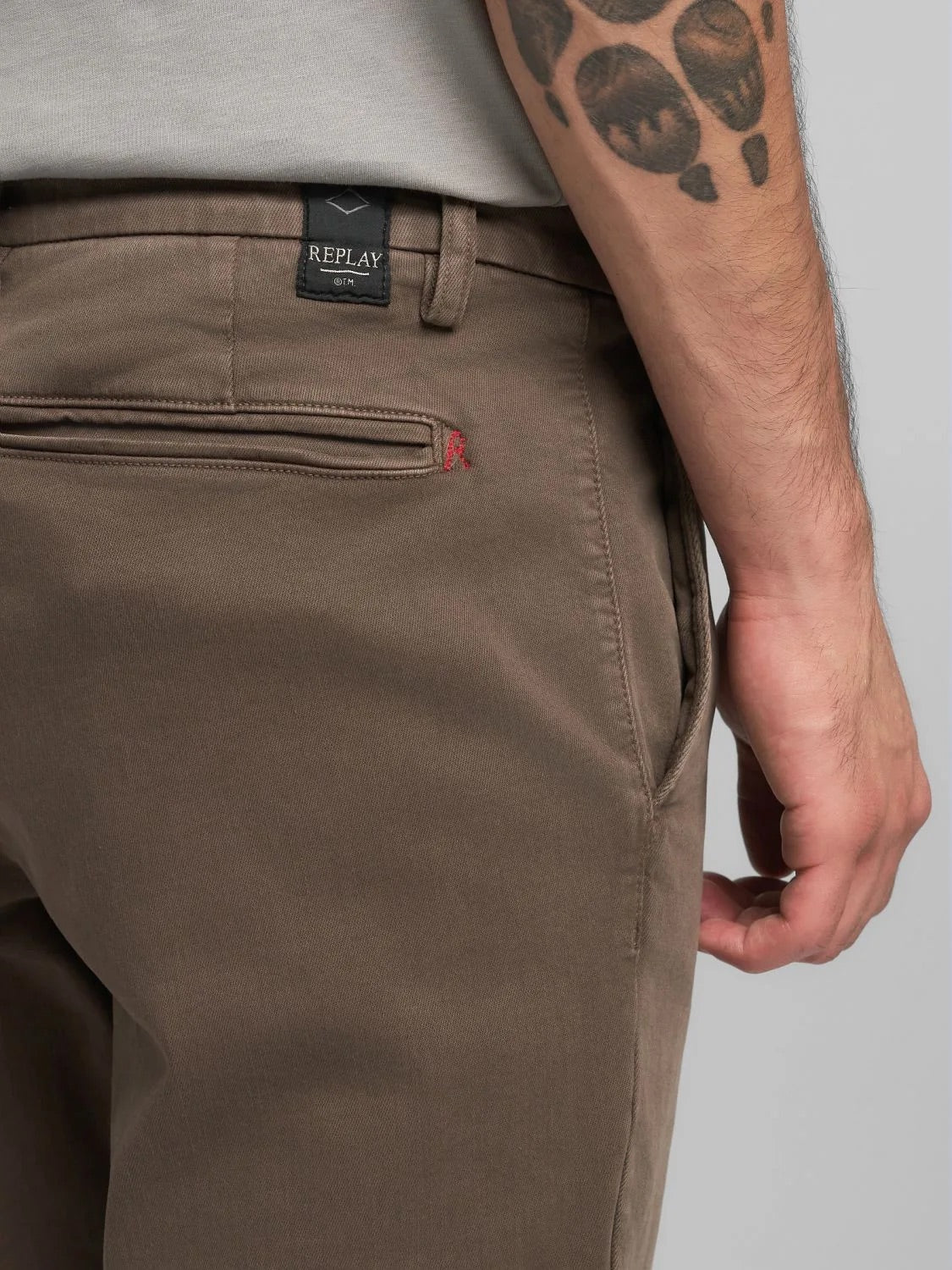Benni M9722E.000.8366197 fra Replay. Benni er en regular-fit chinos inspirert jeans, laget i ekstra lett Hyperflex-bull denim som gir maksimal bevegelsesfrihet, styrke og komfort året rundt. Modellen har klassiske fem lommer, skrålommer foran og doble paspolerte baklommer – hvor den ikoniske R-logoen er brodert. Plagget er steinvasket og farget med en vintage “old dye”-prosess for et naturlig, tidløst uttrykk. Ferdigstilt med glidelås og knappelukking. Normal i størrelsen.