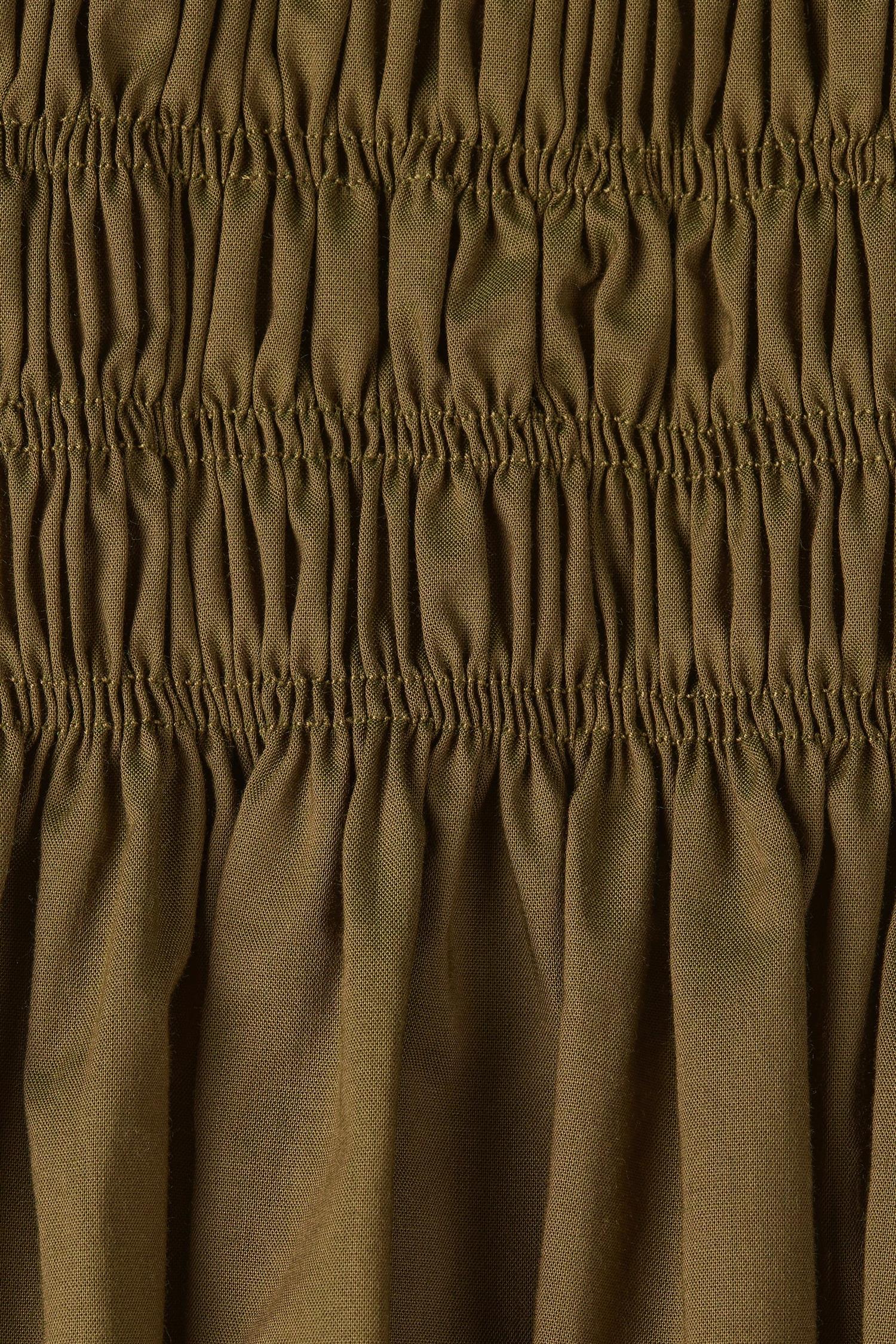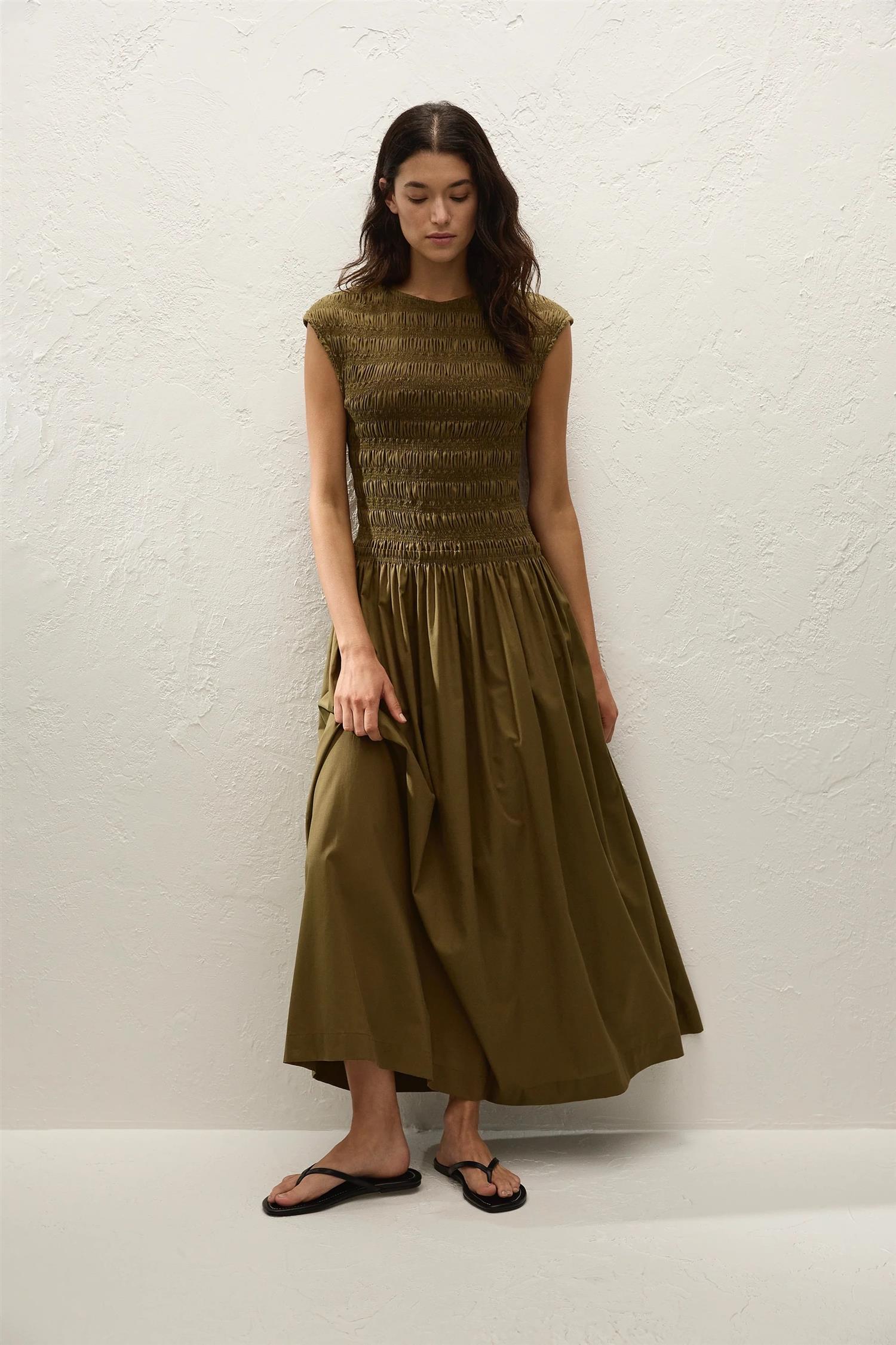 Olive Midi Dress fra Faithfull The Brand. Olive Midi Dress er en tidløs midikjole laget i myk økologisk bomull i en dyp olivengrønn nyanse. Kjolen har en rynket overdel med høy, avrundet hals, korte cap-ermer og en liten nøkkelhullsdetalj med knapp i nakken. Den markerte midjen gir en feminin silhuett som faller videre ut i et mykt A-linjet skjørt. Et allsidig plagg som passer like godt til hverdags som til sesongens finere anledninger. Normal i størrelsen – overdelen har ekstra stretch. Modellen er 175 cm høy og bruker størrelse S.
