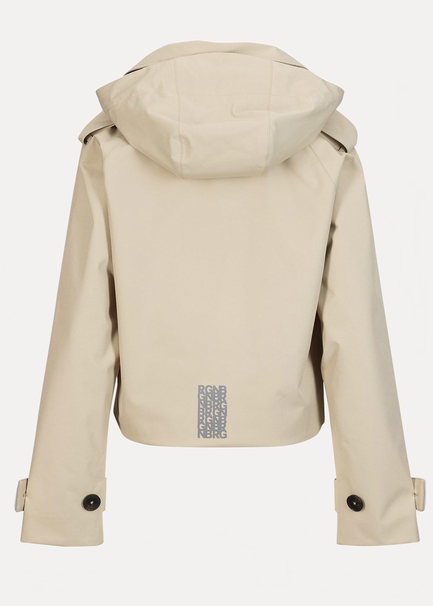 Skydekke Trench fra BRGN. Skydekke Trench er en moderne, dobbelspent trench coat med cropped lengde, laget i vanntett resirkulert materiale. Designet har avtakbar hette skjult under kragen, sidelommer med klaff, mansjetter med knapper og diskrete reflekterende detaljer. En funksjonell og stilren jakke som passer perfekt til kjøligere dager, og kan brukes i temperaturer ned til 0 °C. Normal i størrelsen.