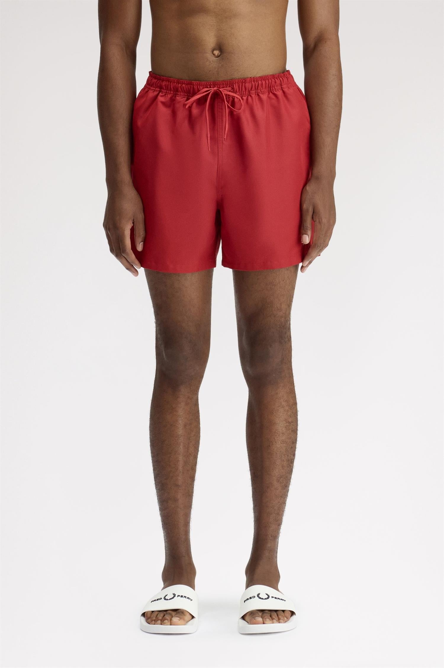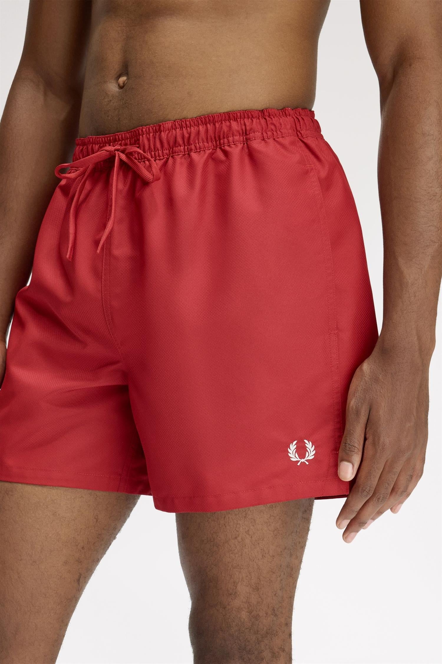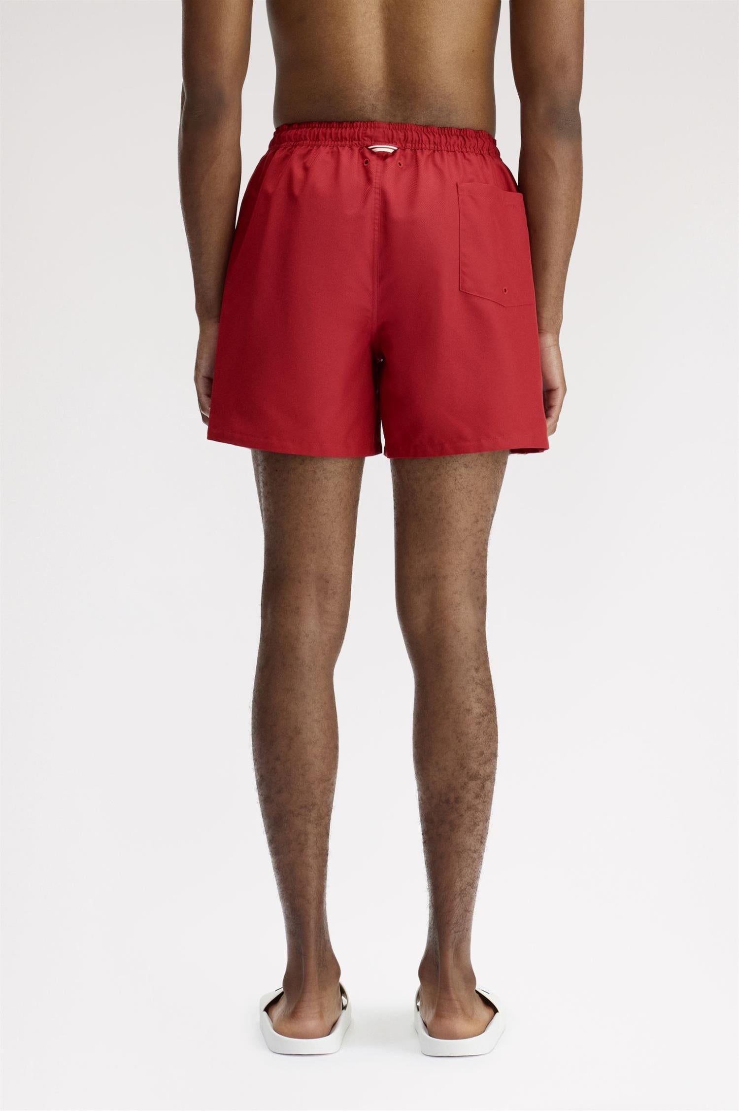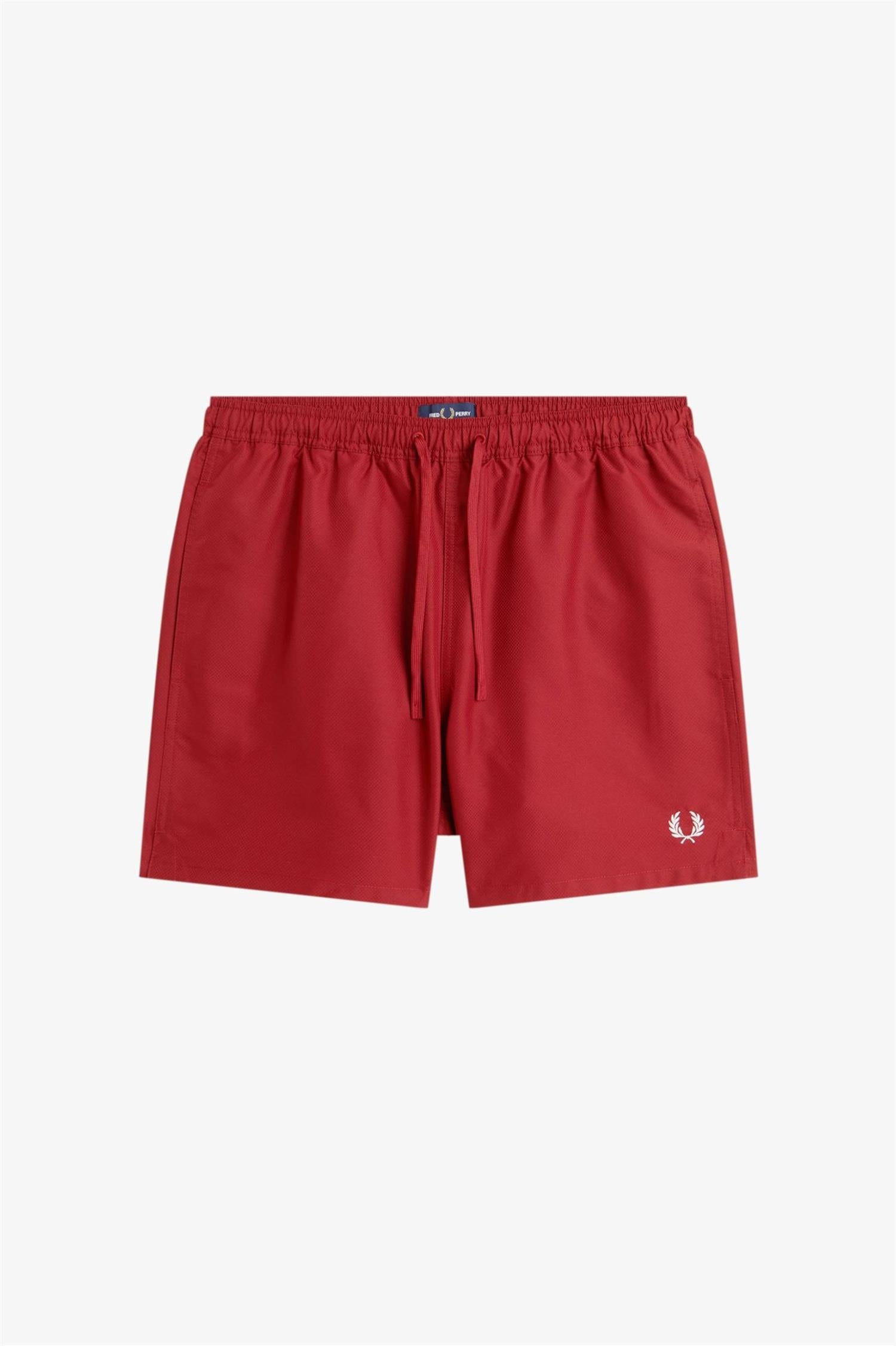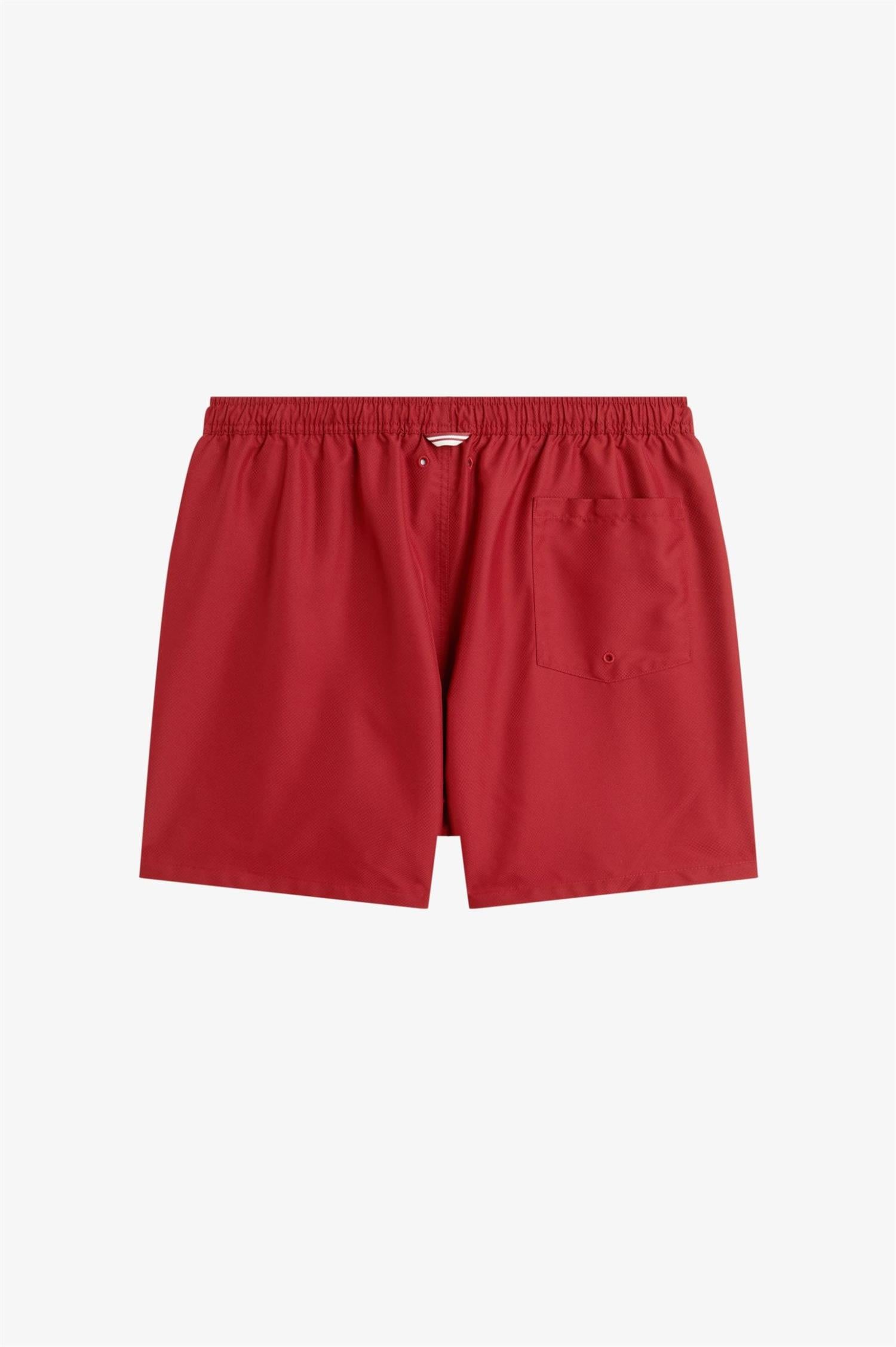 Swimshorts fra Fred Perry. Swimshorts er en lett og funksjonell badeshorts i resirkulert polyester med et rent, sporty uttrykk. Designet har elastisk linning med snøring, praktiske sidelommer og brodert Laurel Wreath på venstre ben som signaturdetalj. Regular fit og normal i størrelsen.