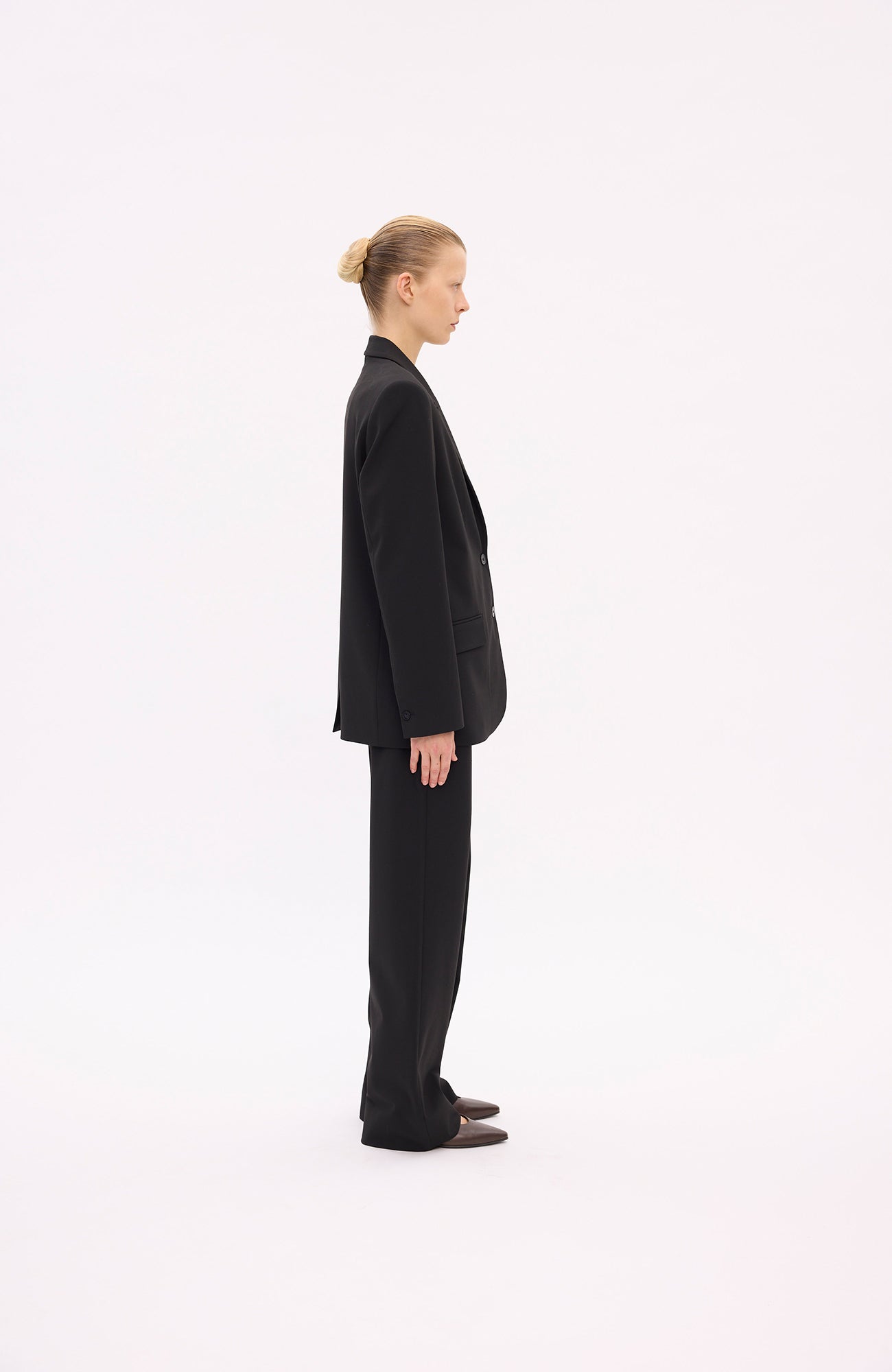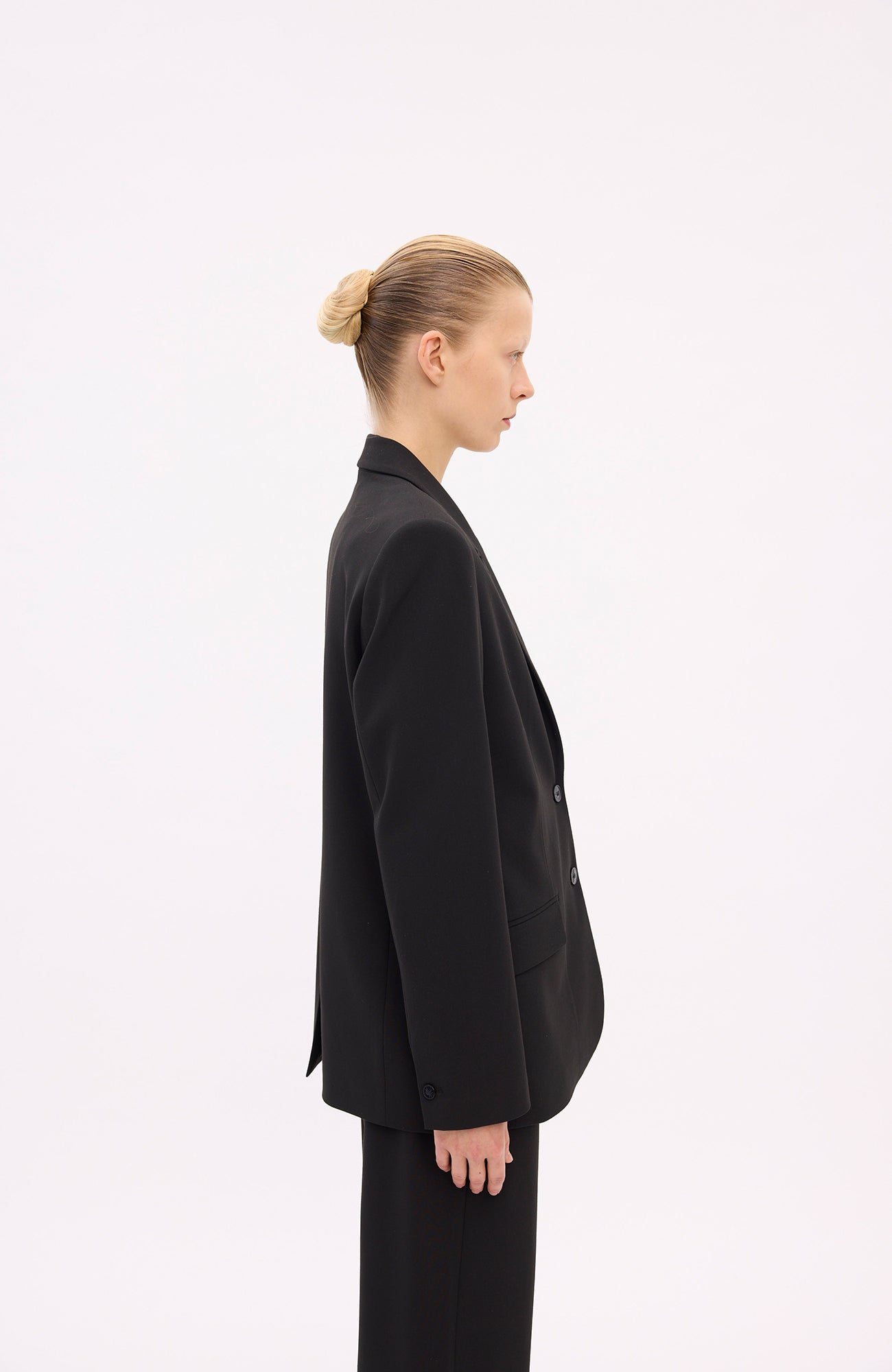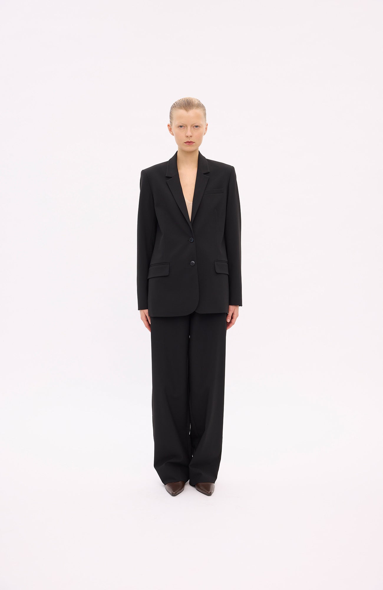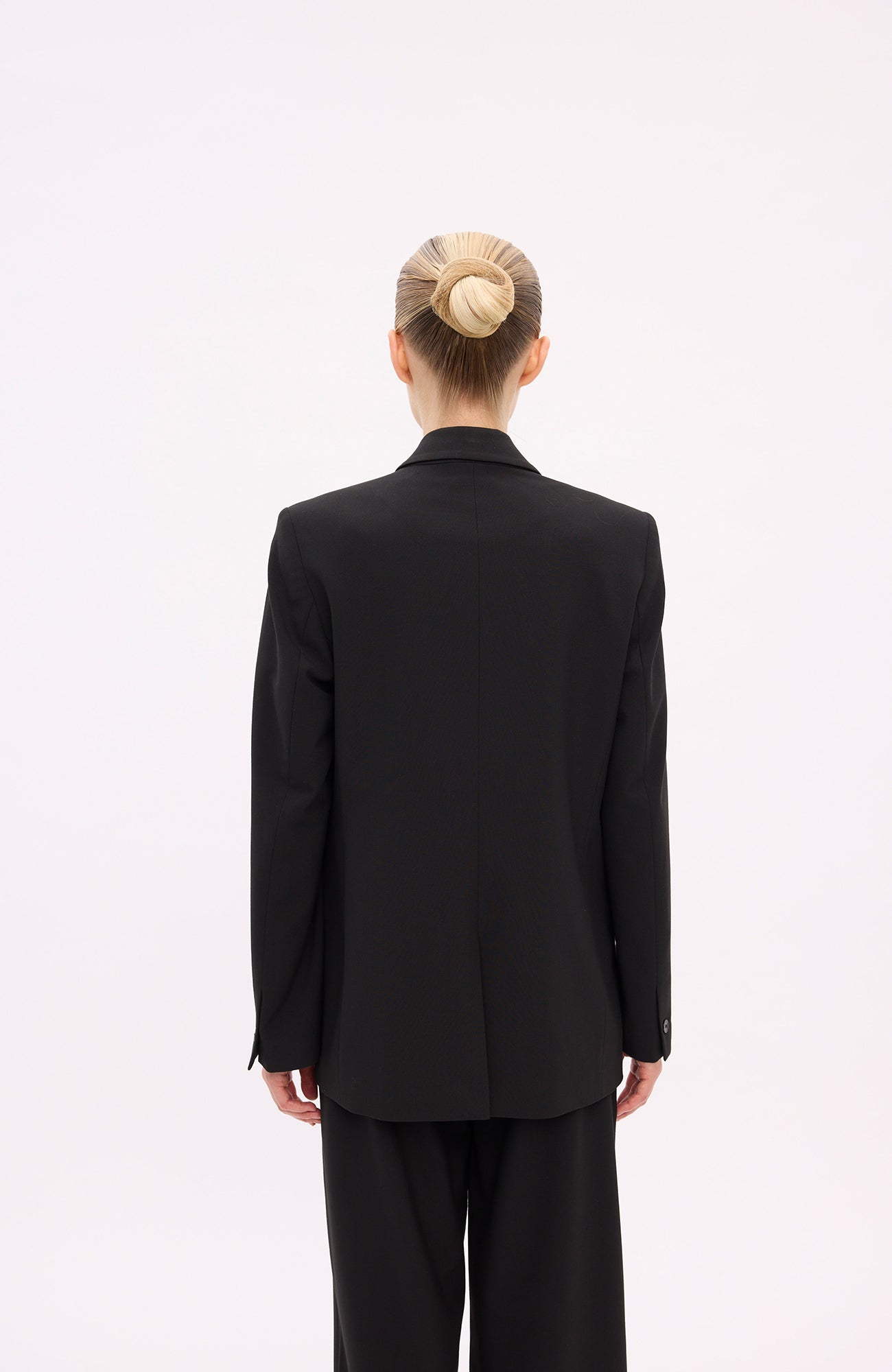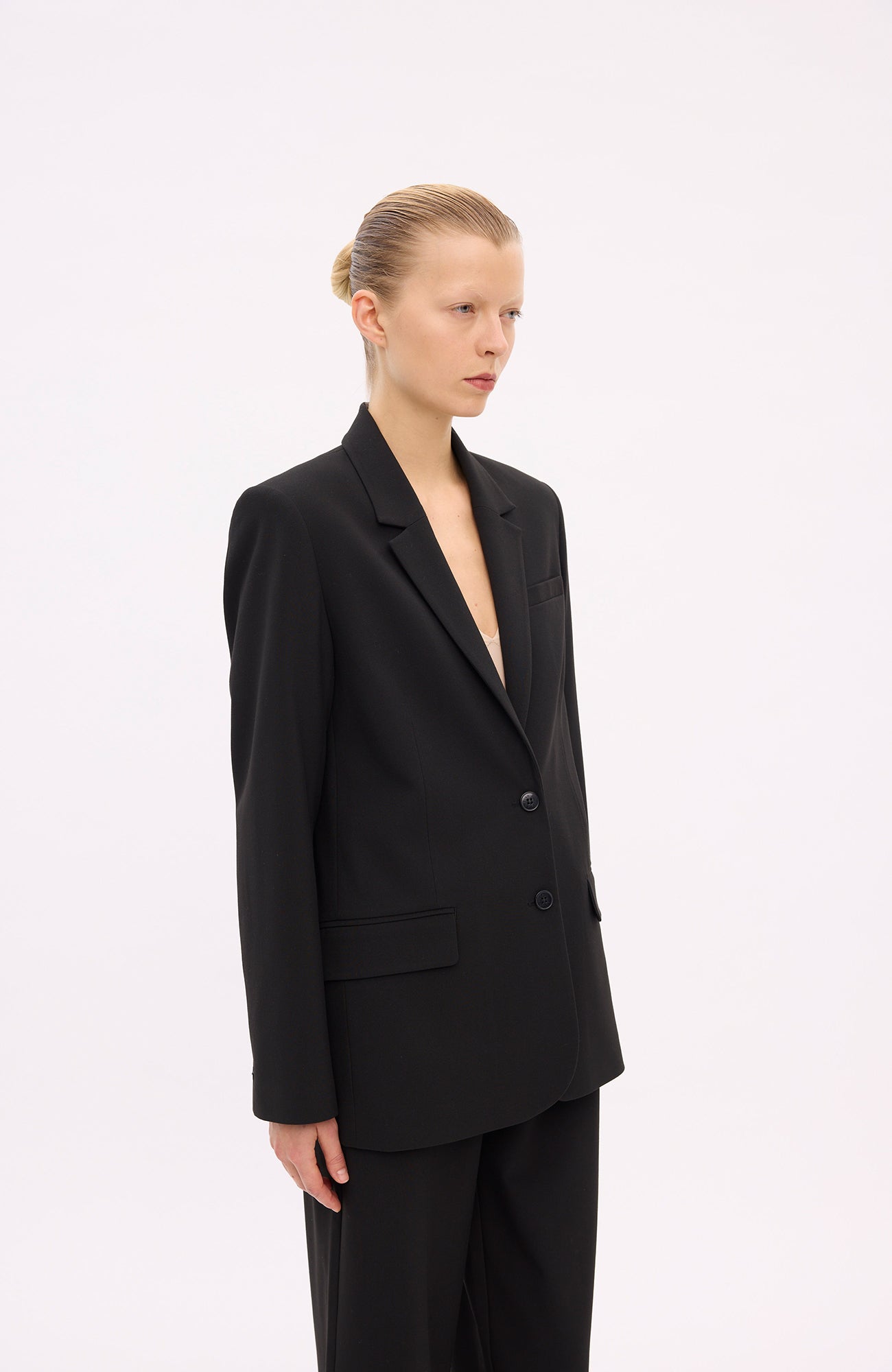 Hannah Blazer 285 Black fra Five Units. Hannah Blazer 285 er en elegant blazer med en rett passform og en enkeltspent silhuett. Designet har minimalistiske detaljer som logoknapper, en klassisk hakket jakkeslag, funksjonell brystlomme og frontlommer med klaff. Blazeren er formet med sidesømmer og myke skulderputer for en flatterende passform, mens en splitt bak gir ekstra bevegelsesfrihet. Perfekt for enhver anledning med sin tidløse og sofistikerte look. Normal i størrelsen.