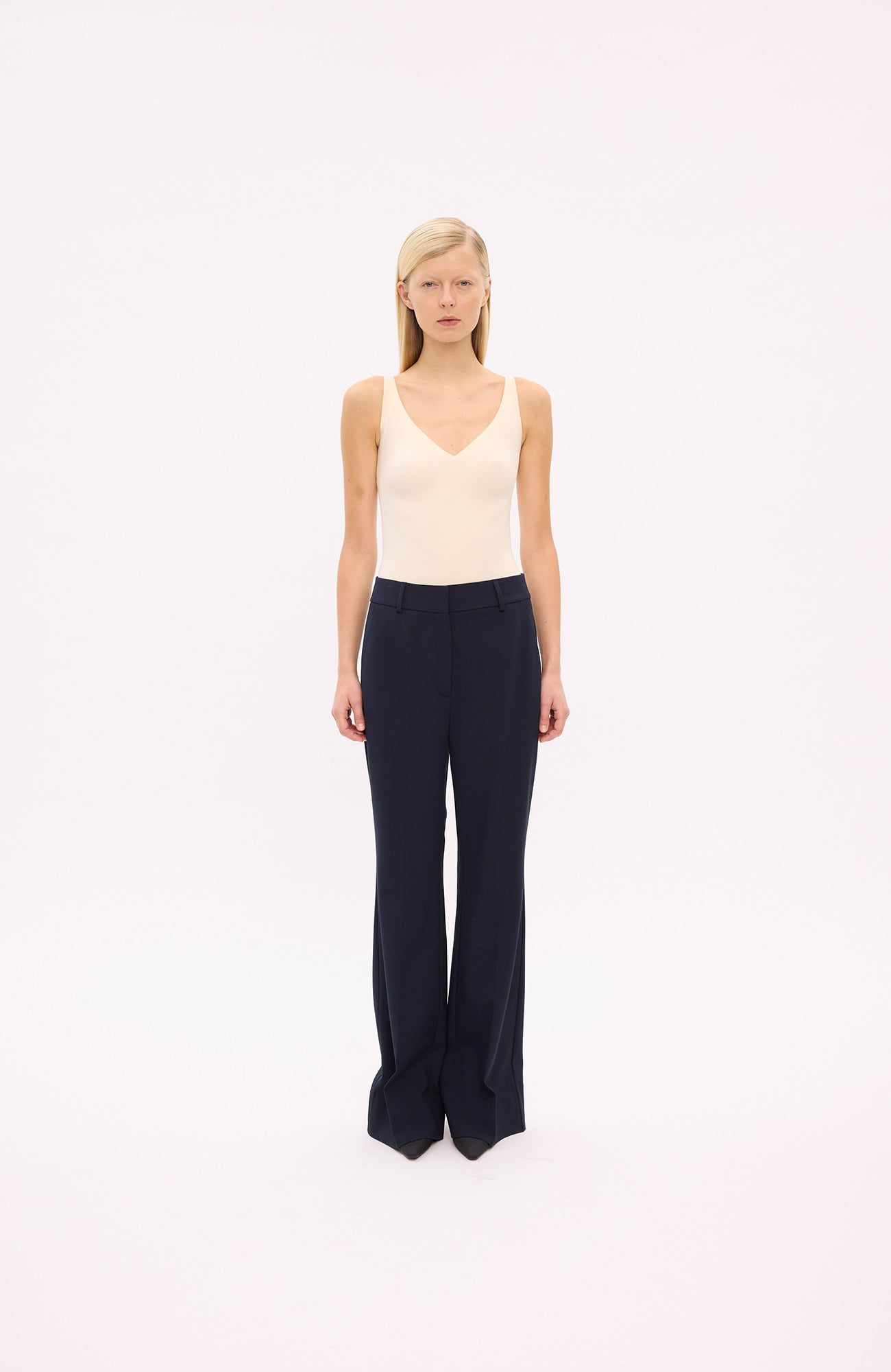 Five UnitsOlivia 285 Navy Regular fra Five Units. Utforsk den nye buksemodellen fra Five Units med Olivia 285! Disse buksene har en elegant utsvømmet passform, laget av forseggjort ensvevet stoff i et tidløst design. Med sin høye midje er de nøye formet for å sitte perfekt på midjen, fremheve hofter og lår, og faller elegant over knærne. Det unike snittet og den svært allsidige silhuetten gjør disse buksene til et enestående tilskudd til garderoben din, som kan styles på mer enn én måte. Olivia 285 har en flared-fit med regular lengde og en moderne high-waist. Denne buksemodellen balanserer både komfort og stil, og gir deg en sofistikert look uansett anledning. Perfekt for de som ønsker en moderne og allsidig bukseopplevelse. Buksen kommer med lommer på siden og lukkes med glidelås og hemp. Normal i størrelsen.