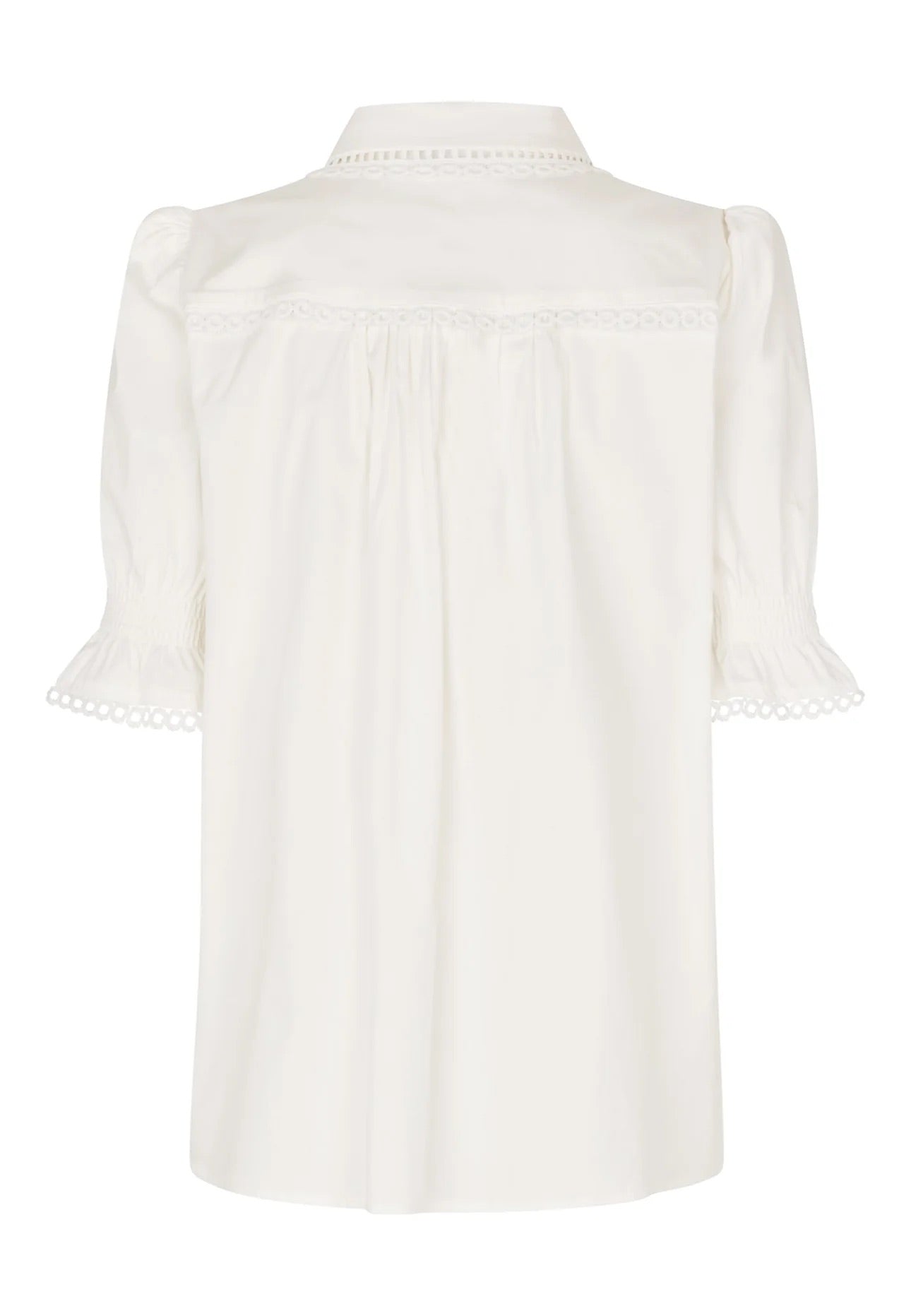 DaraDEA Blouse fra Dea Kudibal. DaraDEA Blouse er en hvit poplinskjorte med delikate blondedetaljer langs fronten, rundt kragen og ved mansjettene gir blusen et elegant preg. Modellen har regular fit, korte ermer med lett puff ved skuldrene og elastisk avslutning nederst på ermene. Style den med jeans for en avslappet look, eller kombiner med skjørt for et mer pyntet uttrykk. Normal i størrelsen.
