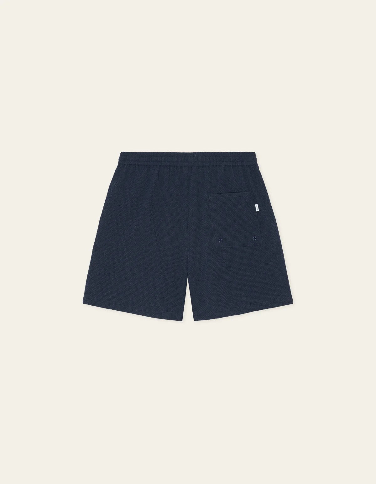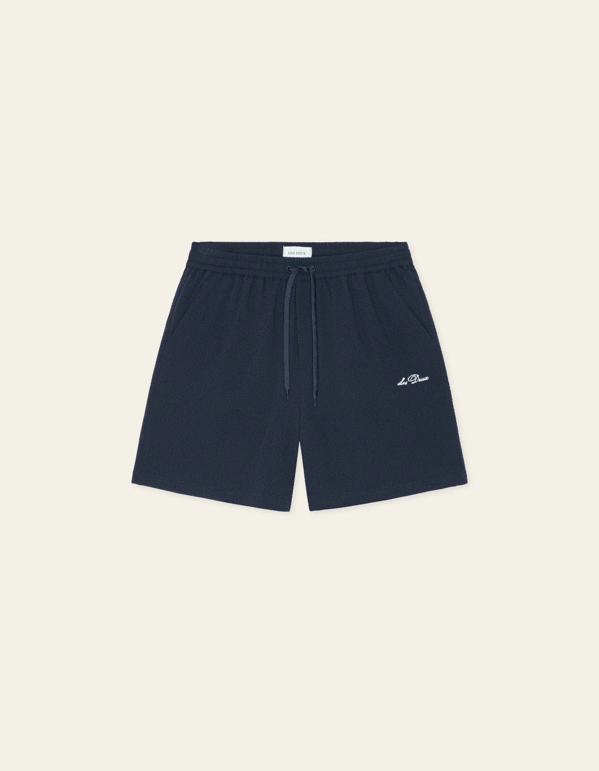 Stan Seerseucker Swim Shorts fra Les Deux. Kul badeshorts i hurtigtørkende seersucker med brodert crew-bokstav på låret. Shortsene har elastisk løpesnor i midjen og praktiske lommer både på siden og bak. Normal i størrelsen.