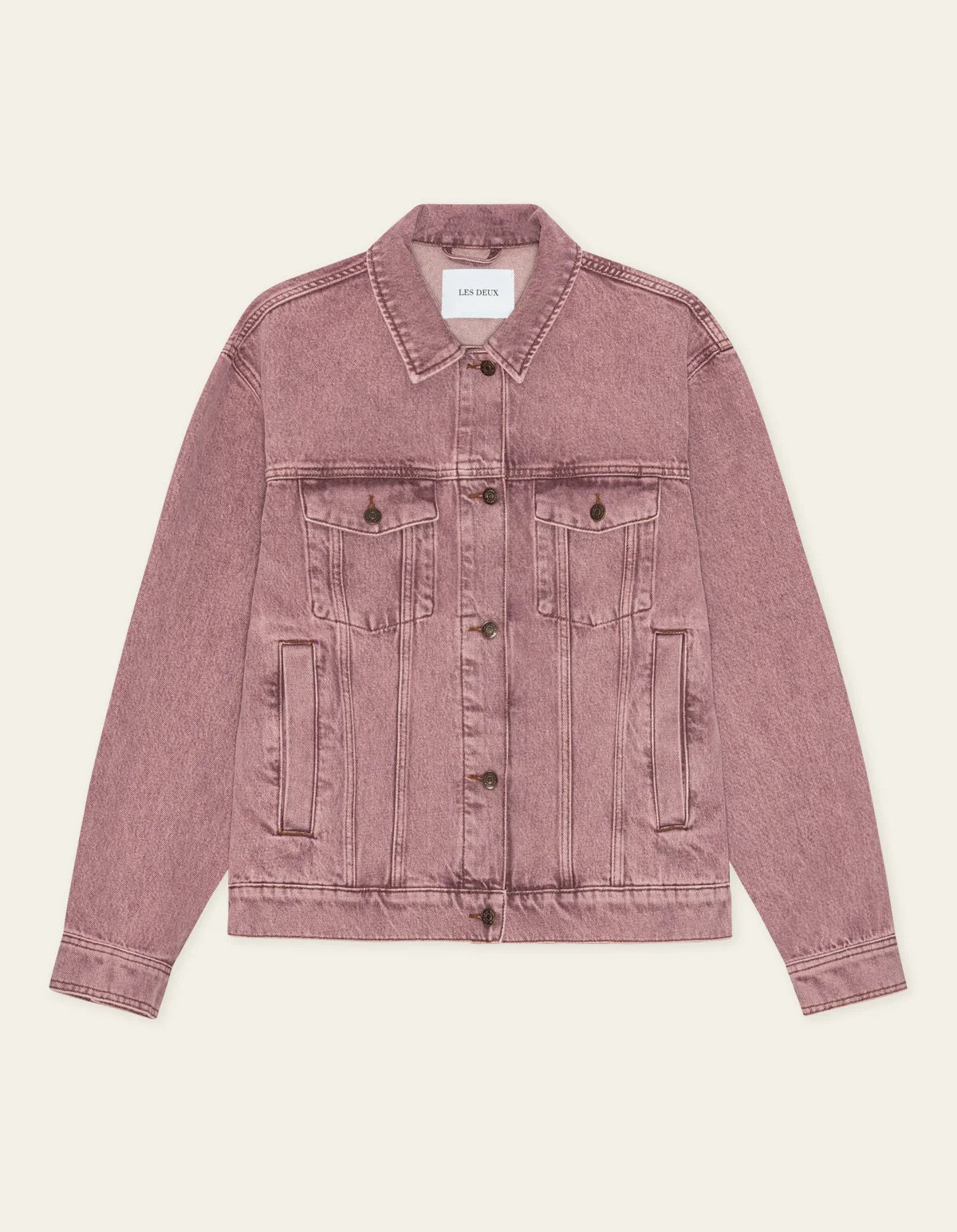 Rally Light Pink Denim Jacket fra Les Deux. Rally Light Pink Denim Jacket er en klassisk denimjakke i en lys rosa wash med en ren og strukturert silhuett. Designet har metallknapper, kantede sidelommer, brystlommer og justerbare stropper i livet som gir en tydelig og gjennomført look. Regular fit.