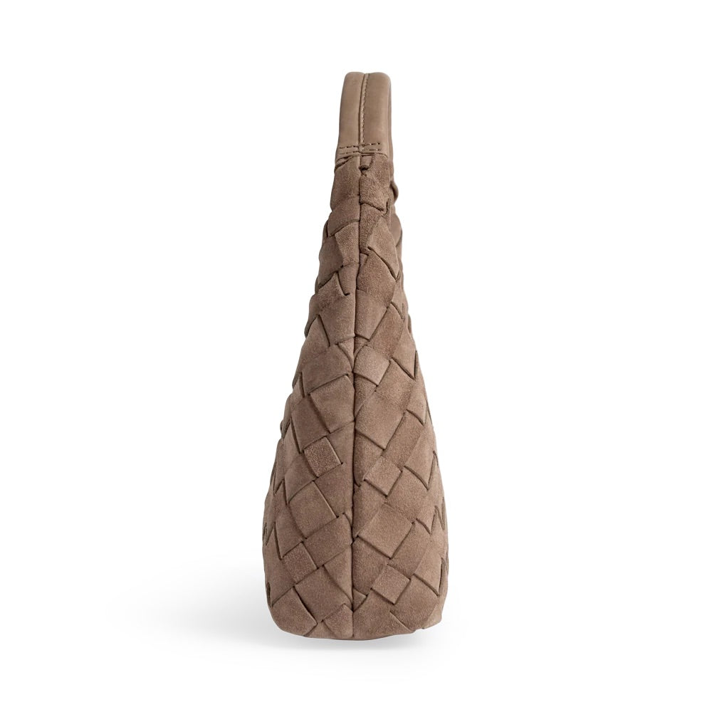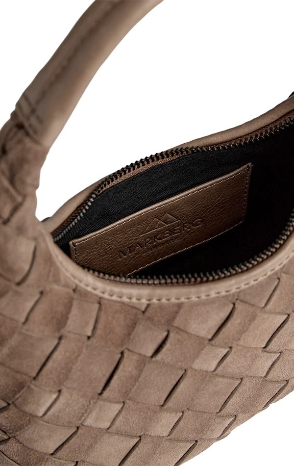 HaymaMBG Handbag fra Markberg. HaymaMBG Handbag er en elegant og tidløs håndveske laget i håndflettet semsket skinn. Vesken har en strukturert form med fast bunn og lukkes med glidelås, slik at du enkelt og trygt kan oppbevare det viktigste. Den korte hanken gjør den perfekt å bære i hånden, enten til hverdagsbruk eller mer pyntede anledninger. En kompakt, men funksjonell veske som tilfører antrekket et eksklusivt preg. Onesize.