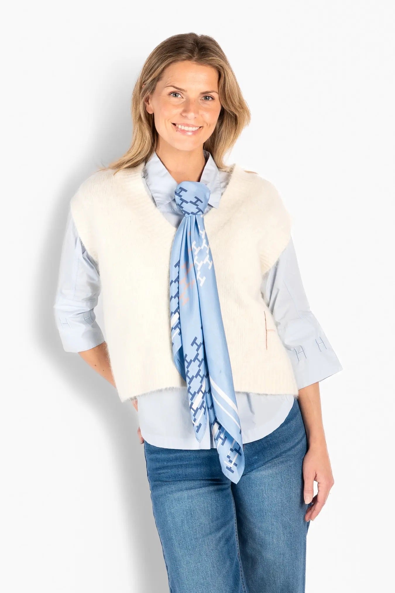 ISADORA Silk Scarf Large fra Hést. Isadora Silk Scarf Large er et tidløst og eksklusivt silkeskjerf laget i glatt, lett silke. Det har et markant helprintet H-inspirert mønster med grafiske detaljer som gir et moderne uttrykk. Den generøse størrelsen på 90 × 90 cm gjør skjerfet svært anvendelig – bruk det over skuldrene, knyttet rundt halsen eller som en stilig detalj på vesken. Et elegant tilbehør som løfter både hverdagsantrekk og mer pyntede looks. Onesize.