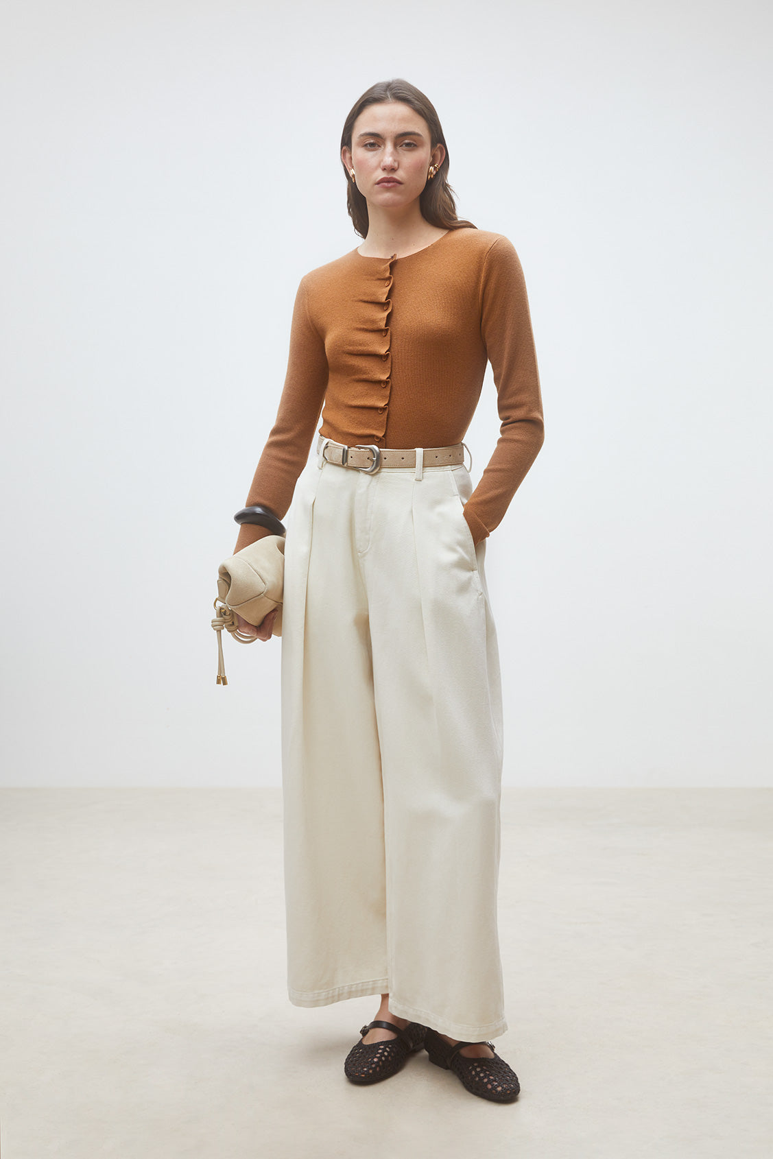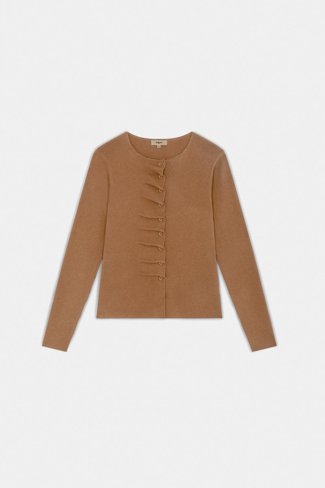 Gamira Sweater fra Suncoo Paris. Gamira Sweater er en elegant cardigan med en moderne vri. Den har knappelukking i front og delikate plissé-detaljer som gir plagget et lett og sofistikert fall. De lange ermene og den klassiske silhuetten gjør cardiganen enkel å style både til hverdags og mer pyntede anledninger. Modellen er normal i størrelsen – velg din vanlige størrelse, men vipper du mellom to størrelser anbefales det å velge den største.