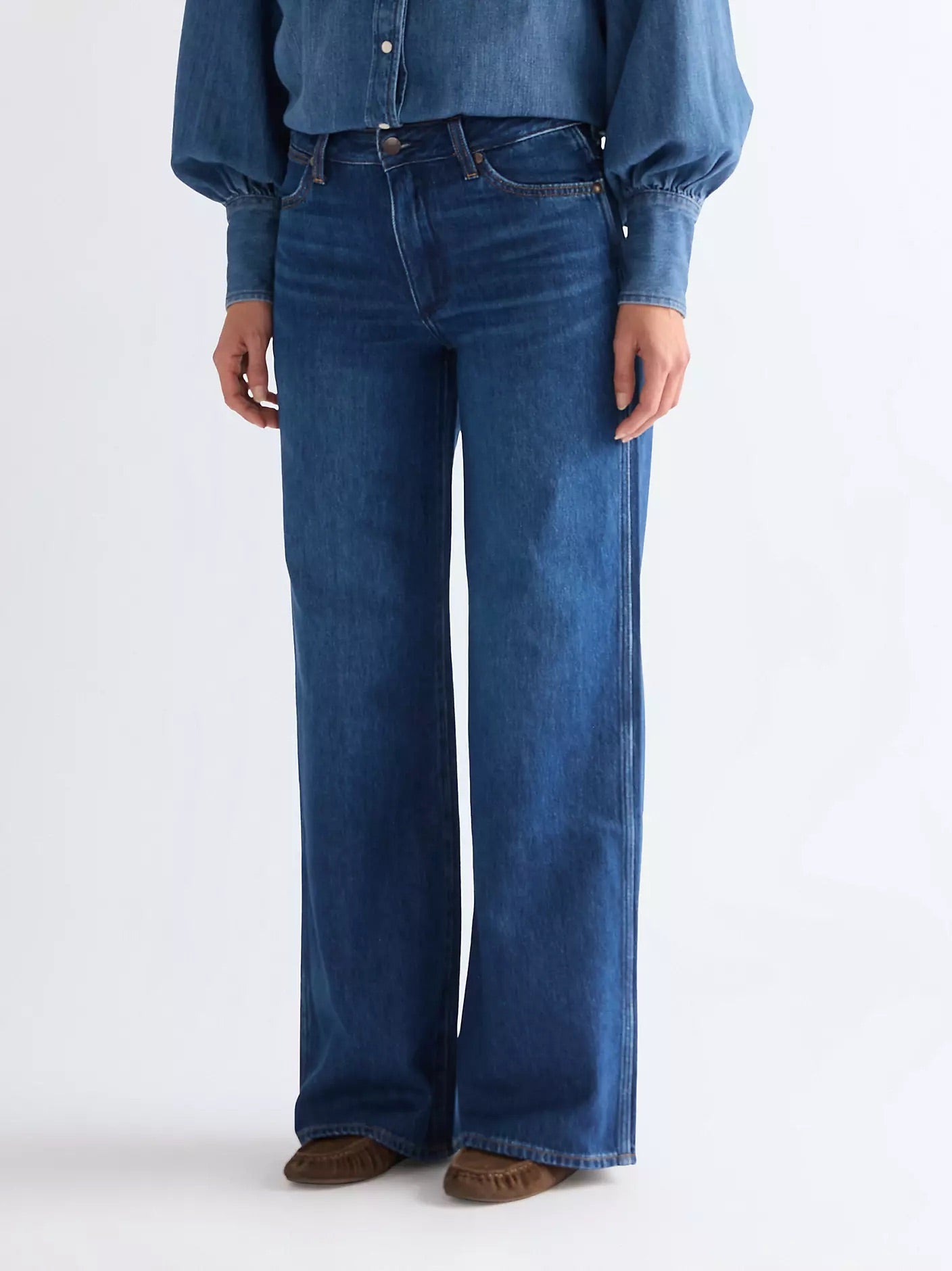 World Wide Jeans fra Wrangler. Opplev den lette elegansen til World Wide jeans fra Wrangler, designet med en vid benfasong som gir en moderne og avslappet estetikk. Med en mellomhøy midje og utsvingte ben gir jeansen en flatterende silhuett som enkelt kan styles fra dag til kveld. Fullført med klassiske Wrangler-detaljer som glidelåsgylf med knappelukking, beltehemper og ikonisk merkevarepatch på linningen bak. Normal i størrelsen.