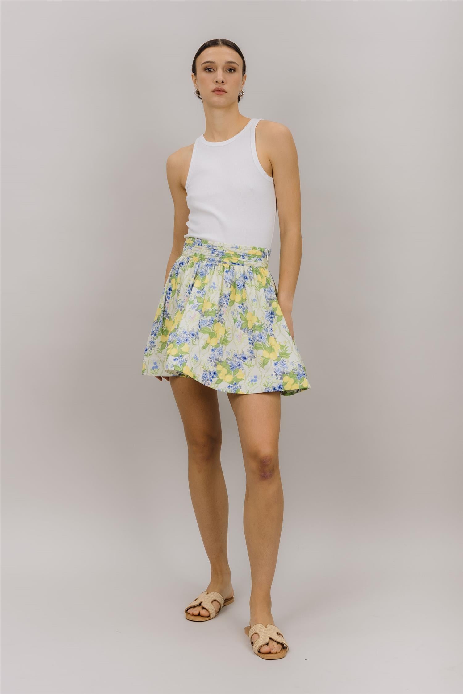 Mazia Skirt fra Urban Pioneers. Mazia Skirt er et feminint skjørt i det friske Lemon AOP-mønsteret med sitroner og blomster som gir et sommerlig og lekent uttrykk. Skjørtet har en flatterende midje og vid silhuett som gir fin bevegelse og gjør det enkelt å style til både hverdags og ferie. Normal i størrelsen.