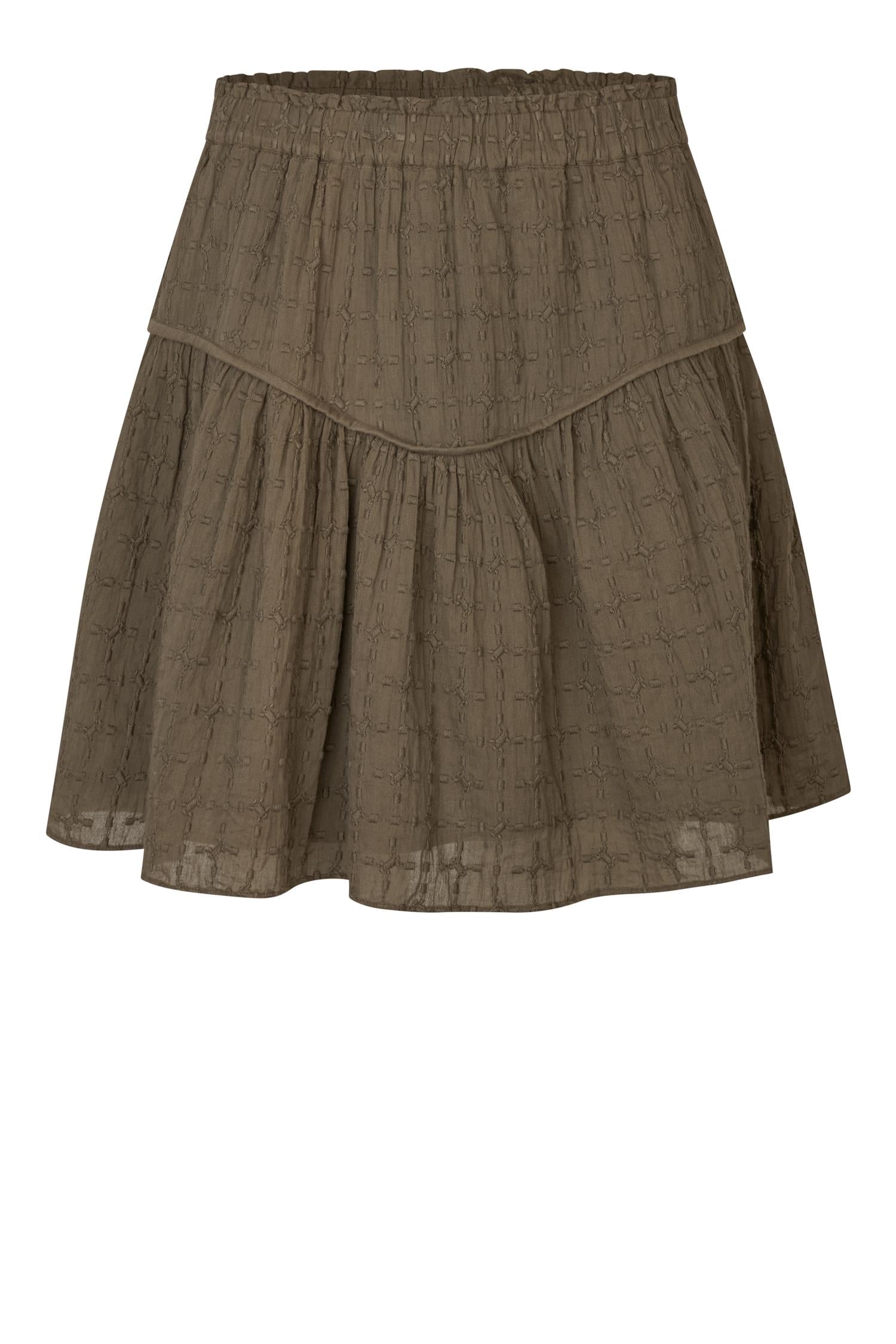 Mynthe Mini Skirt fra Second Female. Mynthe Mini Skirt er et feminint miniskjørt i en lett, semitransparent bomullskvalitet med ton-i-ton broderier som gir et delikat uttrykk. Designet har skjult elastisk linning og en volang med rynker som skaper fin vidde og bevegelse. Kort og utsvingt fasong. Normal i størrelsen. Farge: Tarmac. Materiale: 100% Cotton. |