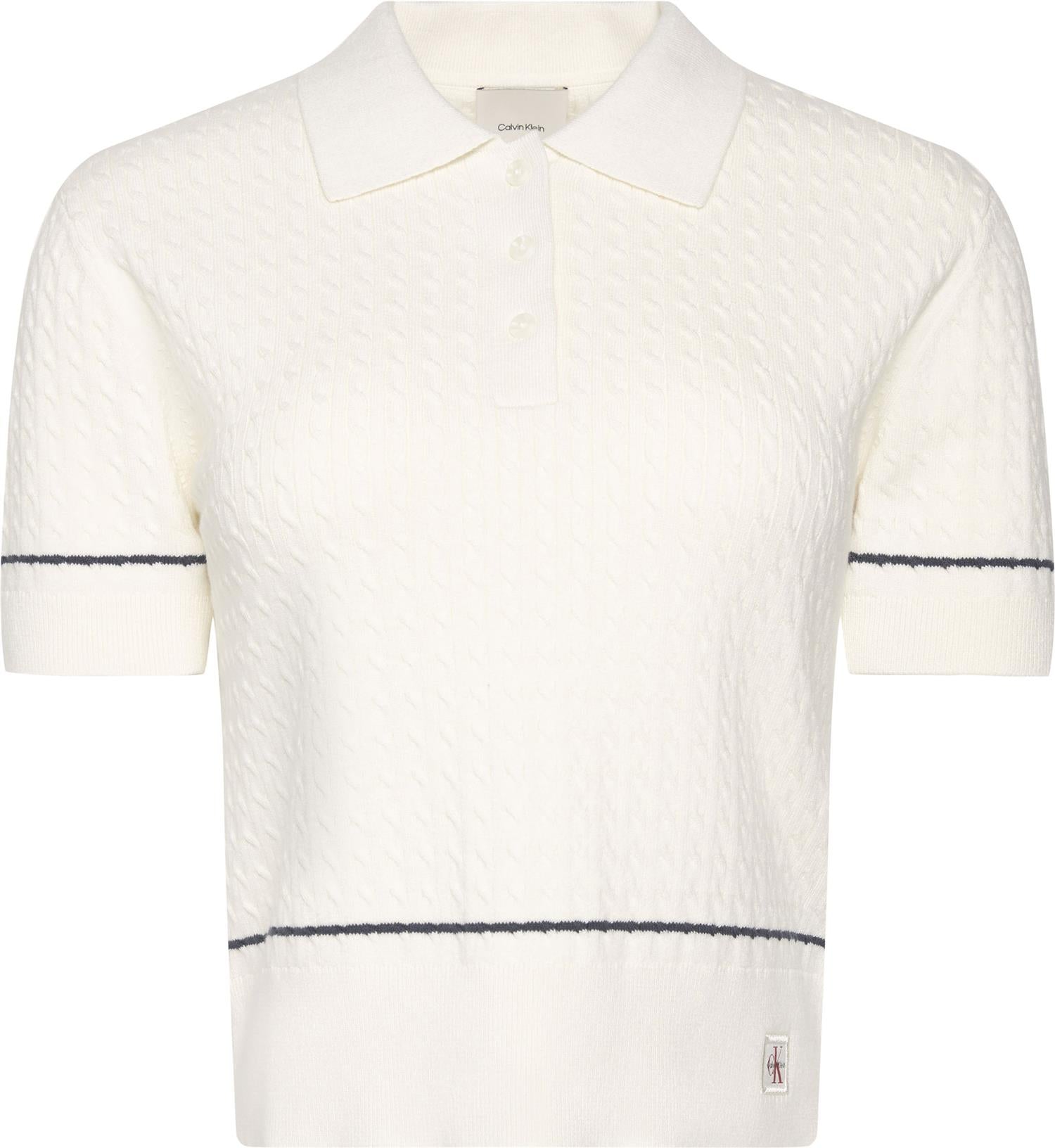 Cable Knit Short Sleeve Jumper fra Calvin Klein. Cable Knit Short Sleeve Jumper er en stilren kortermet strikkegenser i en lys nyanse med klassisk kabelstrikk som gir et tidløst og sofistikert uttrykk. Designet har polokrage med treknapps lukking og diskrete kontrastdetaljer ved ermer og nederkant, mens den korte passformen gir en moderne silhuett. Den lille Calvin Klein-logoen ved kanten tilfører et subtilt signaturpreg.