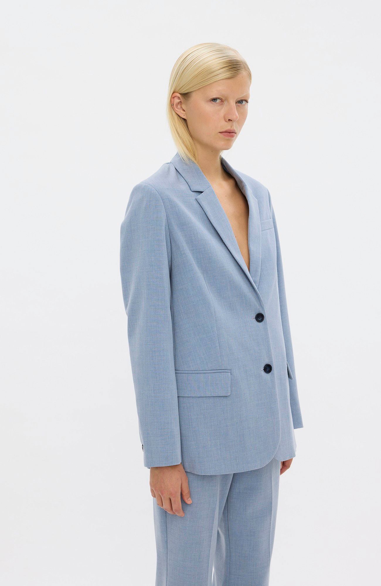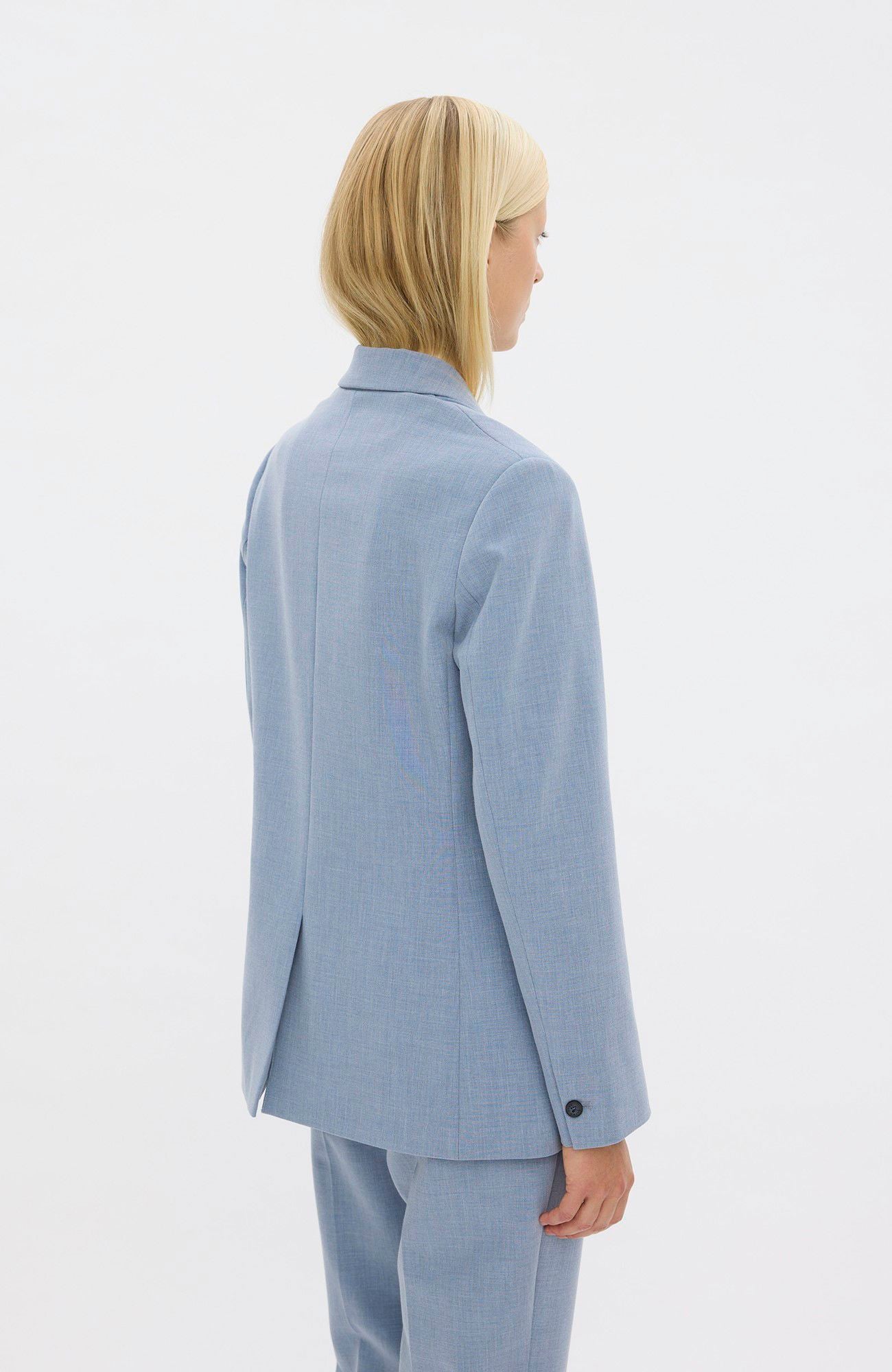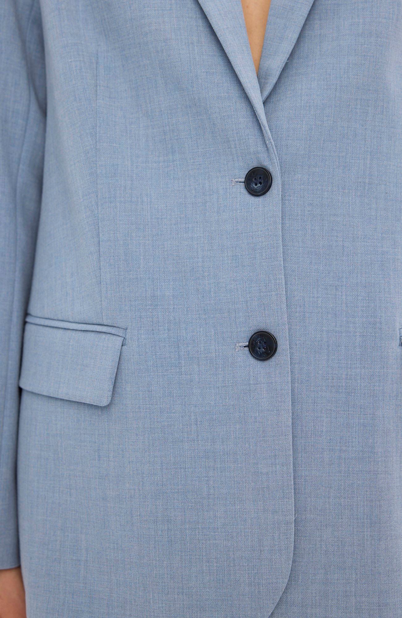 Hannahfv 826 Blazer Dawn Blue fra Five Units. Hannahfv 826 Blazer Dawn Blue er en elegant blazer med en rett passform og en enkeltspent silhuett. Designet har minimalistiske detaljer som logoknapper, en klassisk hakket jakkeslag, funksjonell brystlomme og frontlommer med klaff. Blazeren er formet med sidesømmer og myke skulderputer for en flatterende passform, mens en splitt bak gir ekstra bevegelsesfrihet. Perfekt for enhver anledning med sin tidløse og sofistikerte look. Normal i størrelsen.