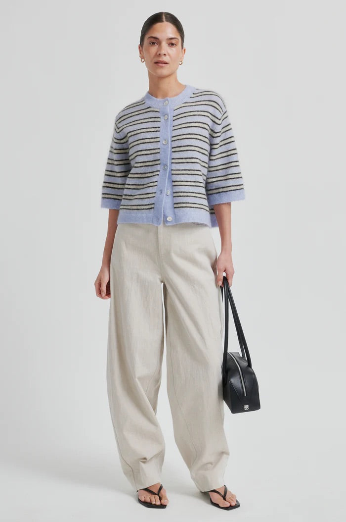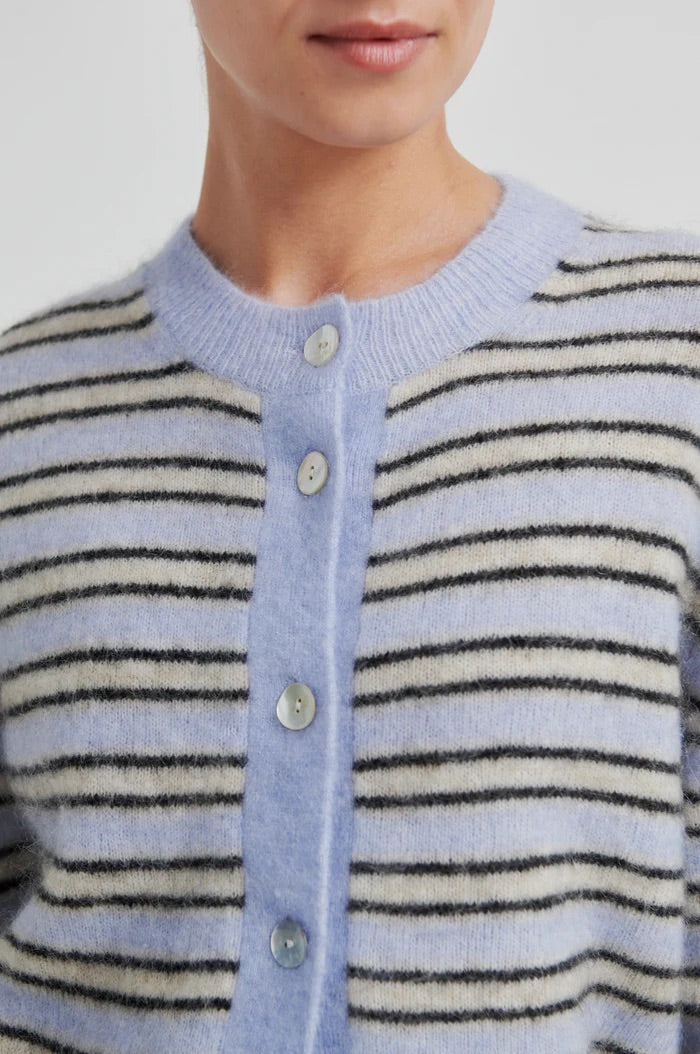 Stellar Knit Cardigan fra Second Female. Stellar Knit Cardigan er en myk og lett cardigan strikket i en fluffy mohair- og ullblanding med striper. Cardiganen har rund hals, knapper i front og ribbestrikkede kanter. Den korte ermelengden og den løse passformen gir et avslappet og moderne uttrykk. Normal i størrelsen.