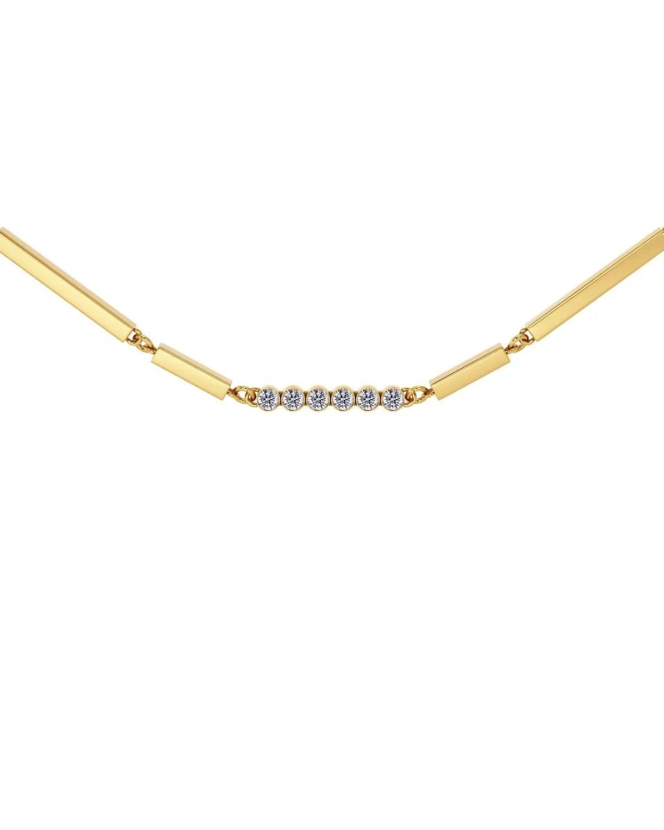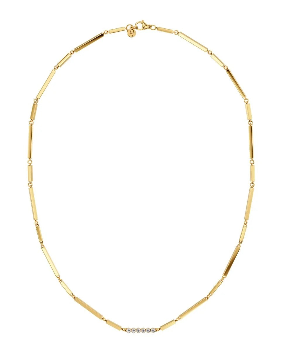 Twiggy Necklace Multi Gold fra Edblad. Twiggy-serien er et moderne uttrykk for Quiet Luxury – selvsikker, nedtonet og perfekt til både hverdag og fest. Dette multihalskjedet er inspirert av collier-stilen, der arkitektoniske barer i to ulike størrelser kombineres med seks glitrende kubiske zirkoner som beveger seg vakkert mot huden. Kjedet er laget i blankt 14K gullbelegg på rustfritt stål, er nikkeltrygt og vannbestandig.