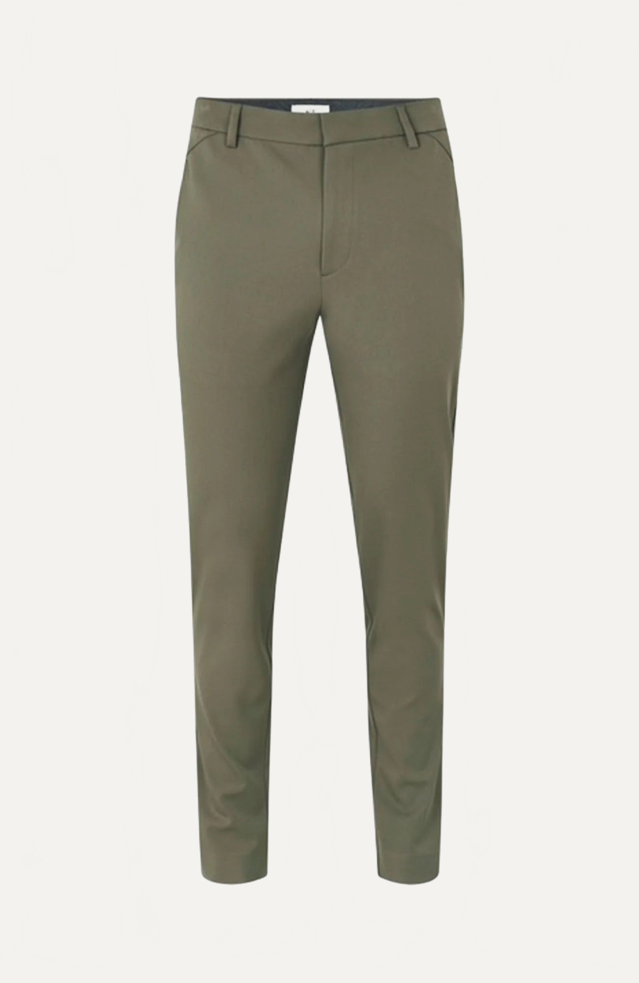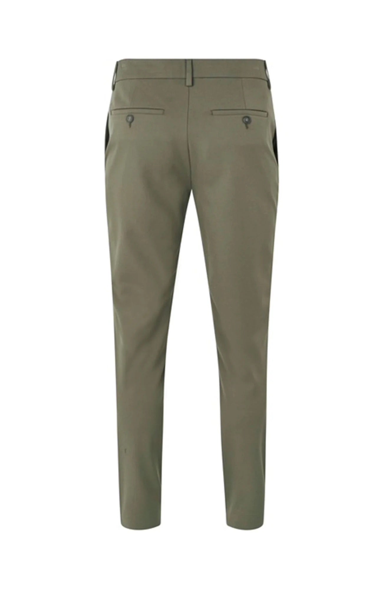 Josh 805 Smokey Olive fra Plain. JoshPL 805 er slim-fit bukser med klassisk silhuett, mid-waist og regular lengde. Buksen har skjult krok- og glidelåslukking, skrålommer foran, paspolerte baklommer og beltestropper, med små trekantede innsatser under linningen for en gjennomtenkt finish. Normal i størrelsen.
