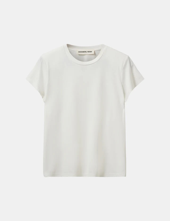 Modena Tee fra Designers Remix. Modena Tee er en elegant t-skjorte laget av myk og eksklusiv viskose som føles luksuriøs mot huden. De strukturerte skulderputene gir en skarp og selvsikker silhuett, perfekt for en sofistikert og allsidig stil. Den avslappede passformen gjør den enkel å style til både hverdags- og festantrekk. Normal i størrelsen.