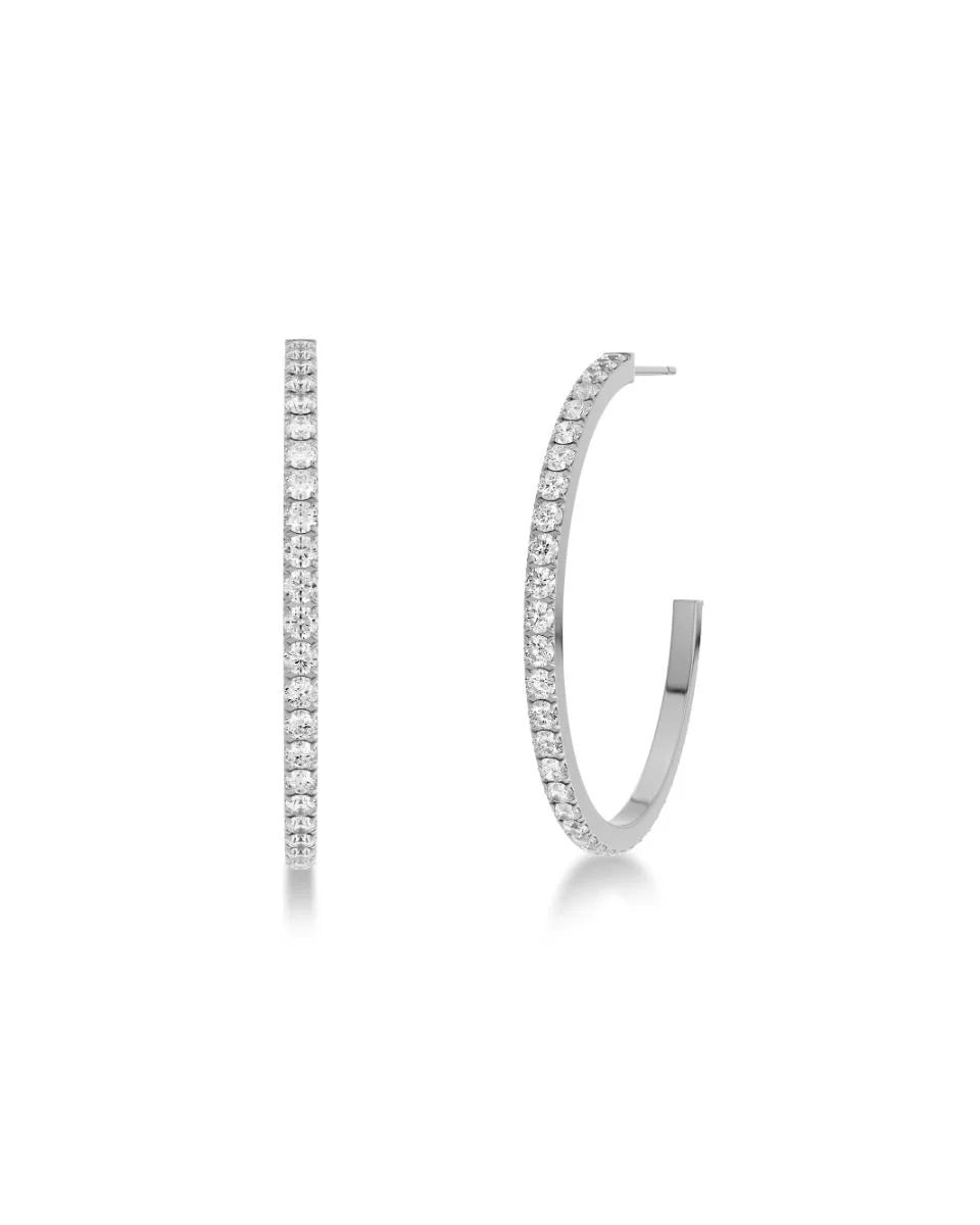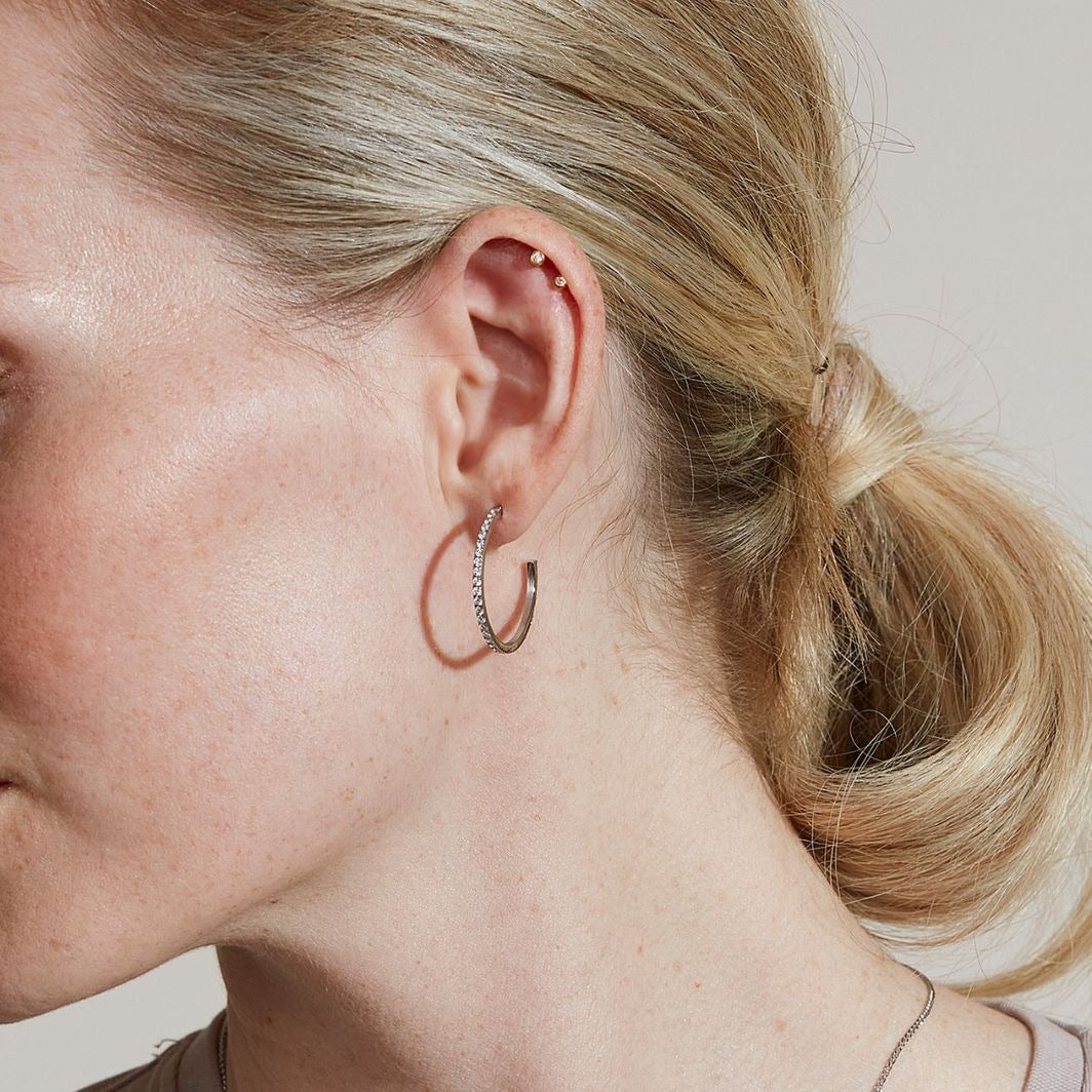 Glow Creoles Mini L Steel fra Edblad. Tynne creoler med glitrende kubisk zirkonia rundt hele utsiden. Den blanke overflaten i rustfritt stål gir et elegant uttrykk, og størrelsen L gjør dem allsidige til både hverdagsbruk og fest.