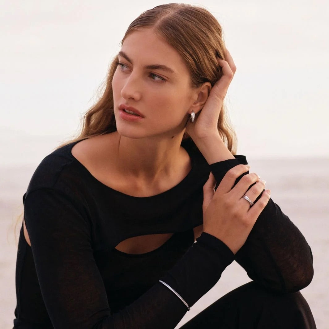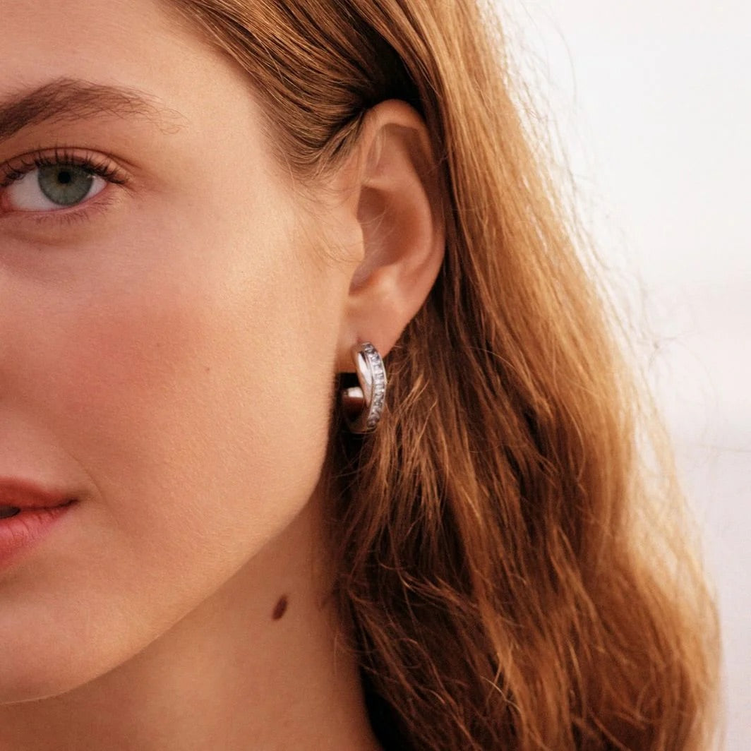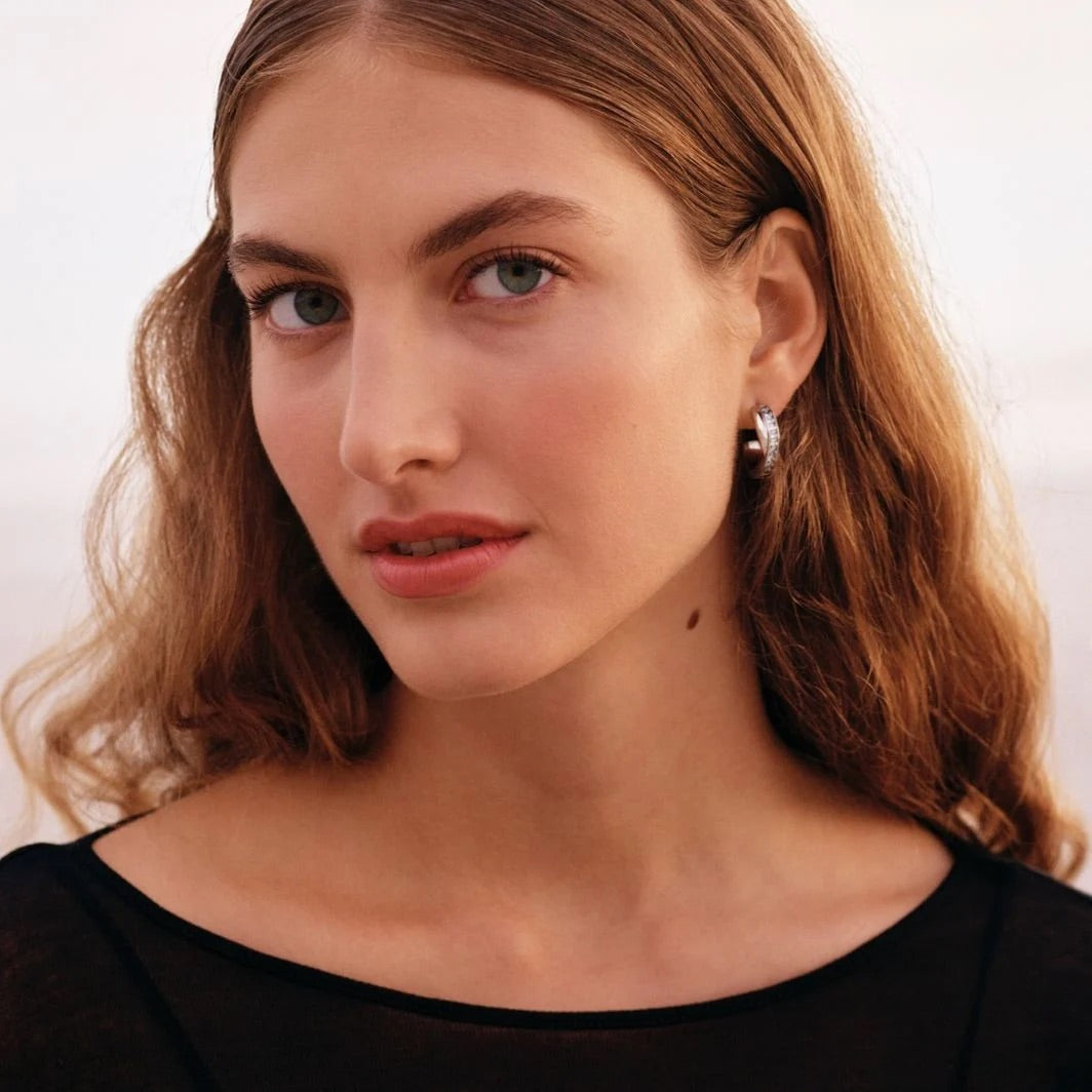 Andorra Creoles Duo L Steel fra Edblad. Store creoler med to avrundede skinner viklet rundt hverandre – én med klare kubisk zirkonia og én uten – som gir et elegant og balansert uttrykk. En tidløs modell som passer til alle anledninger og er en populær gave.