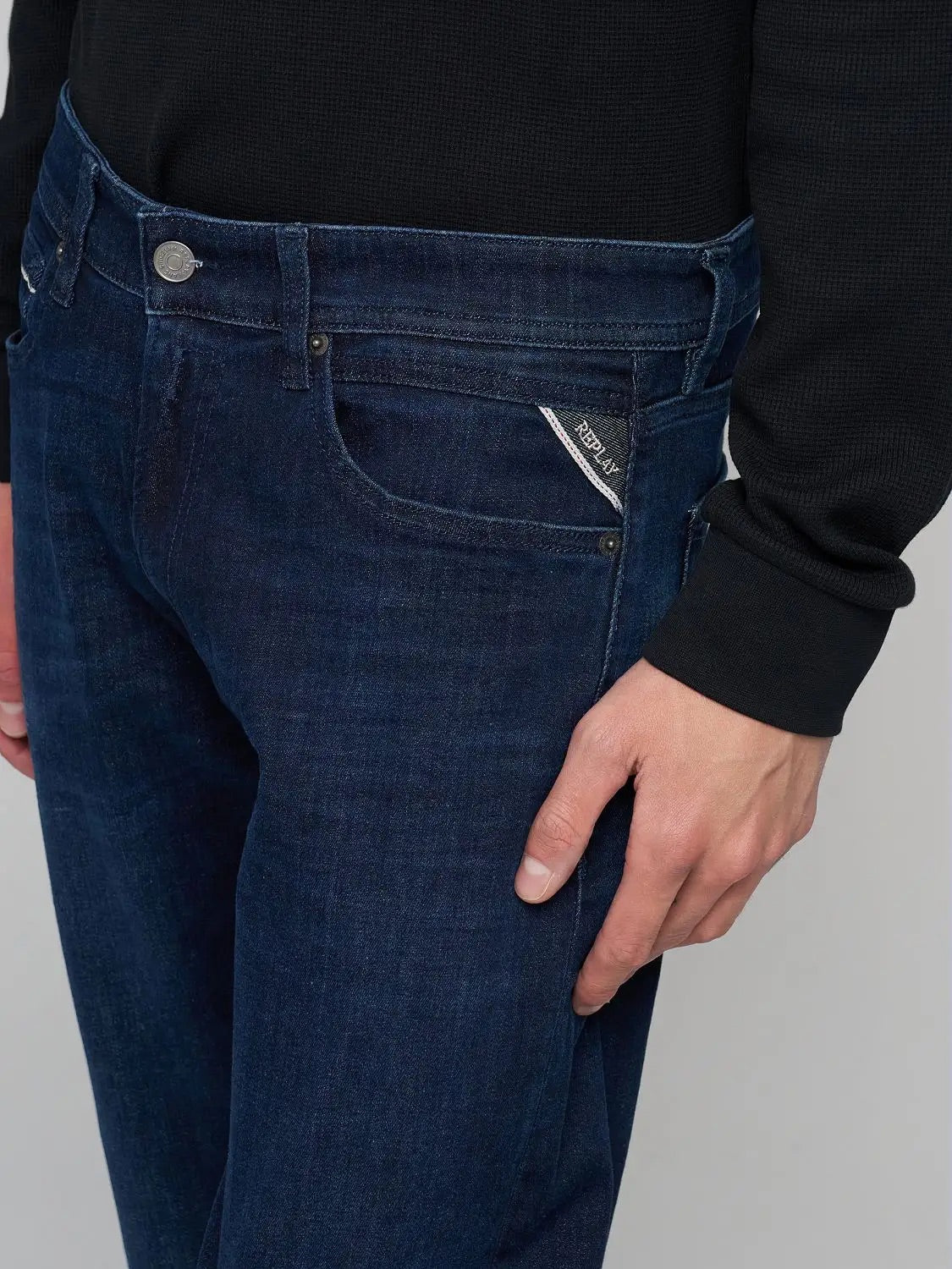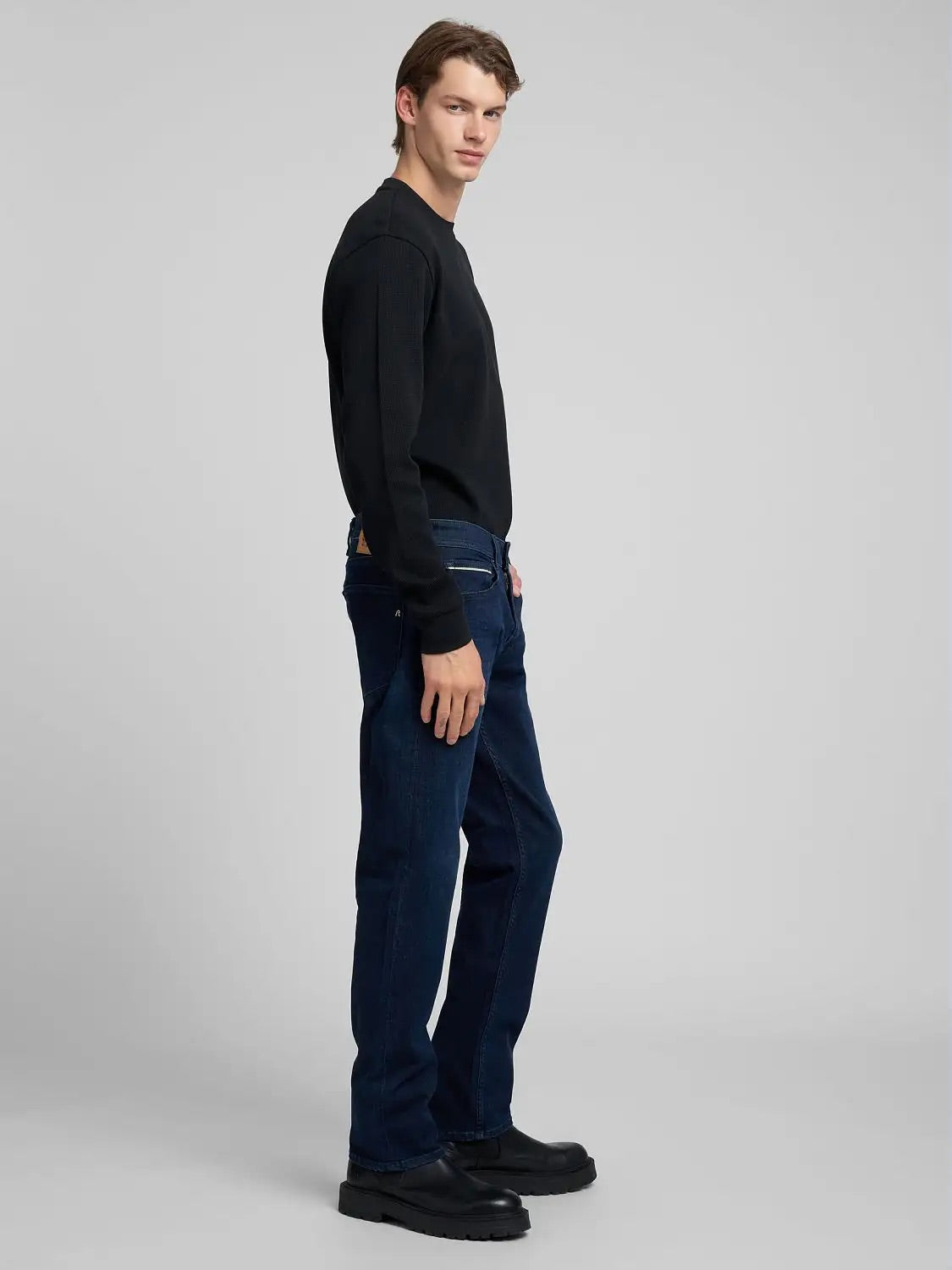 Grover MA972Z.41A781 jeans fra Replay. Grover MA972Z.41A781 Jeans er en klassisk straight-fit jeans med vanlig midje og rette ben som gir en komfortabel passform. Laget i 11 oz indigo stretch-bomullsdenim, kombinerer den slitestyrke med bevegelighet for god komfort hele dagen. Jeansene har fem lommer og lukkes med glidelås og knappefeste, og er normal i størrelsen – et tidløst og allsidig valg til hverdagsbruk.