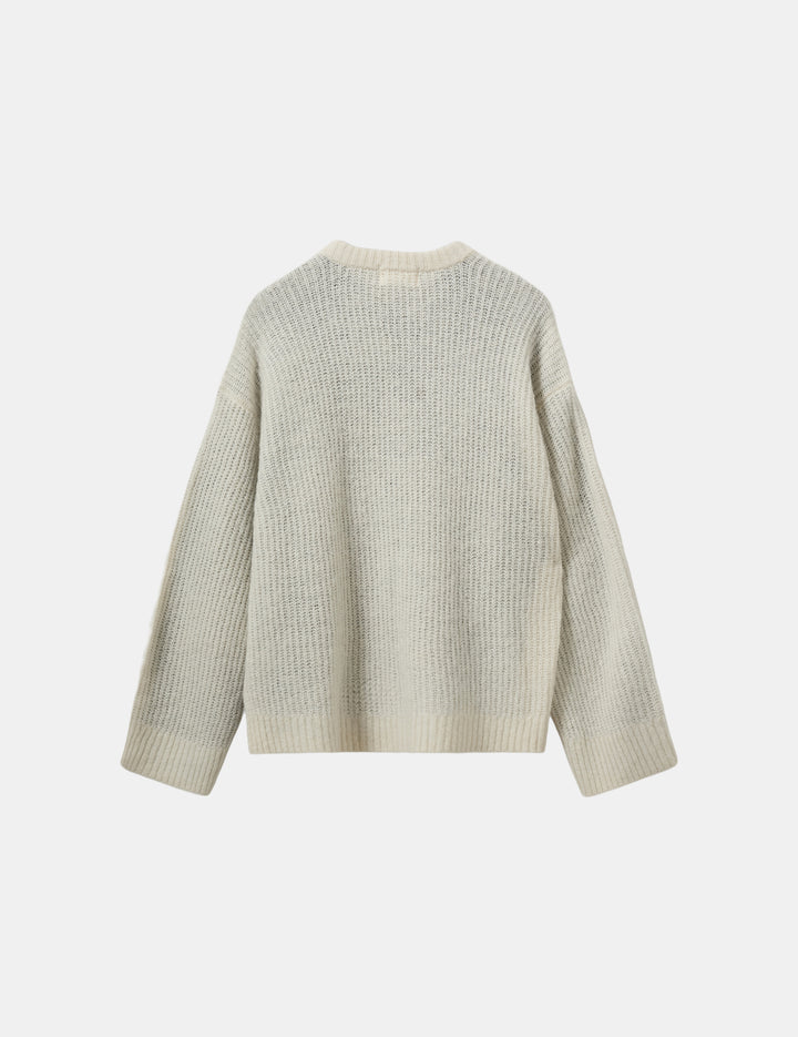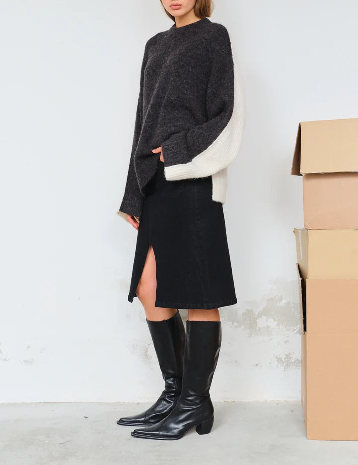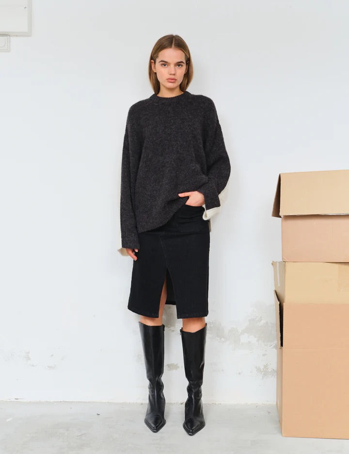 Verona Mix Sweater fra Designers Remix. Verona Mix Sweater er en myk og moderne strikkegenser med et unikt tofarget design. Forsiden kommer i en klassisk grå melering, mens baksiden er i en myk creamfarge – en stilig kontrast som gir genseren et løst, men gjennomført preg. Modellen har en avslappet passform med vide ermer og faller pent over kroppen. Den passer perfekt til både hverdag og jobb, og kan styles med både jeans og skjørt. Normal i størrelsen.