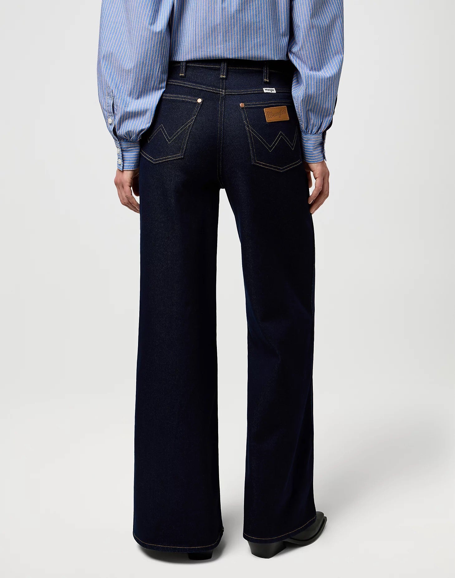 WranglerCanyon Loose Jeans fra Wrangler. Canyon Jeans er en retroinspirert jeans med en moderne passform designet med høyt liv, en figurnær passform over hoftene og vide, A-formede ben som gir en flatterende silhuett med et hint av 70-tallsstil. Laget i myk denim med lett stretch, gir den god bevegelighet og komfort hele dagen – uten å miste formen. Jeansen har klassiske detaljer som 5-lommers design, liten myntlomme, glidelås med knappelukking, syv beltehemper og signaturelementer som "W"-søm på baklommene og et lyst cognacfarget lærpatch. Normal i størrelsen.