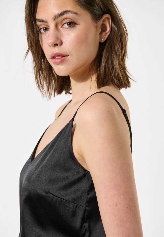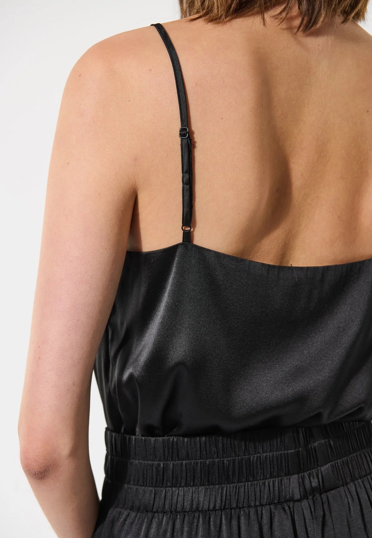 Octavie Top fra Dea Kudibal. Octavie Top er en tidløs og allsidig topp som passer perfekt i enhver garderobe. Denne klassiske varianten i sort silke har en regulær passform og justerbare spaghetti-stropper for en optimal og behagelig tilpasning. Toppen er halvt fôret i samme stoff, noe som gir en eksklusiv og luksuriøs følelse. Normal i størrelsen.