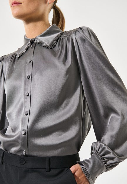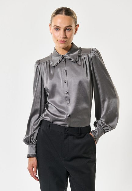 Dea KudibalUma Blouse fra Dea Kudibal. Uma Blouse er en tidløs og elegant skjorte i silke, med delikate detaljer som gjør den helt spesiell. Små folder i porselenshvit rammer inn kragen og mansjettene, og skaper et vakkert uttrykk. Passformen er klassisk og rett, med fulle ermer som gir plagget en avslappet og feminin eleganse. Blusen er laget i en eksklusiv stretch-silk twill, en myk og luksuriøs kvalitet bestående av 90% silke og 10% elastan, som gir både komfort og en nydelig glans. Uma Blouse passer like godt til jobb som til middag, og er et allsidig plagg du vil bruke igjen og igjen. Normal i størrelsen.
