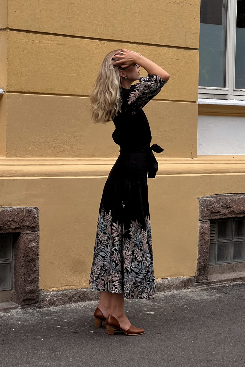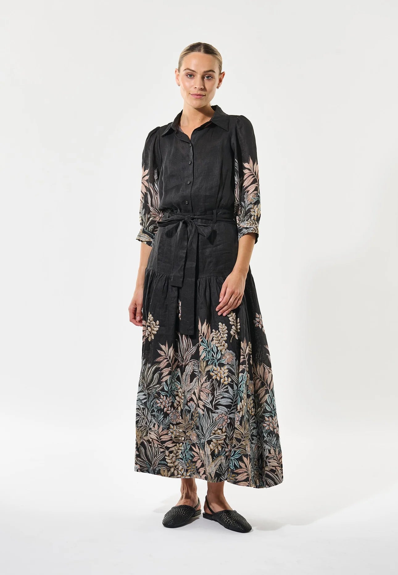 Palma Dress fra Dea Kudibal. Palma Dress er en nydelig linkjole med et delikat mønster som gir et eksklusivt uttrykk. Kjolen har 3/4-lange ermer og et belte i livet som fremhever midjen og gir en flatterende silhuett. Den klassiske skjortekragen og knappene øverst i front tilfører kjolen et stilrent preg. Palma Dress er laget i en lett og luftig linkvalitet – perfekt for varme dager. Normal i størrelsen.