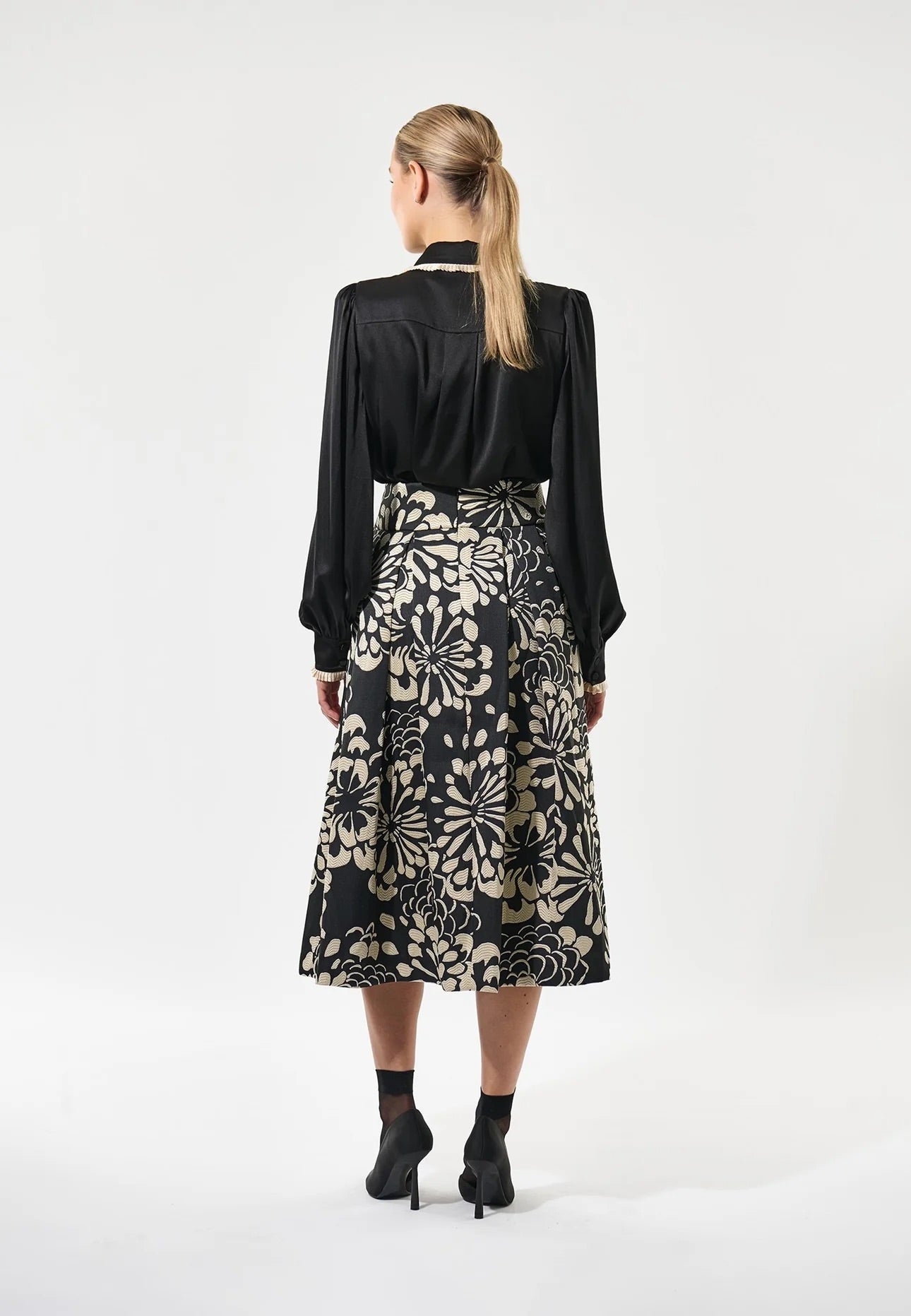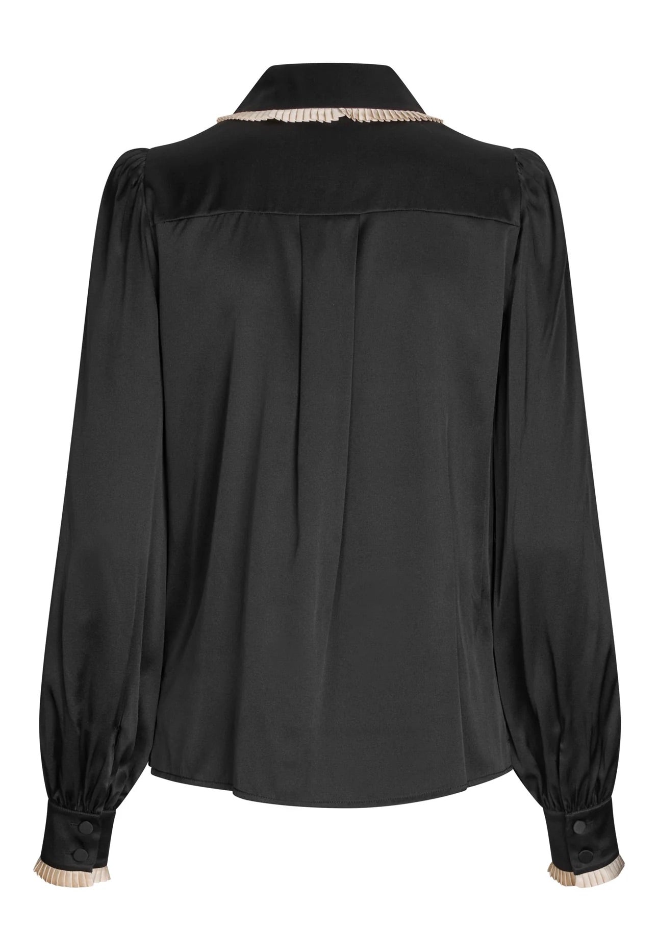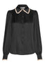 Dea KudibalUma Blouse fra Dea Kudibal. Uma Blouse er en tidløs og elegant skjorte i sort silke, med delikate detaljer som gjør den helt spesiell. Små folder i porselenshvit rammer inn kragen og mansjettene, og skaper et vakkert uttrykk. Passformen er klassisk og rett, med fulle ermer som gir plagget en avslappet og feminin eleganse. Blusen er laget i en eksklusiv stretch-silk twill, en myk og luksuriøs kvalitet bestående av 90% silke og 10% elastan, som gir både komfort og en nydelig glans. Uma Blouse passer like godt til jobb som til middag, og er et allsidig plagg du vil bruke igjen og igjen. Normal i størrelsen.