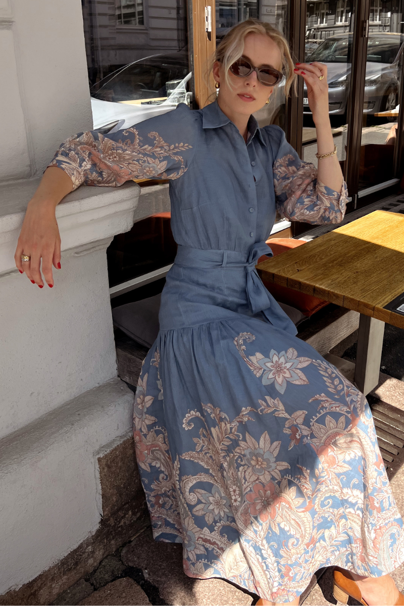 Palma Dress fra Dea Kudibal. Palma Dress er en nydelig linkjole med et delikat mønster som gir et eksklusivt uttrykk. Kjolen har 3/4-lange ermer og et belte i livet som fremhever midjen og gir en flatterende silhuett. Den klassiske skjortekragen og knappene øverst i front tilfører kjolen et stilrent preg. Palma Dress er laget i en lett og luftig linkvalitet – perfekt for varme dager. Normal i størrelsen.