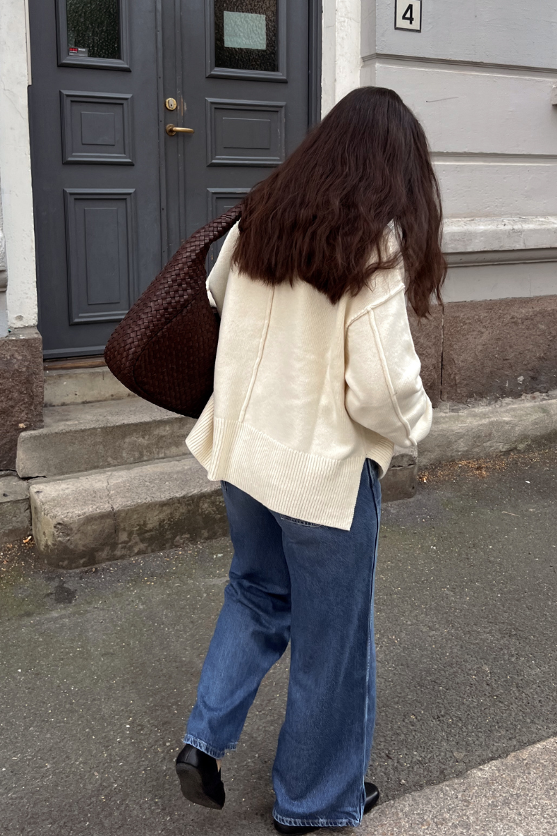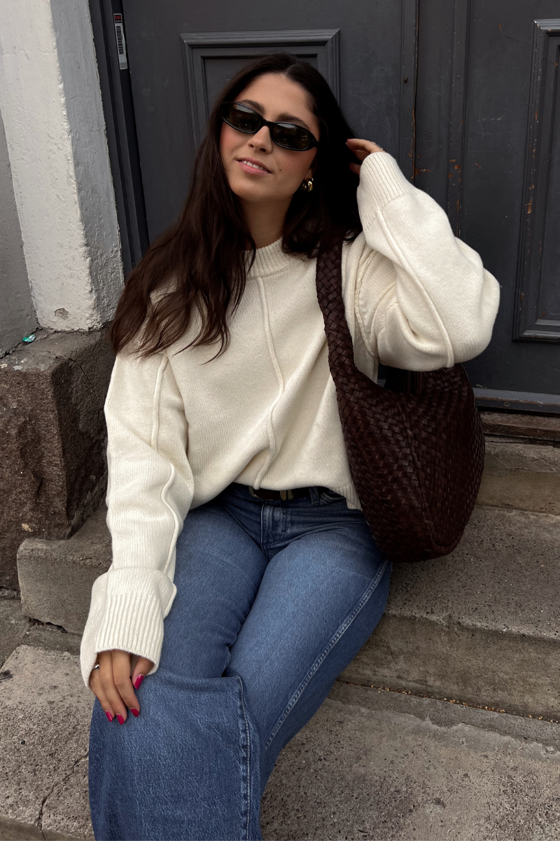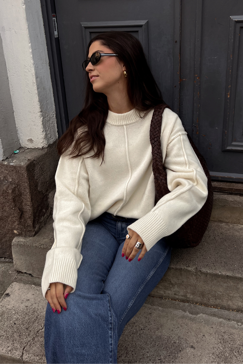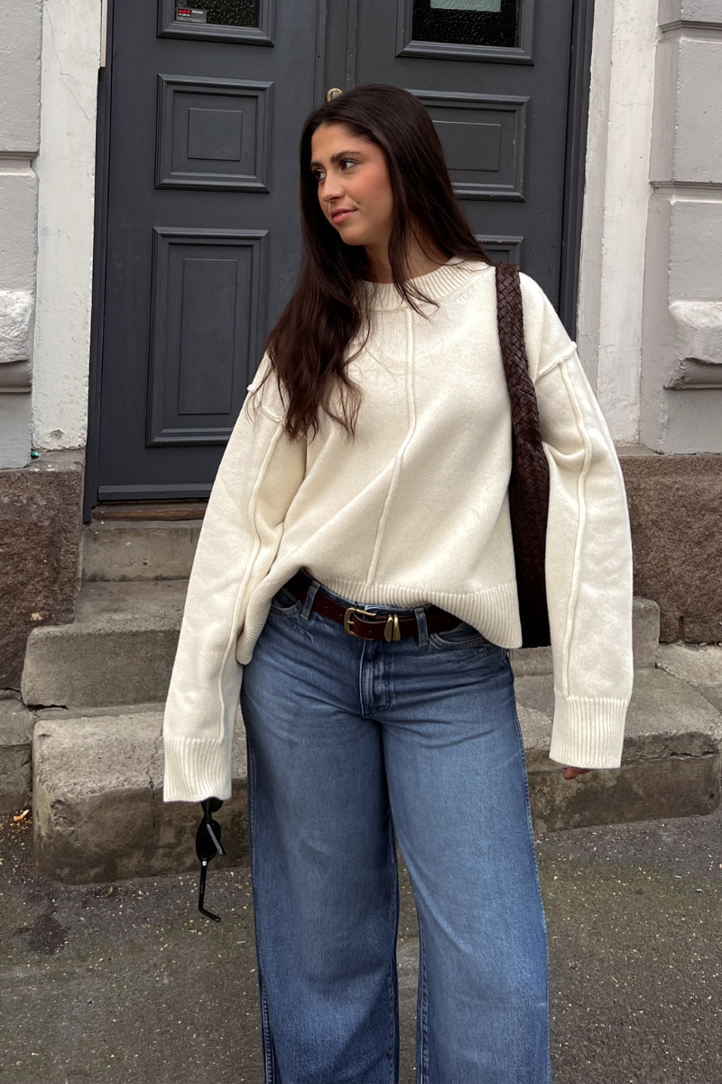 Ren Sweater fra Arnie Says. Ren Sweater er en chunky strikkegenser i en kompakt og myk ullblanding – perfekt for kalde dager. Den er designet med rund hals, dekorative vrangsømmer og nedfalne skuldre som gir et avslappet uttrykk. Splitter i sidene og en noe lengre bakside. Genseren har ribbestrikkede kanter på hem, mansjetter og hals, og kommer i en rett og romslig fasong som gjør den enkel å style til både bukser og skjørt. Normal i størrelsen.