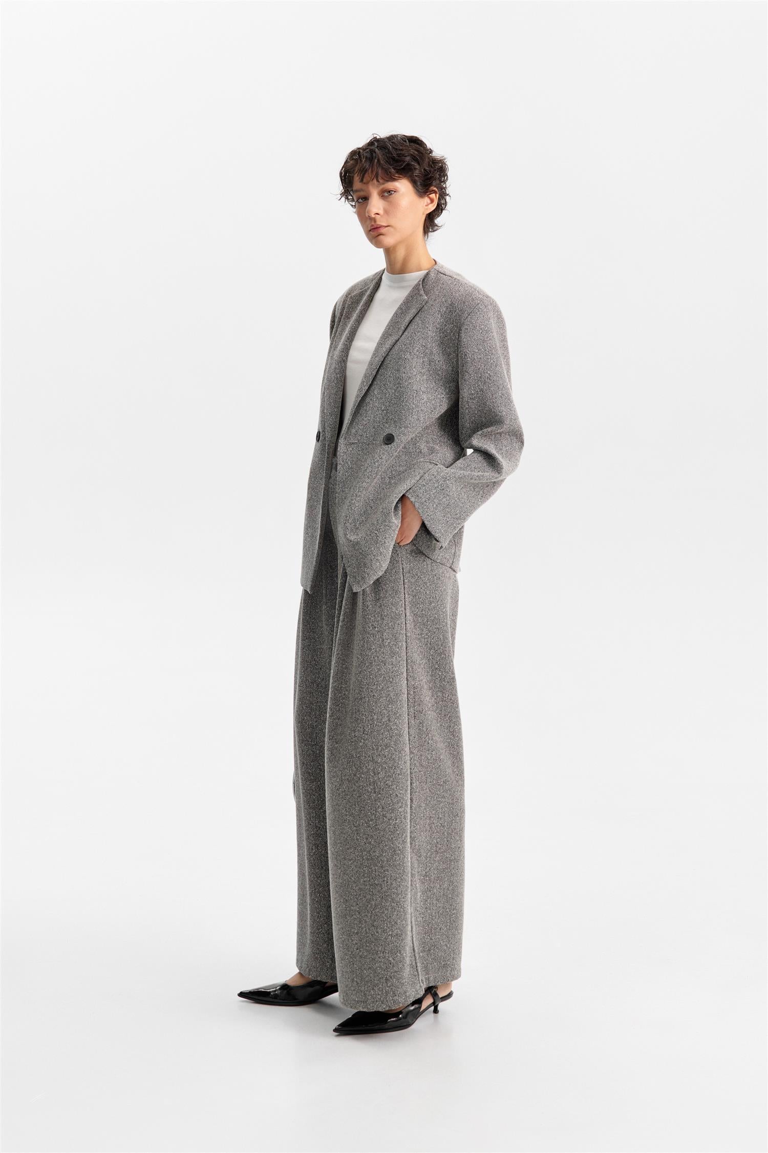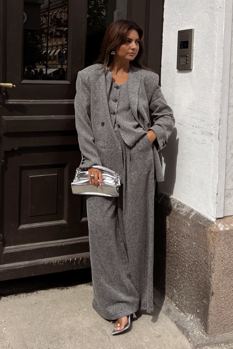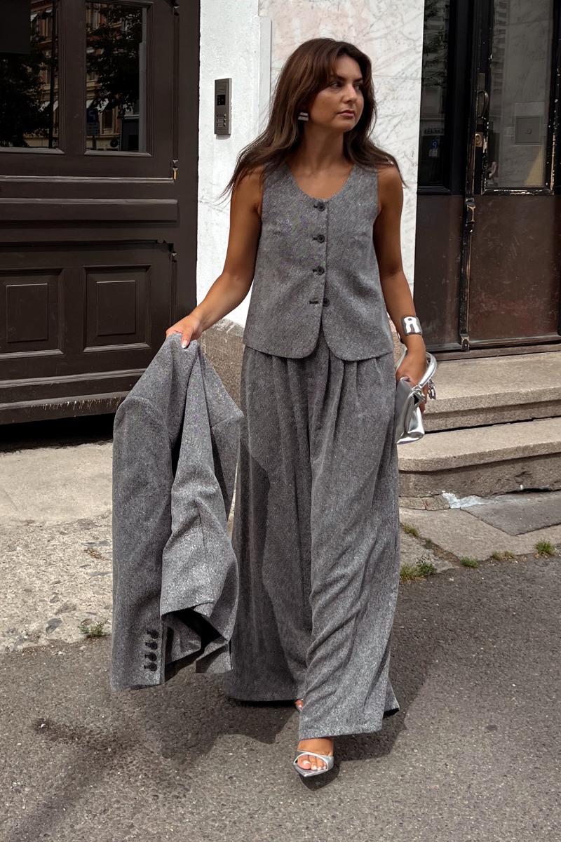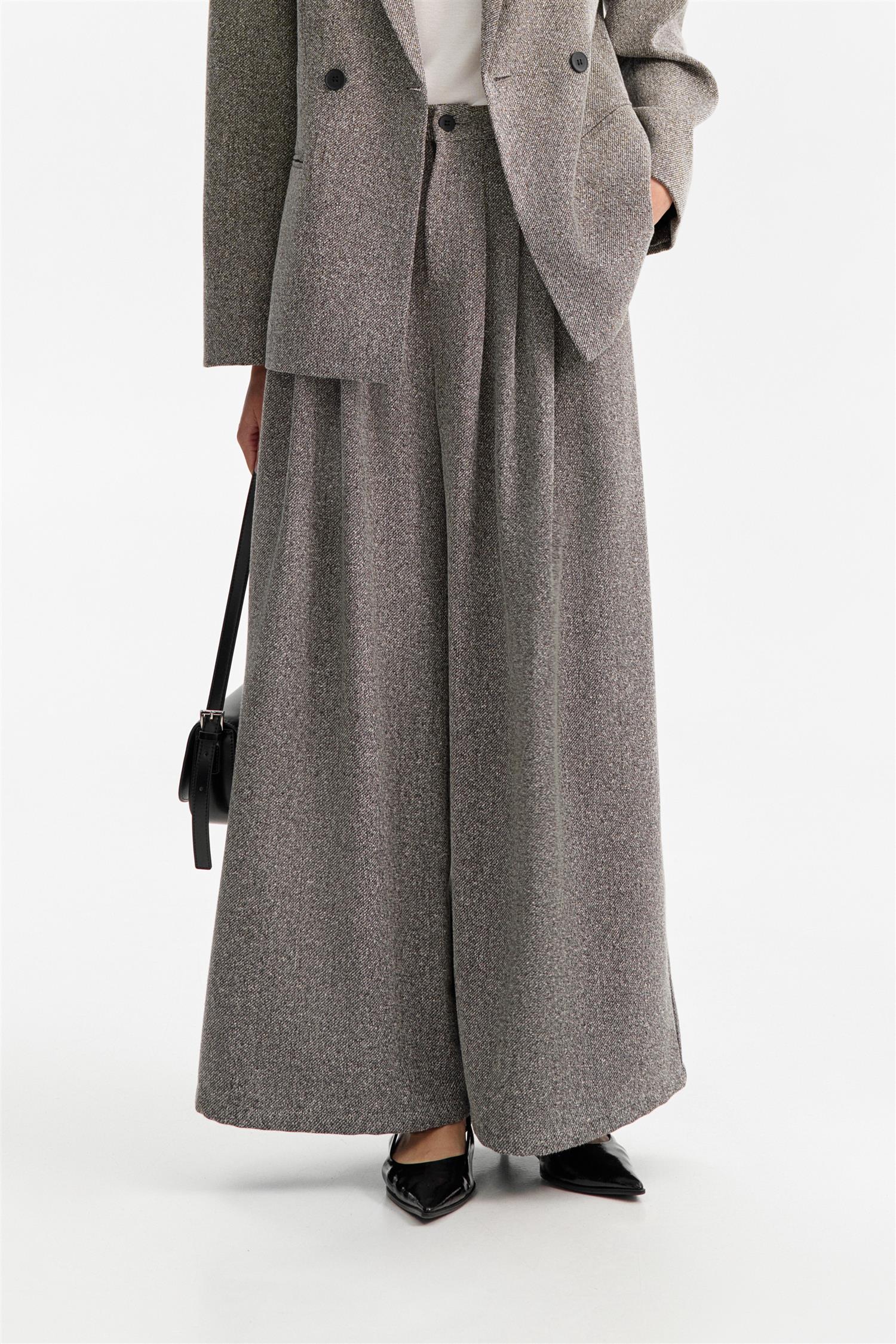 Structured Pants fra Eleh. Trendy og allsidige bukser i en vid modell designet med sidelommer, legg foran og klassisk lukking med knapp og glidelås. Perfekte å bruke alene for en avslappet stil, eller sammen med matchende vest og blazer for et komplett og gjennomført antrekk. Normal i størrelsen.